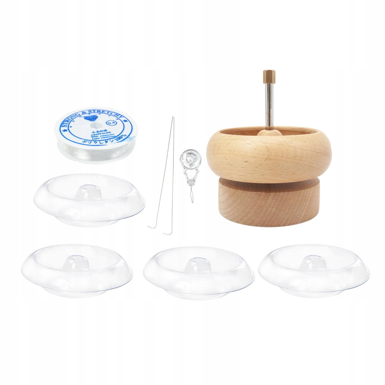 В комплект входят 9 предметов: 1 деревянная бусина, 4 чашечки для бусин, 2 булавки для бусин, 1 нитевдеватель, 1 нить для бусин