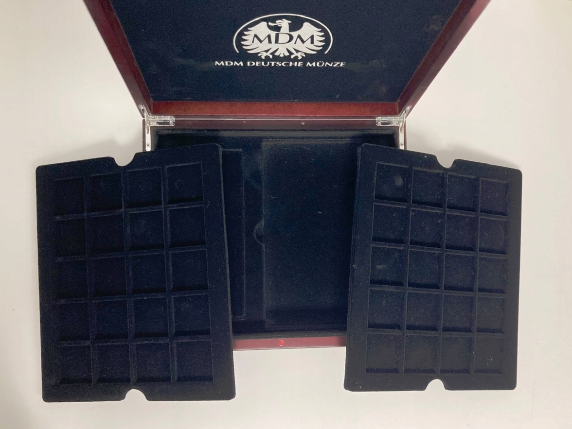 Коробка содержит 2 подноса с пространством для 20 монет. Размеры отверстия: 40x40 мм. В нижней части подноса с более широким местом