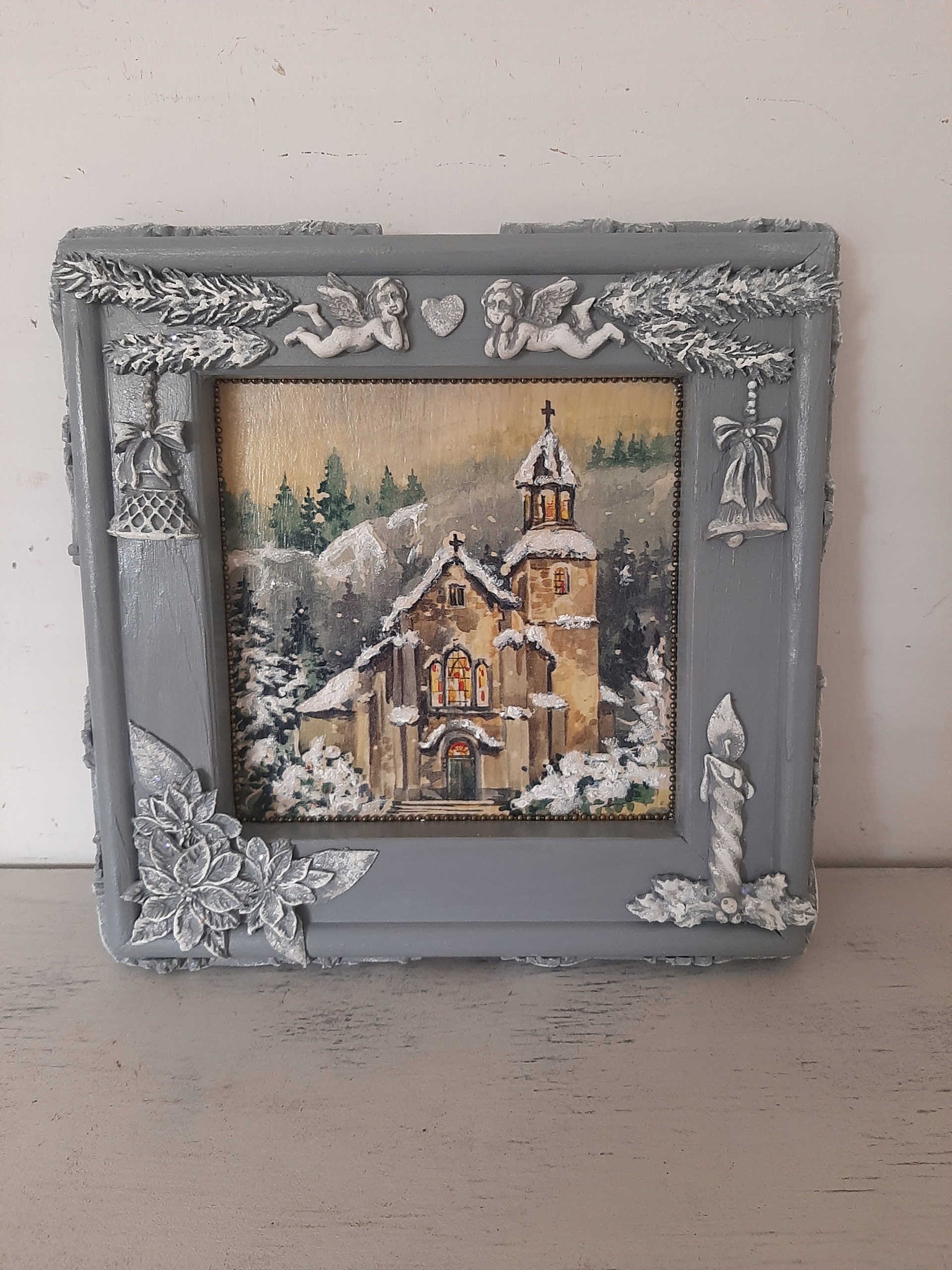 Деревянная картина с рождественским мотивом в декорированной рамке размером 20см х 20см.
