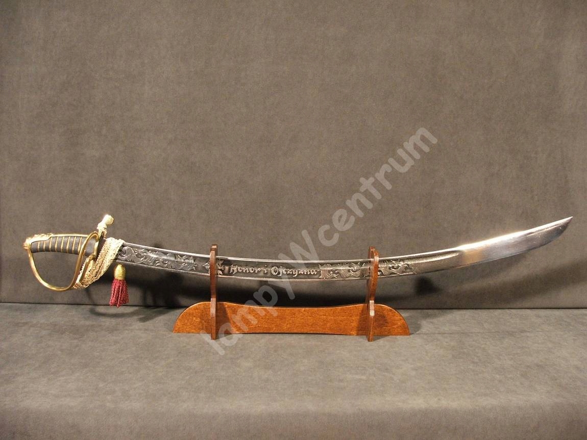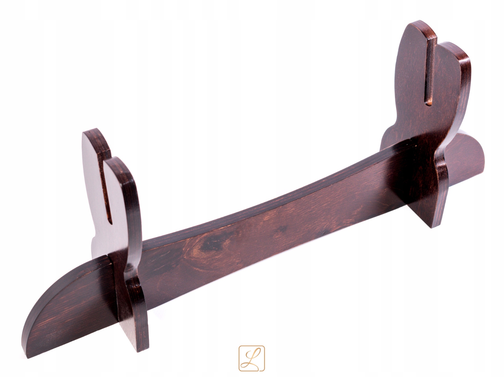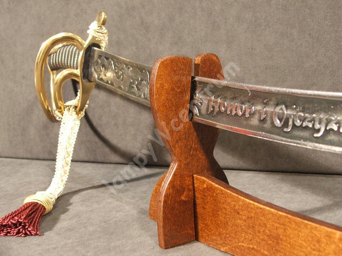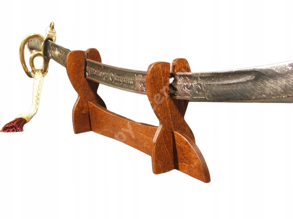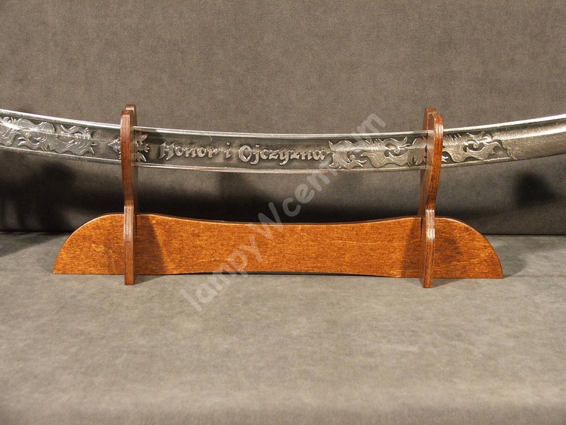 новый, изготовленный из фанеры, окрашенной и лакированной универсальной подставки для всех видов белого оружия. Предмет, произведенный в Польше. Канавки для головы, шириной 9 мм, были разрезаны под углом - небольшая деталь, которая обеспечивает отличный эффект!