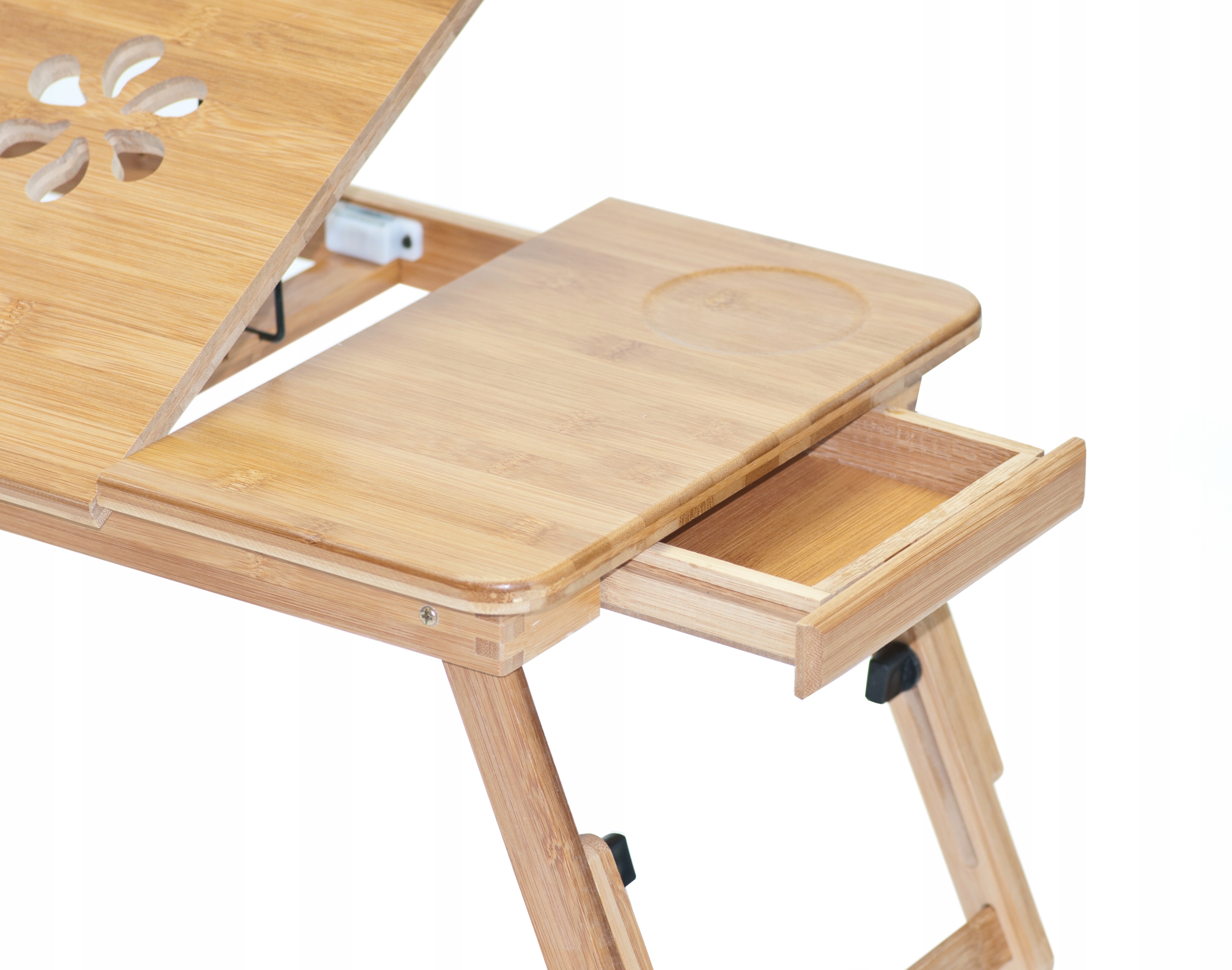 Деревянная конструкция стола приподнимает ноутбук над поверхностью, что улучшает циркуляцию воздуха и снижает риск перегрева устройства. Это увеличивает время автономной работы и комфорт работы.