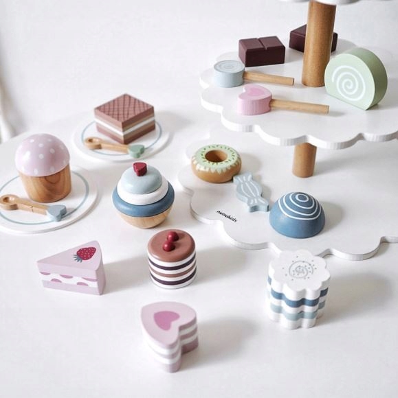 - набор состоит из 24 элементов (кексы, леденцы, конфеты, пирожные, тарелки, ложки)