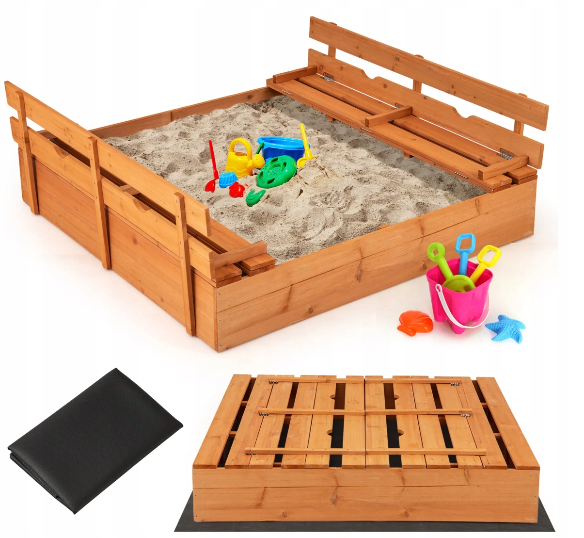 ДЕРЕВЯННАЯ ПЕСОЧНИЦА С ПОКРЫТИЕМ И САДОВЫМИ СКАМЬЯКАМИ ДЛЯ ДЕТЕЙ