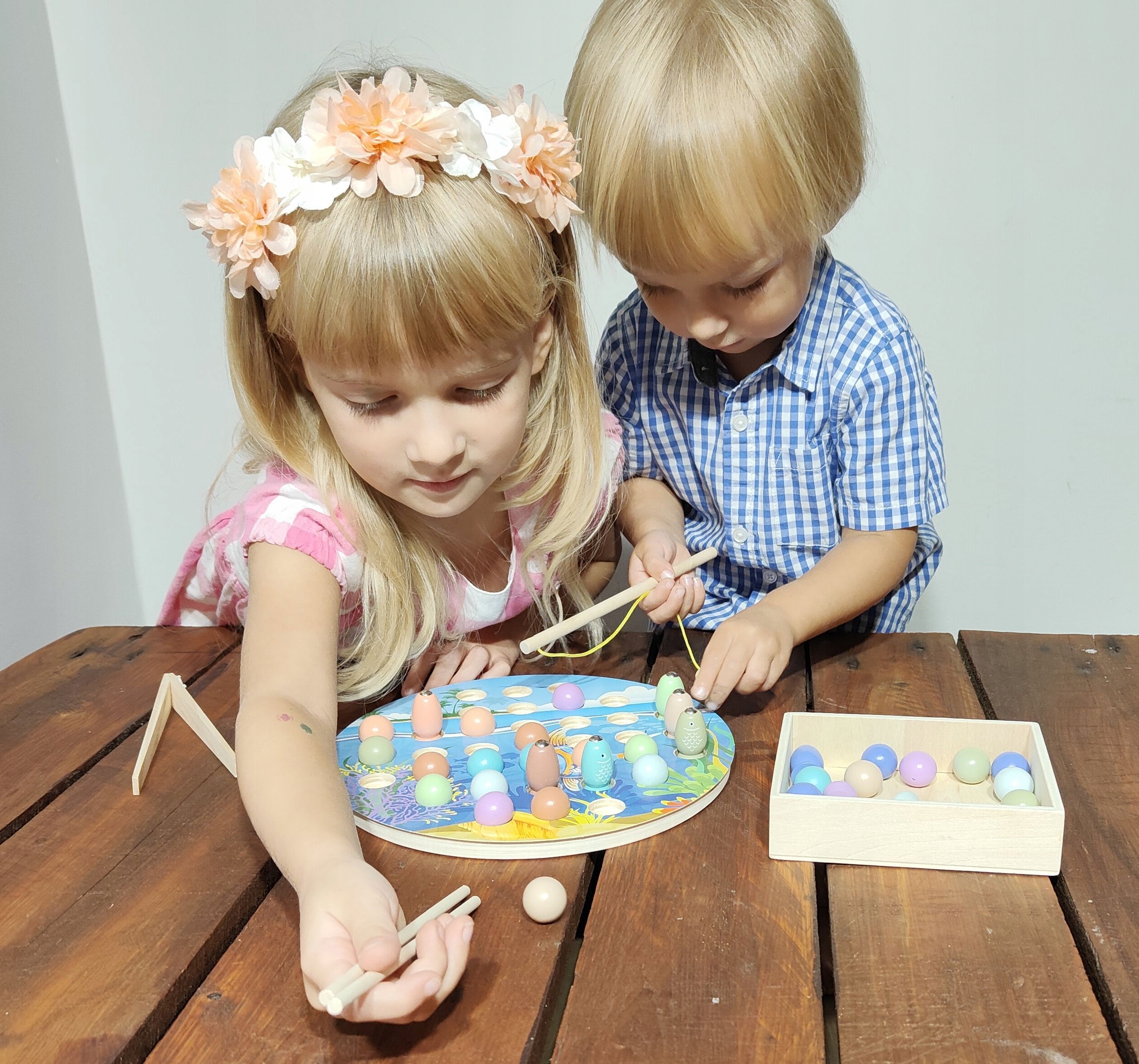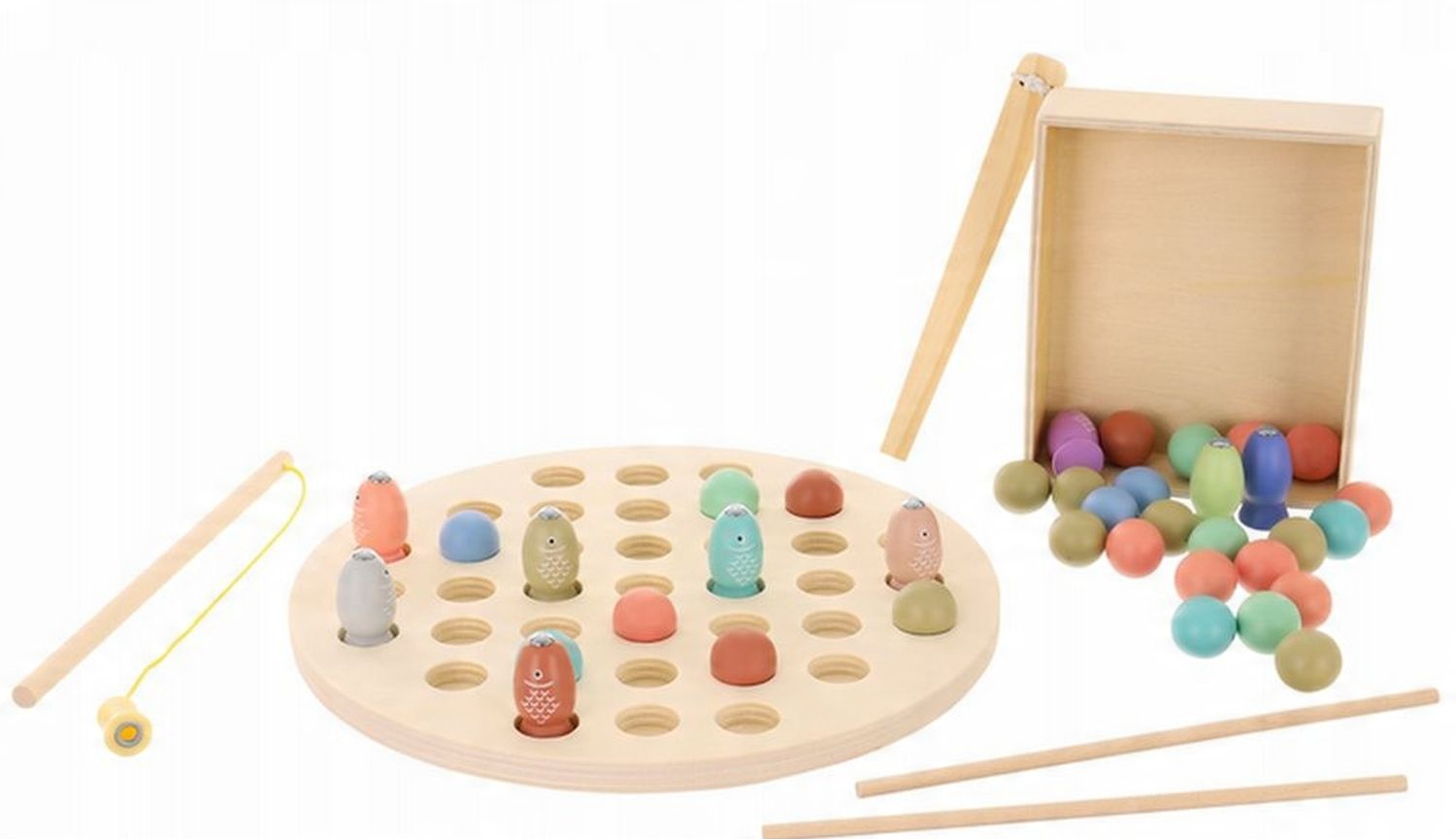 Все детали изготовлены из древесины с высоким качеством, тщательно отполированы и имеют гладкие округлые края для предотвращения брызг. Они также очень легкие и просты в использовании. Каждая рыба может быть комфортно размещена в маленькой ручке и скрыта в ящике для сортировки. подражает пруду!