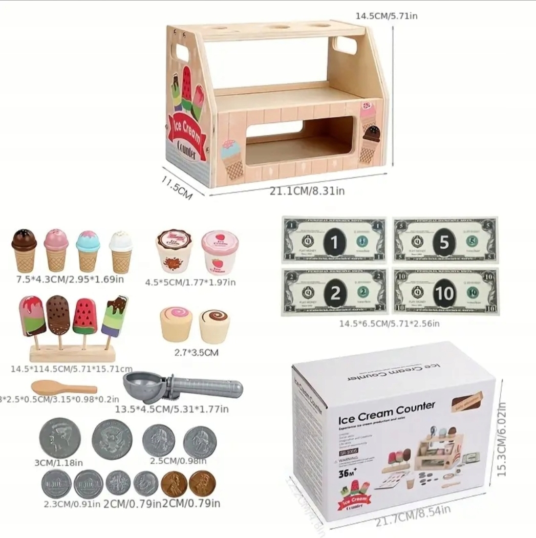 Веселье с мороженым развивает воображение, навыки подсчета, логическое мышление и общение. Ребенок может сыграть роль продавца, клиента и даже кондиционера - возможности не ограничены! Набор изготовлен из дерева, что гарантирует долговечность и безопасность использования.