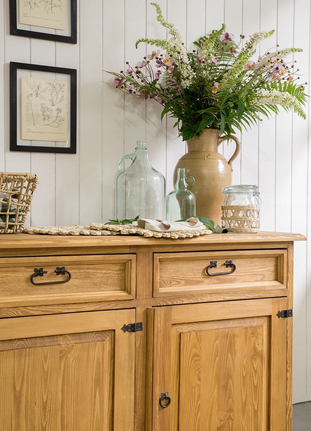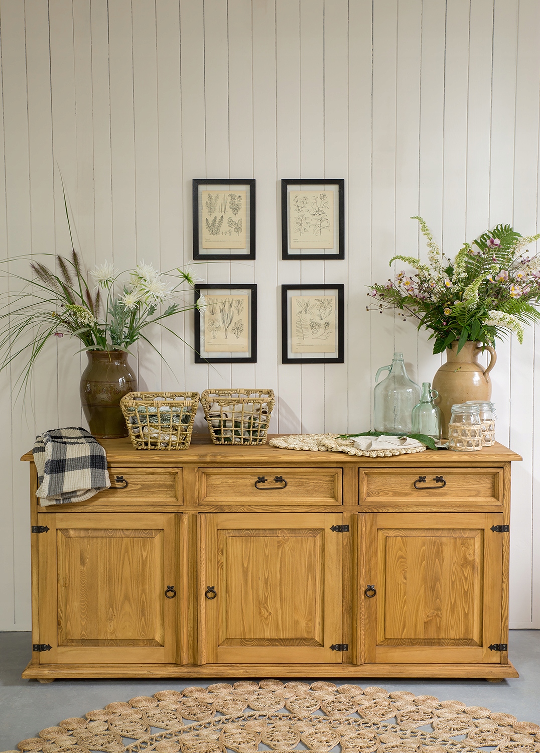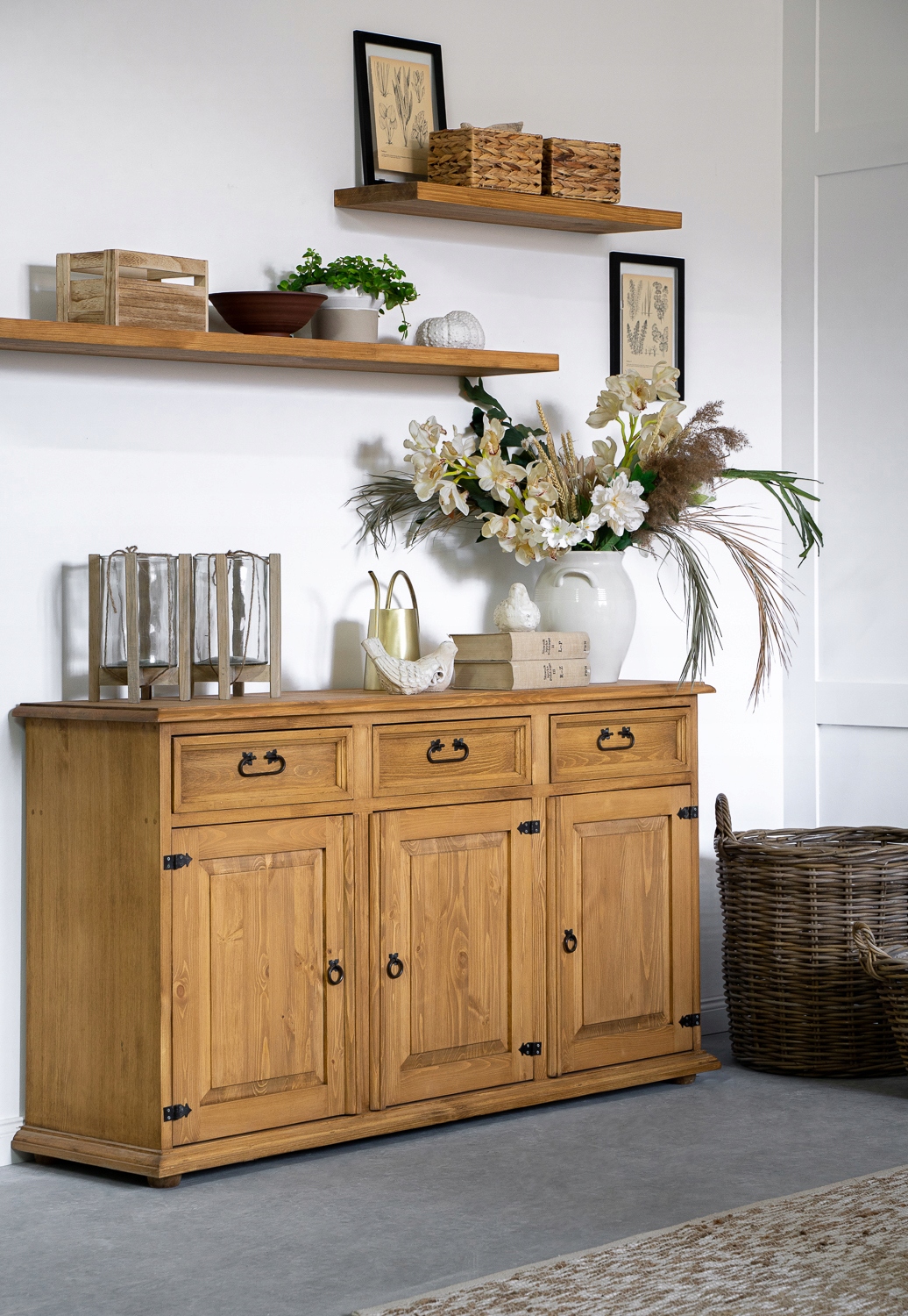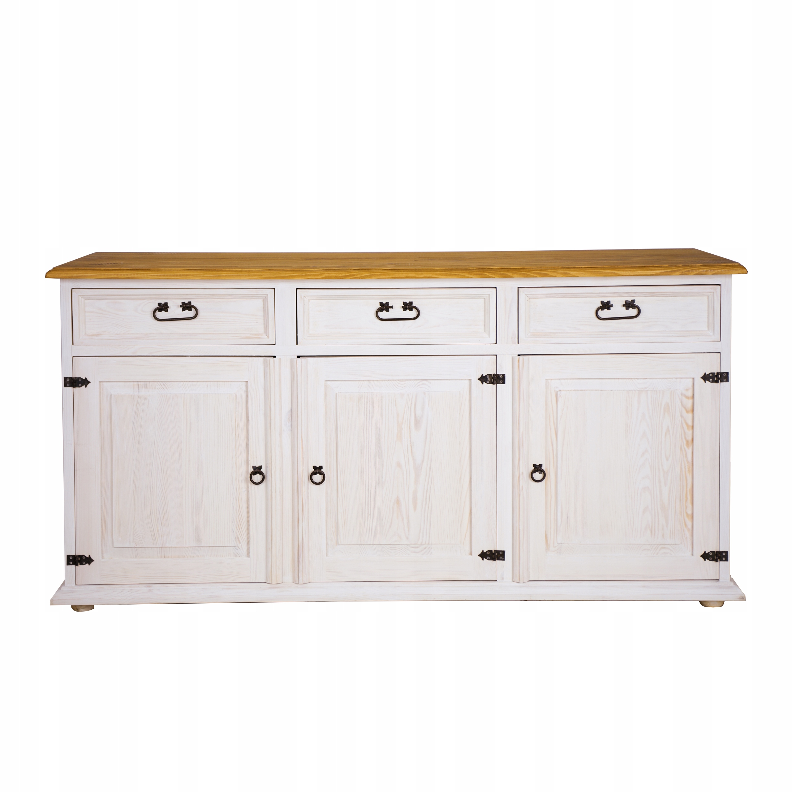 Сосновый комод состоит из трех вместительных ящиков, которые выдвигаются по деревянным направляющим. Разумеется, дно ящиков заполнено фанерой, а спинки отделаны цельным фетром. В нижней части, за тройными дверцами, расположена одна длинная полка по всей длине комода. Прежде всего, комод стоит на четырех сферических ножках, которые поддерживают всю конструкцию мебели. Сосновый комод из коллекции SLIM вдохновлен деревенским и провансальским стилем. Конечно, для него характерны красивые, ажурные стороны мебели.