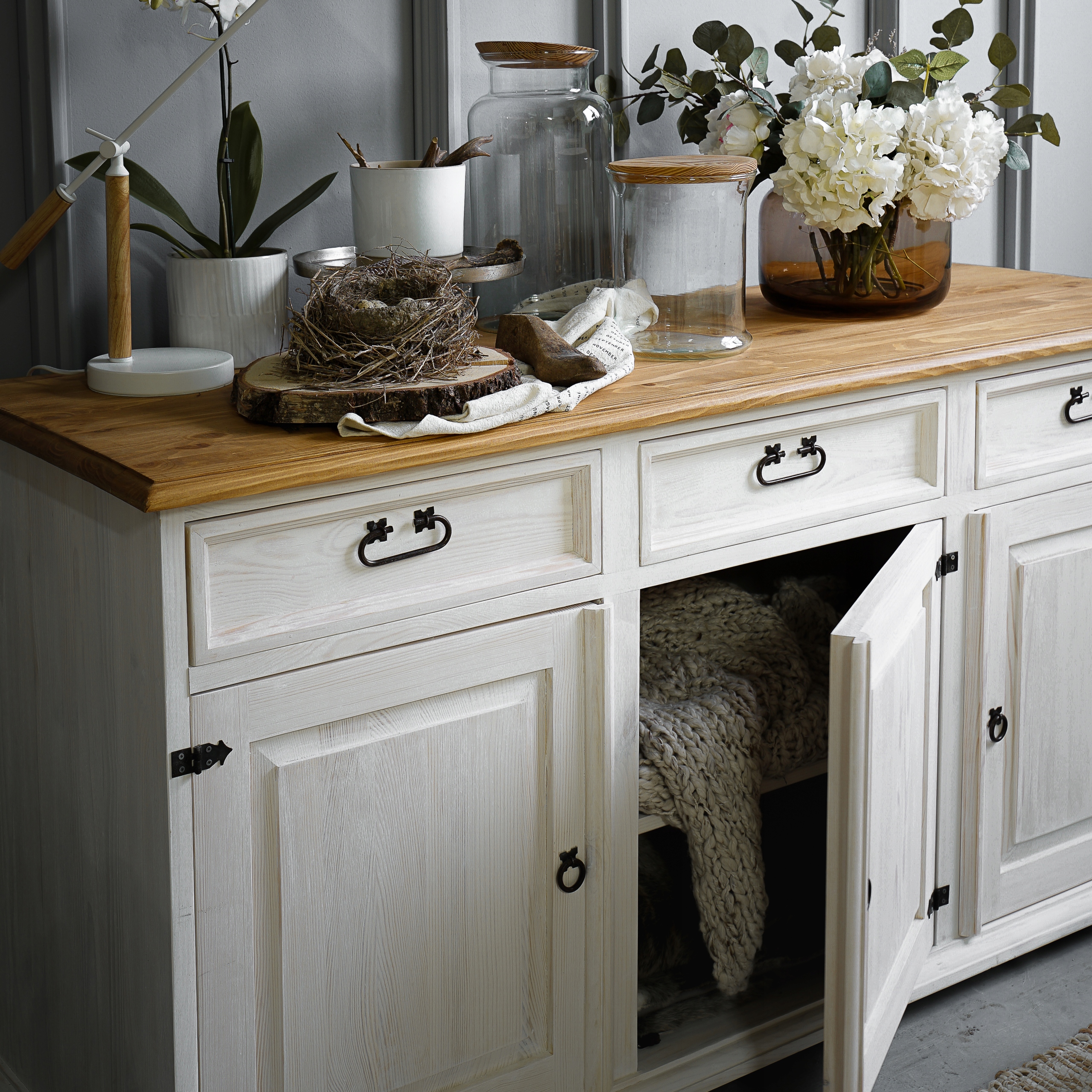 Комод в стиле рустик из коллекции Slim изготовлен из массива сосны. Дополнительно весь предмет мебели покрыт беленой краской, что делает весь предмет мебели матовым и придает помещению теплую и уютную атмосферу.