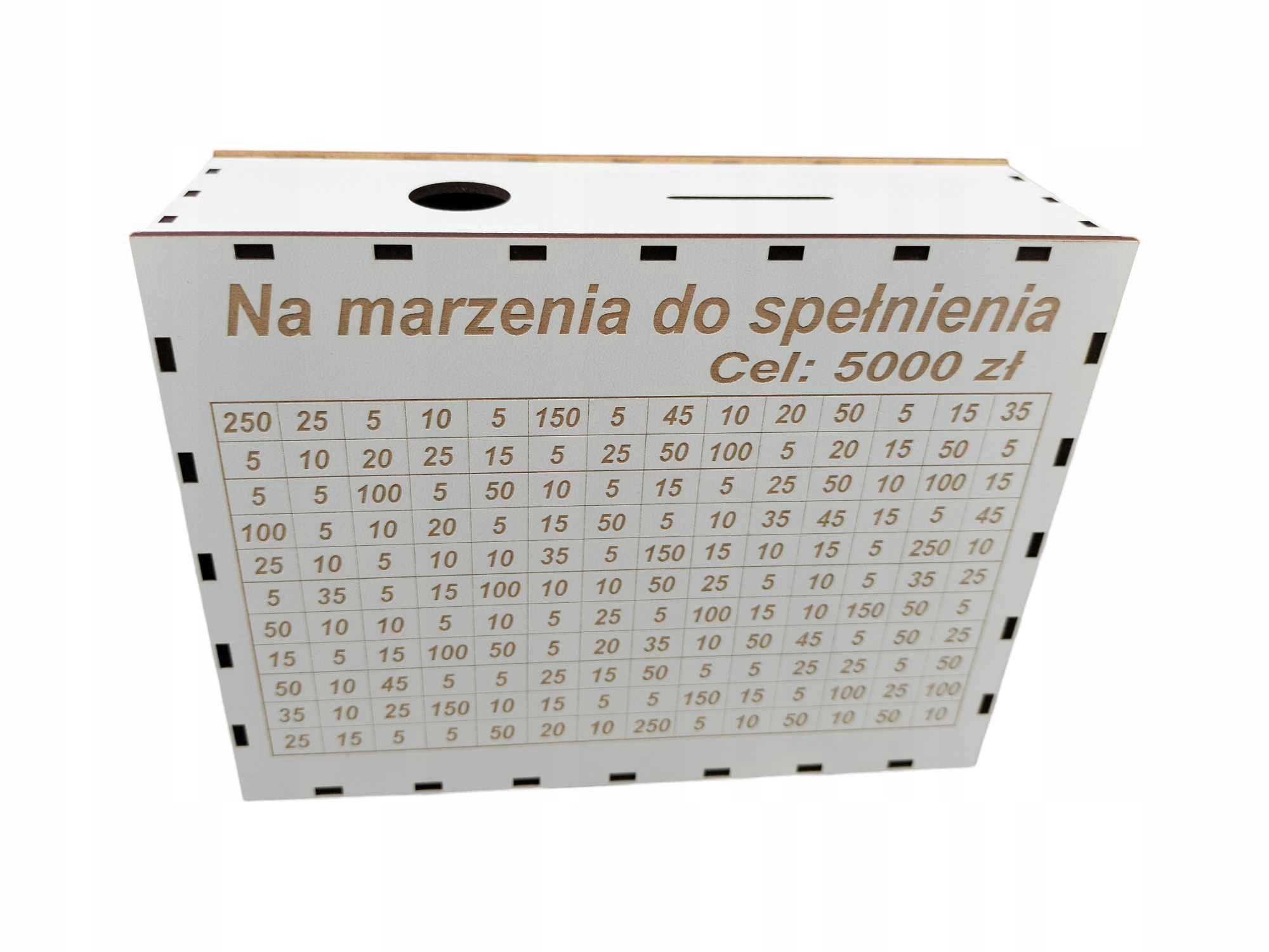 ➡️ Копилка с гравированной перечеркивающей таблицей адаптирована под различные финансовые цели, такие как: 1000 злотых, 2500 злотых, 3000 злотых, 5000 злотых, 7000 злотых, 7000 злотых, 10 000 злотых, 15 000 злотых, 20 000 злотых и 40 000 злотых.