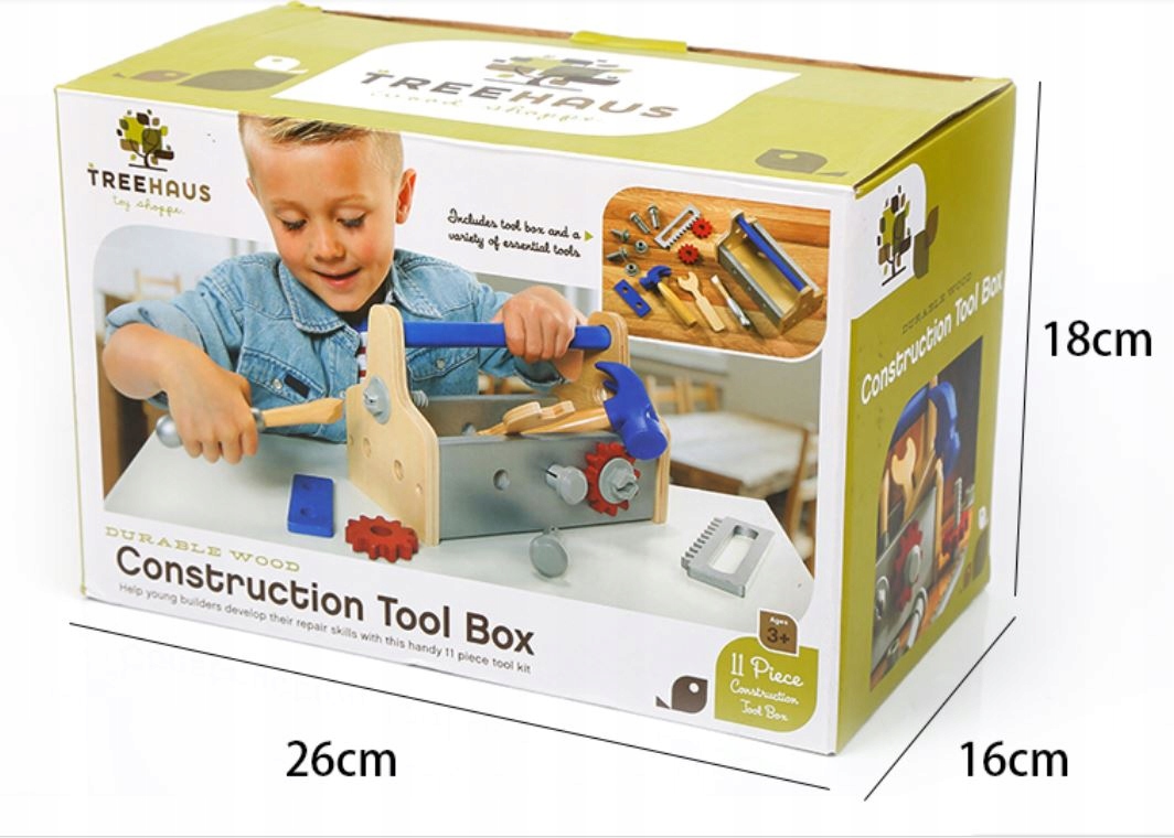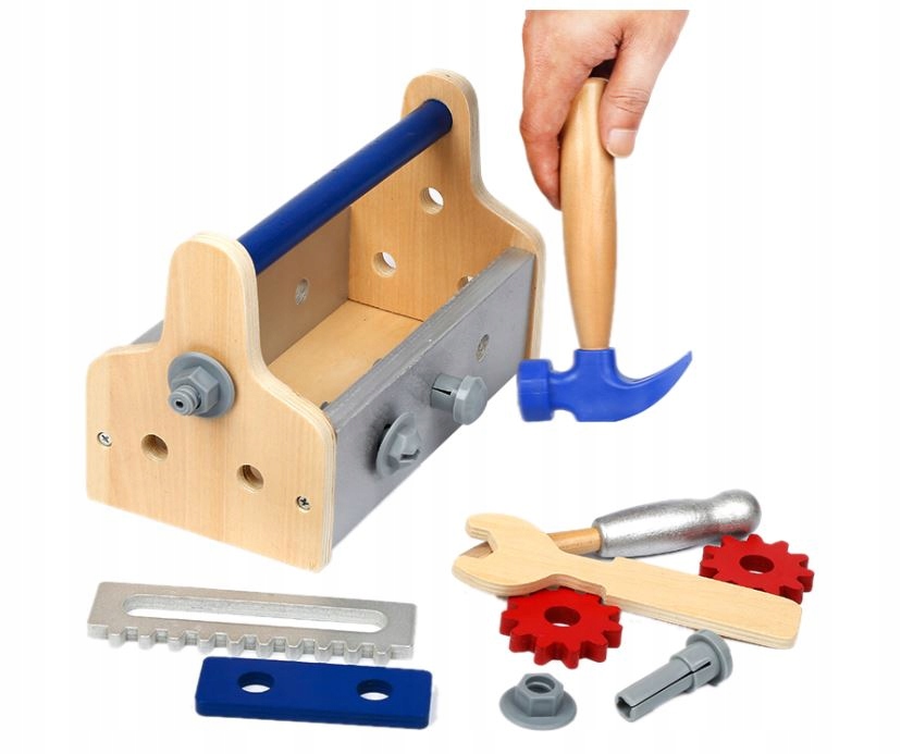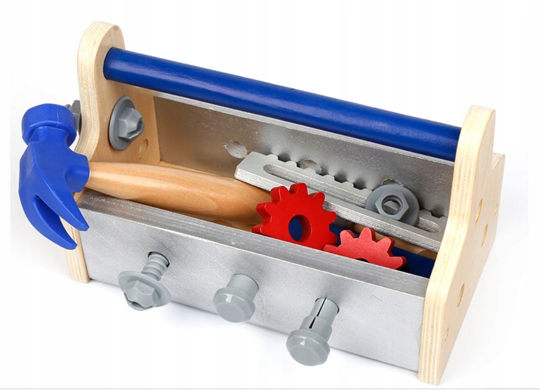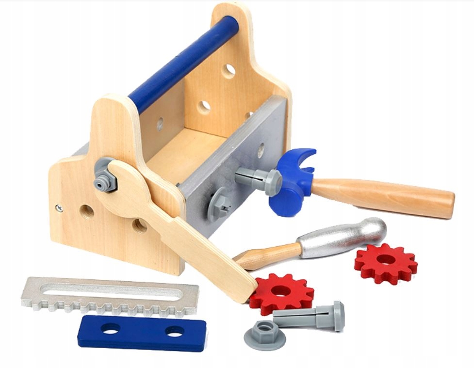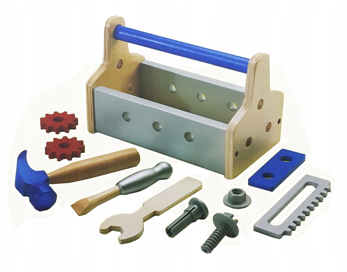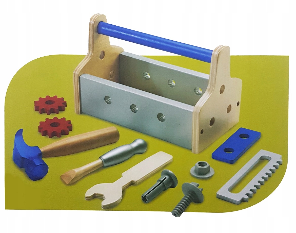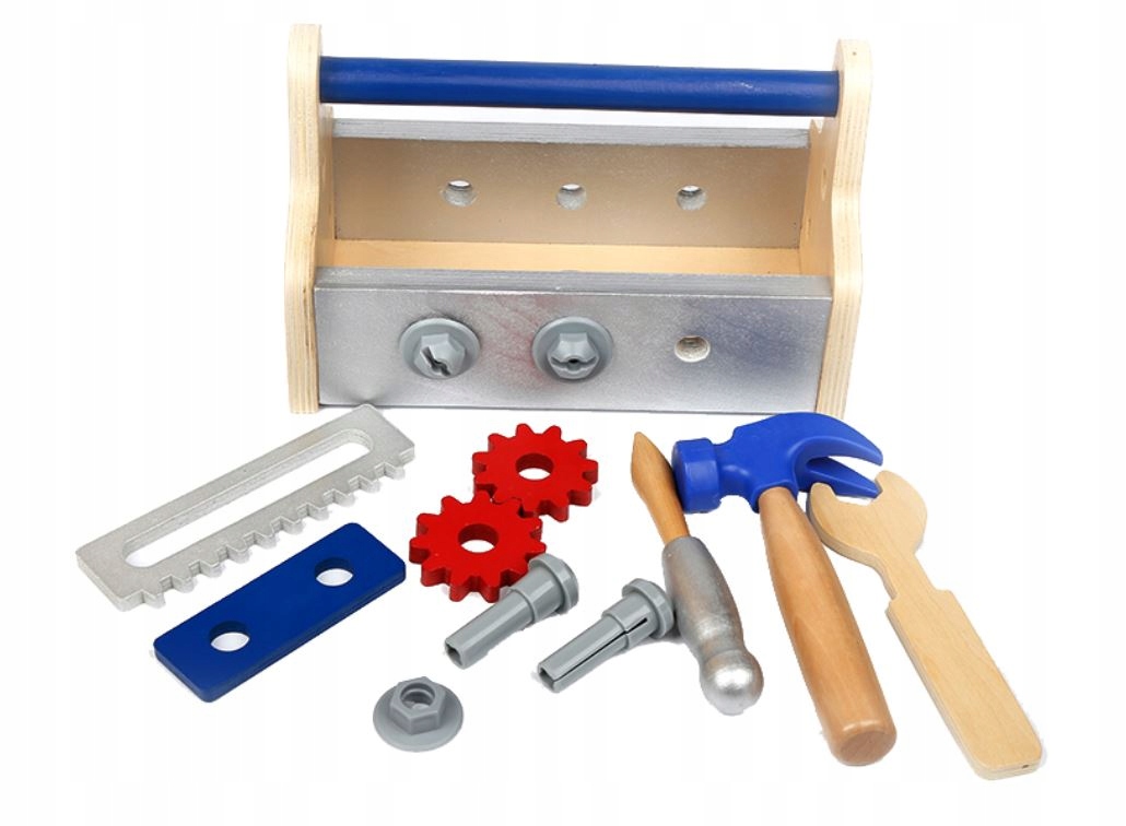 - ящик для инструментов (размеры 23,5 х 15 х 12,5 см) - молоток (длина 16 см) - отвертка (длина 14,5 см) - гаечный ключ (длина 15,5 см) - два шурупа с гайками (длина 5 см) - пила (длина 14 см) - два гвоздя (длина 5,5 см) - две шестерни (диаметр 5 см) - доски для скручивания (длина 10) см)