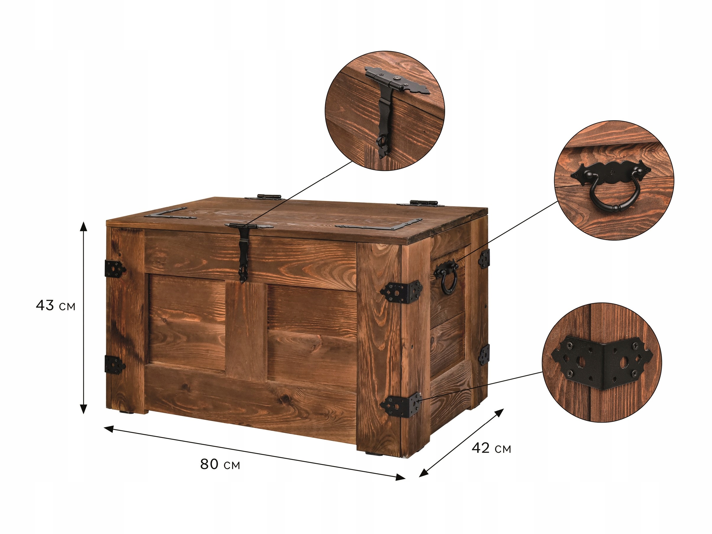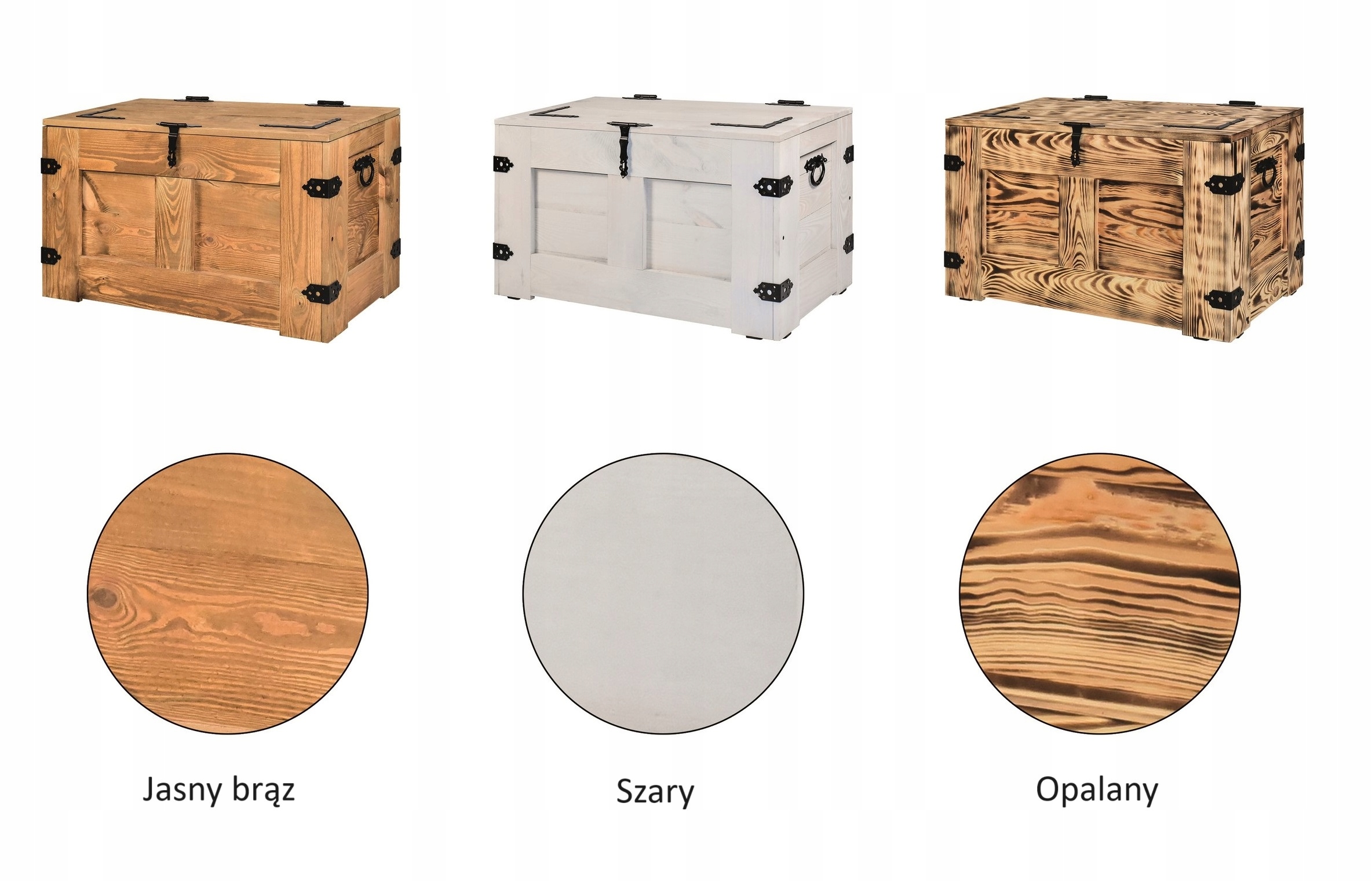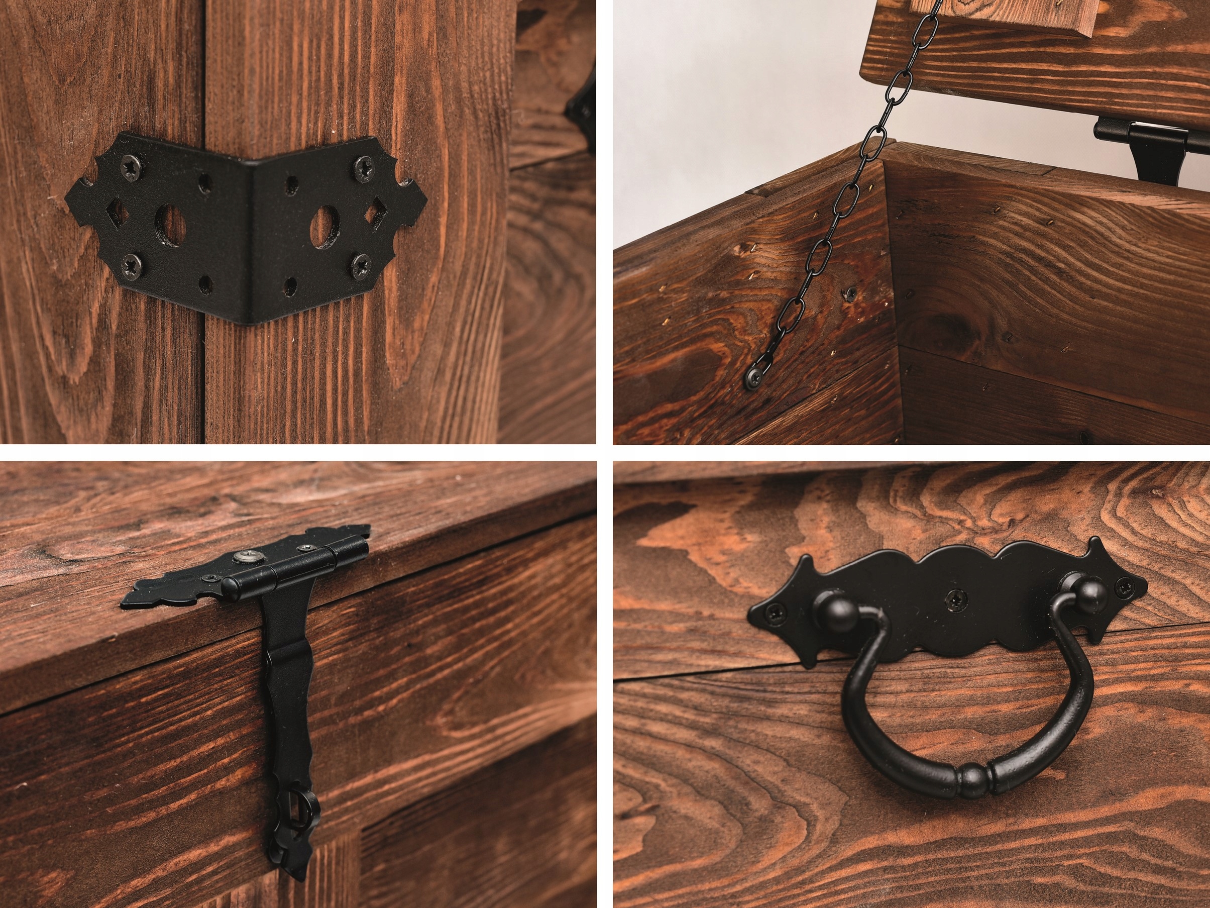 Наши сундуки изготовлены из древесины сосны, окрашены водоэмульсионными красками, а натуральные стволы промаслены. Кроме того, они имеют стальную фурнитуру, что придает коробке особый характер. Эти красивые сундуки могут украсить наш интерьер, но при этом они функциональны и вместительны. Они также прекрасно подойдут для крытой террасы, веранды или беседки в красивом саду.