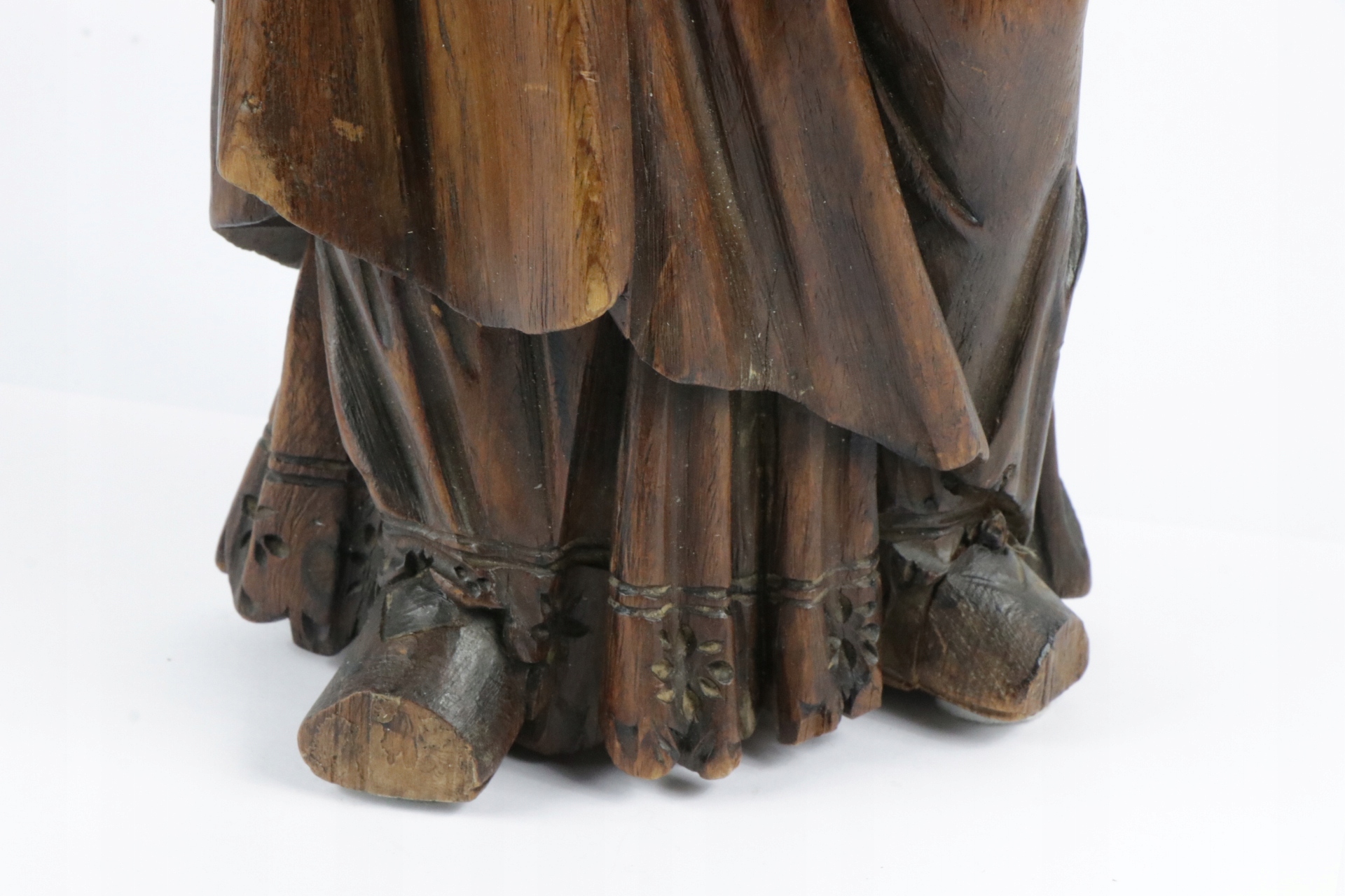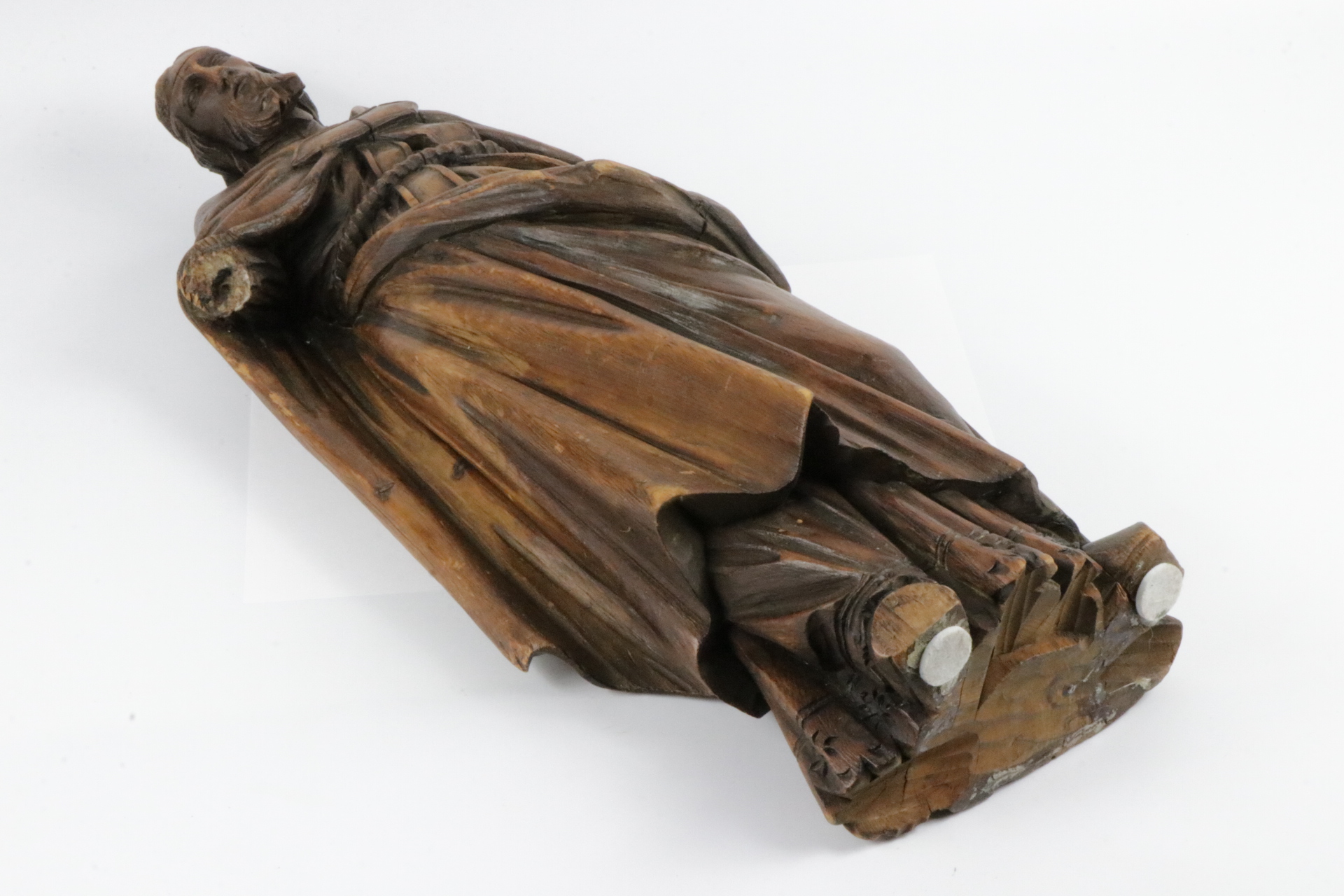 Резьба по дереву XVIII века. Скульптура святого в длинном одеянии, перевязанном на талии толстой веревкой. Ремонт макушки, видимой в верхней части. Первоначально на месте ремонта стояла митра, на обратной стороне скульптуры еще видны ленты от митры. Голову венчала архиерейская митра. Антикварная коллекционная скульптура.