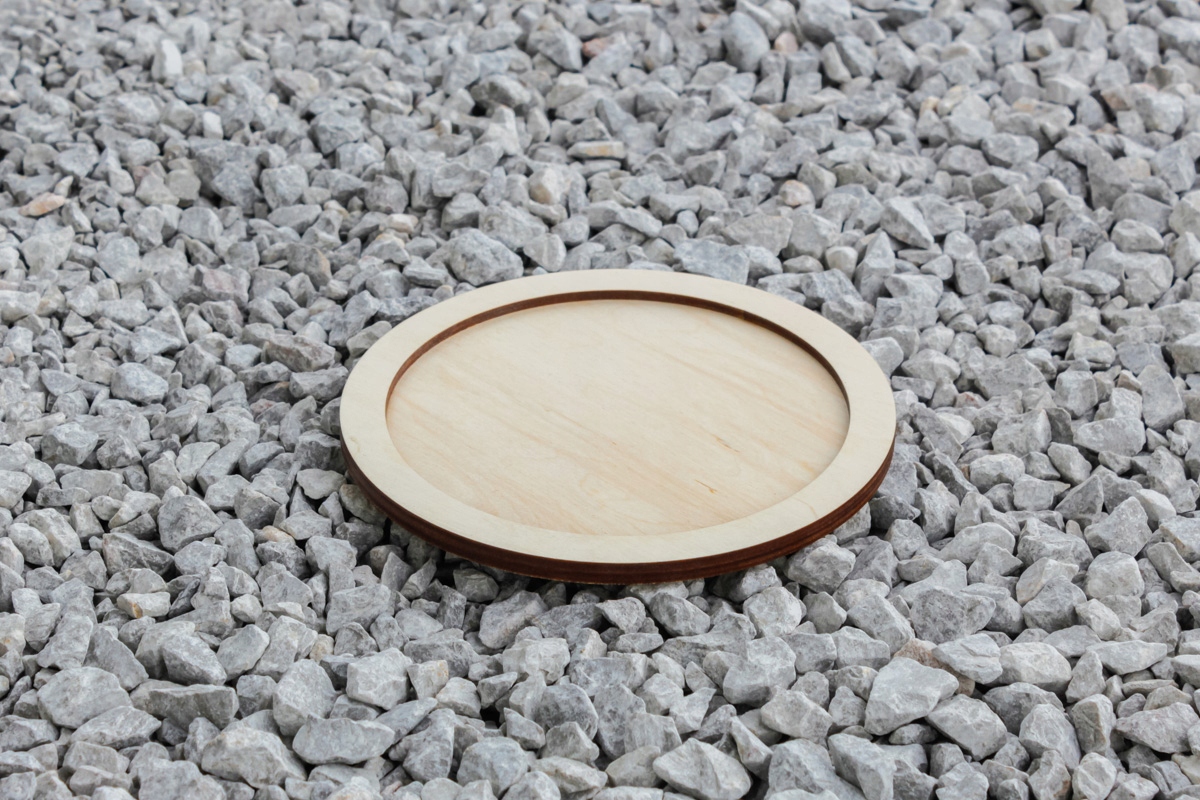 Круглый деревянный поднос, разрезанный деревянным фанерным лазером. Это отличная база для различных типов творческих работ.
