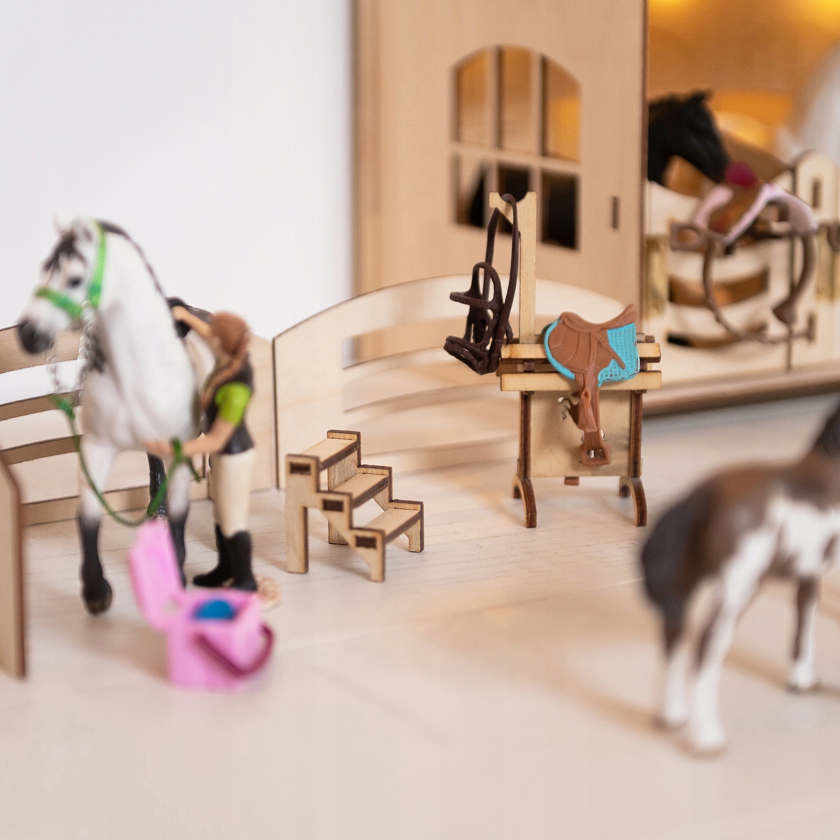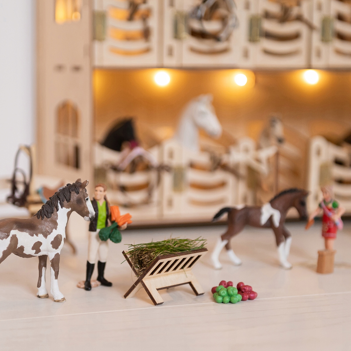 В конюшне имеется целых 56 стойл для ваших замечательных лошадей (например, лошадей SCHLEIH, Papo, Breyer, Bullyland, Colecta). Каждый бокс для лошадей имеет дверцу, установленную на петле, и собственное окно - выгравированное или вырезанное.