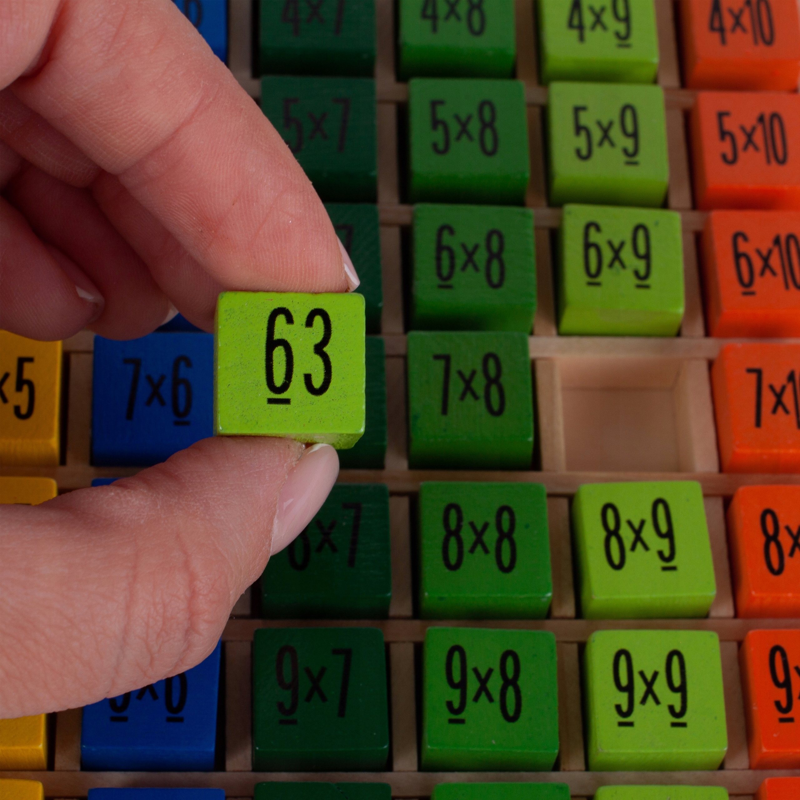 На деревянной подставке находится до 100 кубиков, на одной стороне которых показано действие, а на другой — решение. Большой набор позволяет умножать до 10! Остальные стороны игральной кости чистые, поэтому на них можно, например, писать дополнительные математические операции.