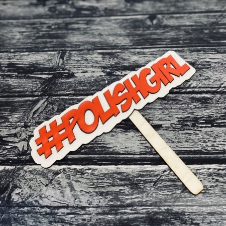 Вывеска для фотокабины из дерева, украшенная красным хэштегом «Polishgirl» на белом фоне. Идеально подойдет в качестве гаджета для фотосъемки.