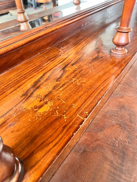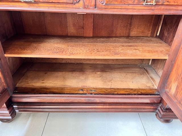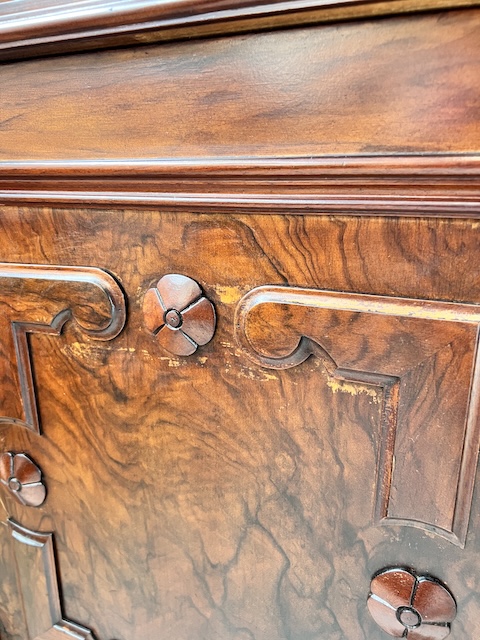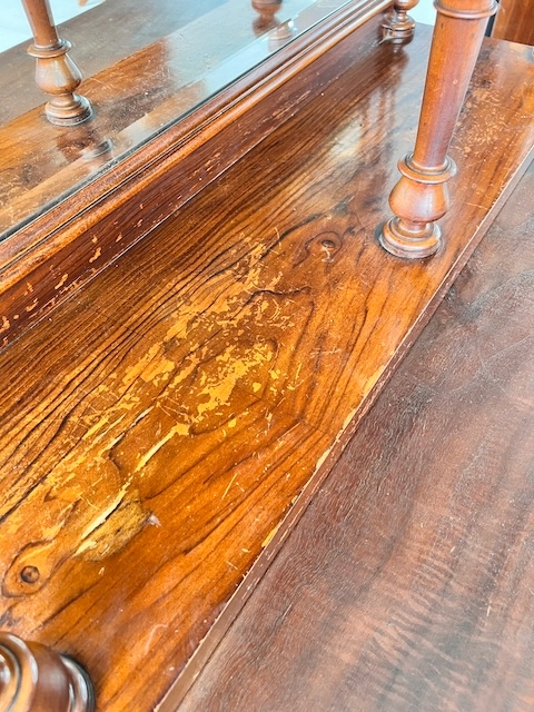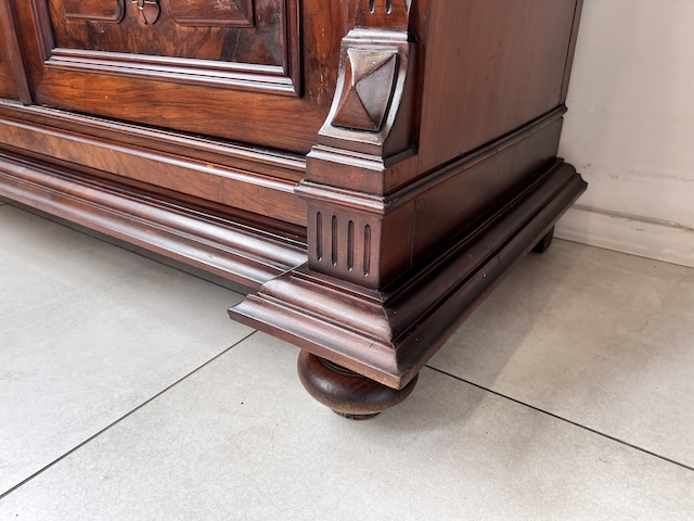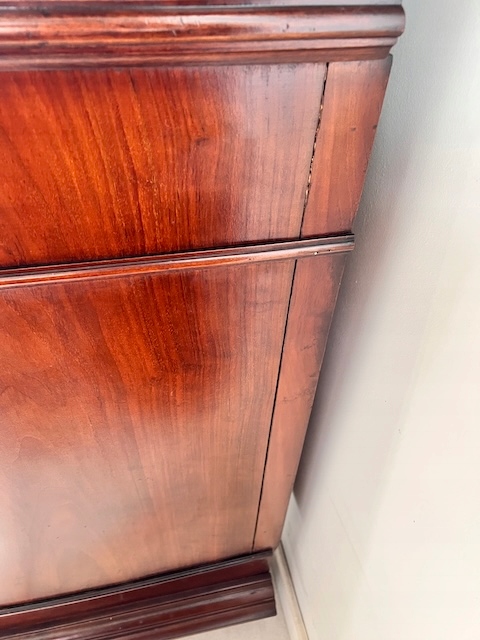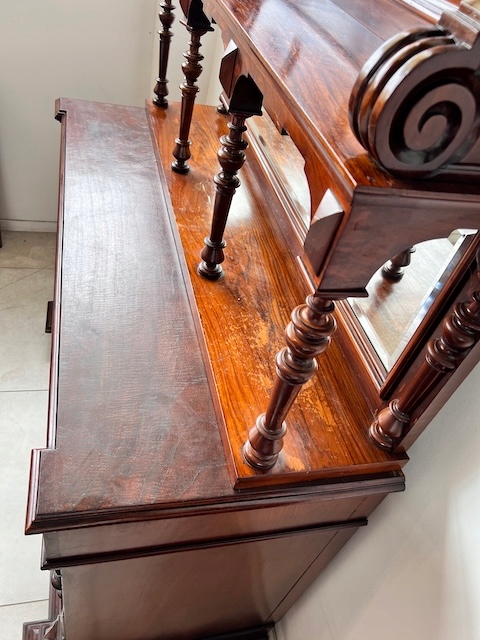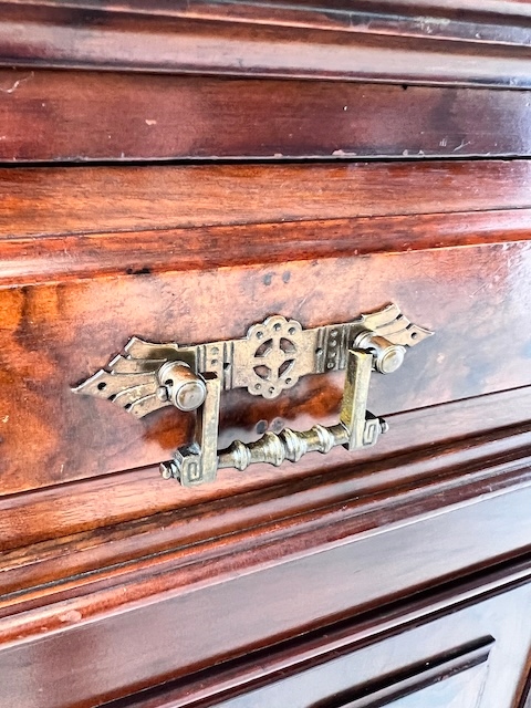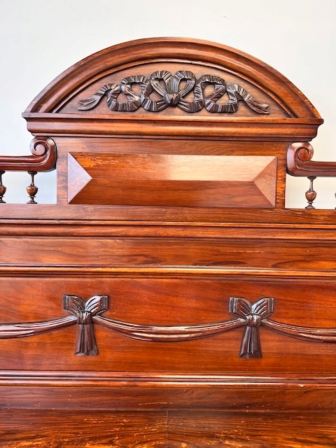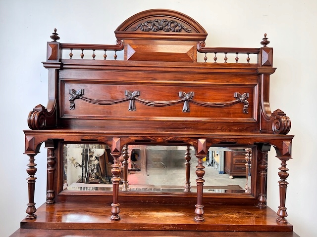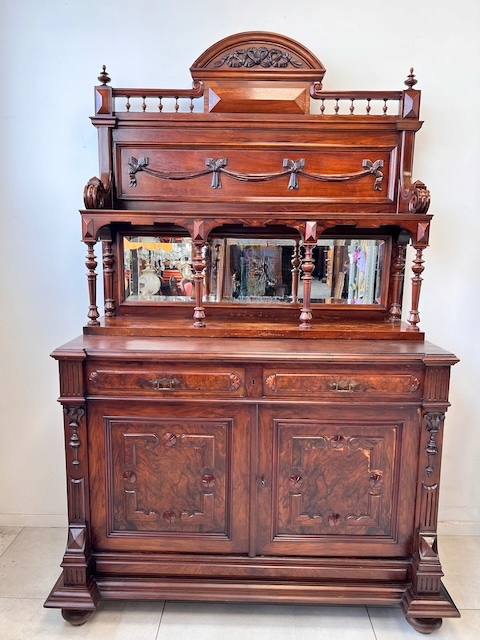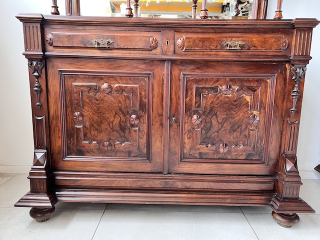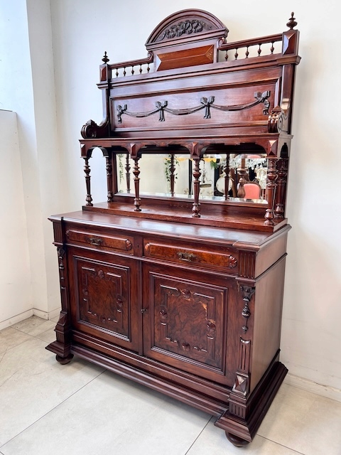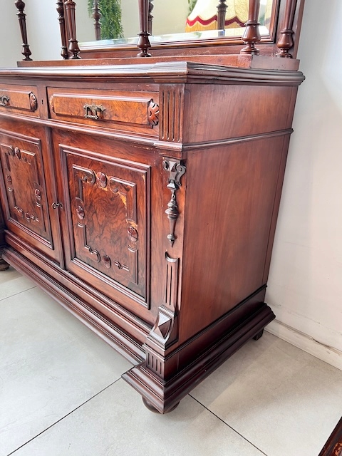 Серван из красного дерева 1937 года. Эффектный. Приставка с зеркалом красиво осветит пространство. Зеркало оригинальное, скошенное. На нем имеются следы течения времени. Сервант не имеет повреждений и дефектов, но имеет следы использования. Имеются небольшие, но многочисленные потертости, особенно на нижних планках, полке и верхней платформе. Кажется, что лак в какой-то момент отслоился, но поверхность гладкая. Замок на двери работает, есть ключ. В ящиках его не проверяли. Нижняя часть с дверью очень вместительная и функциональная. Внутри есть полка. Комод будет отлично смотреться в гостиной, столовой или стильном офисе. Он состоит из двух элементов. Он готов к вставке.