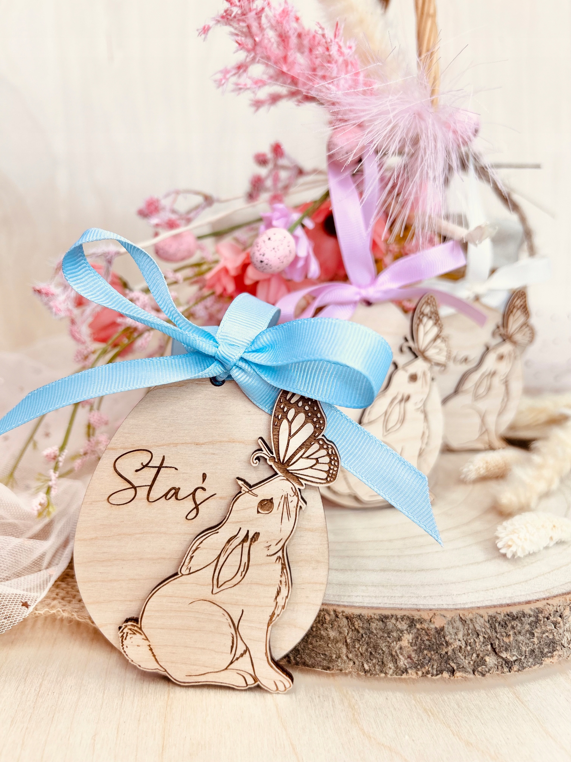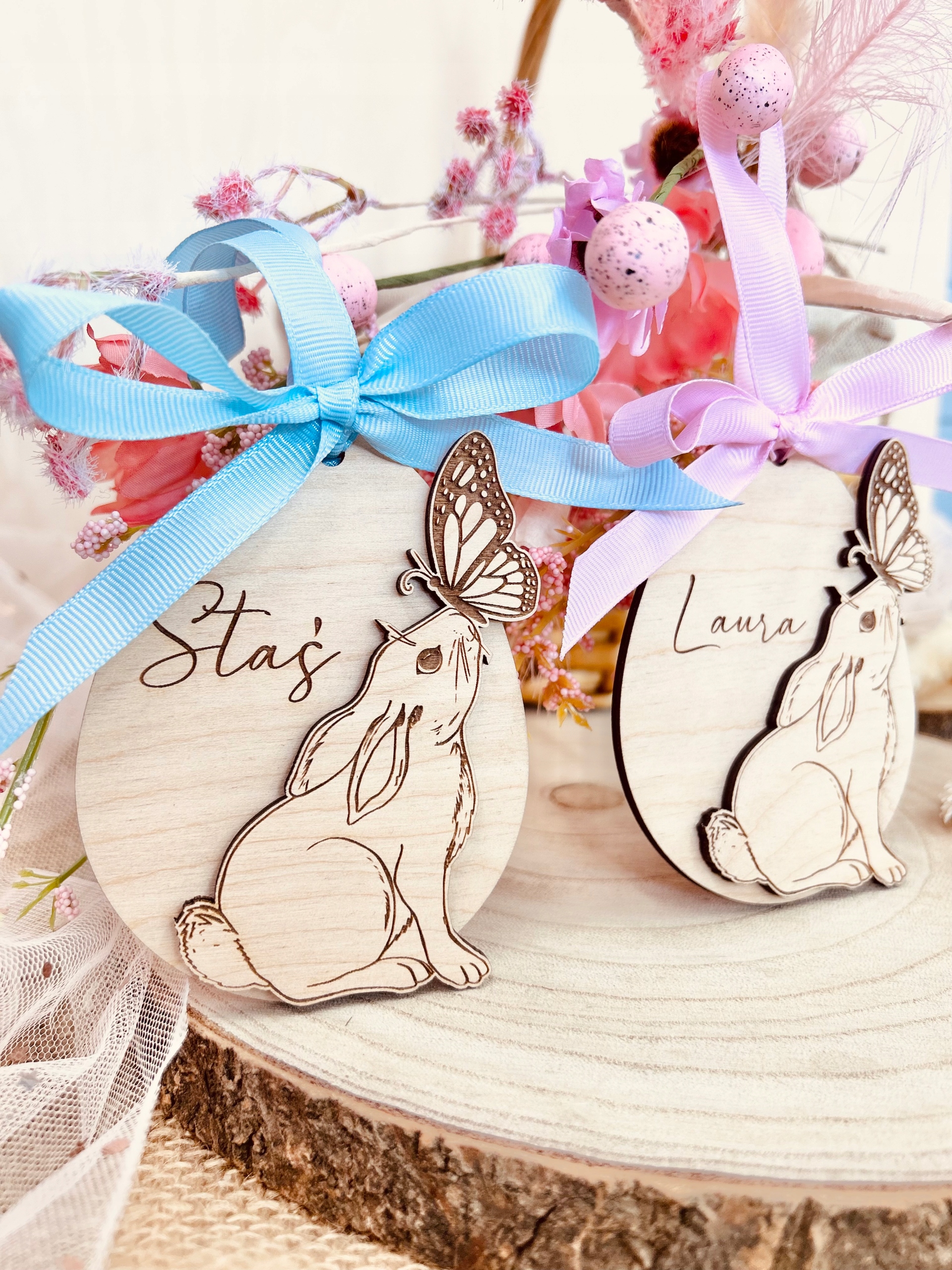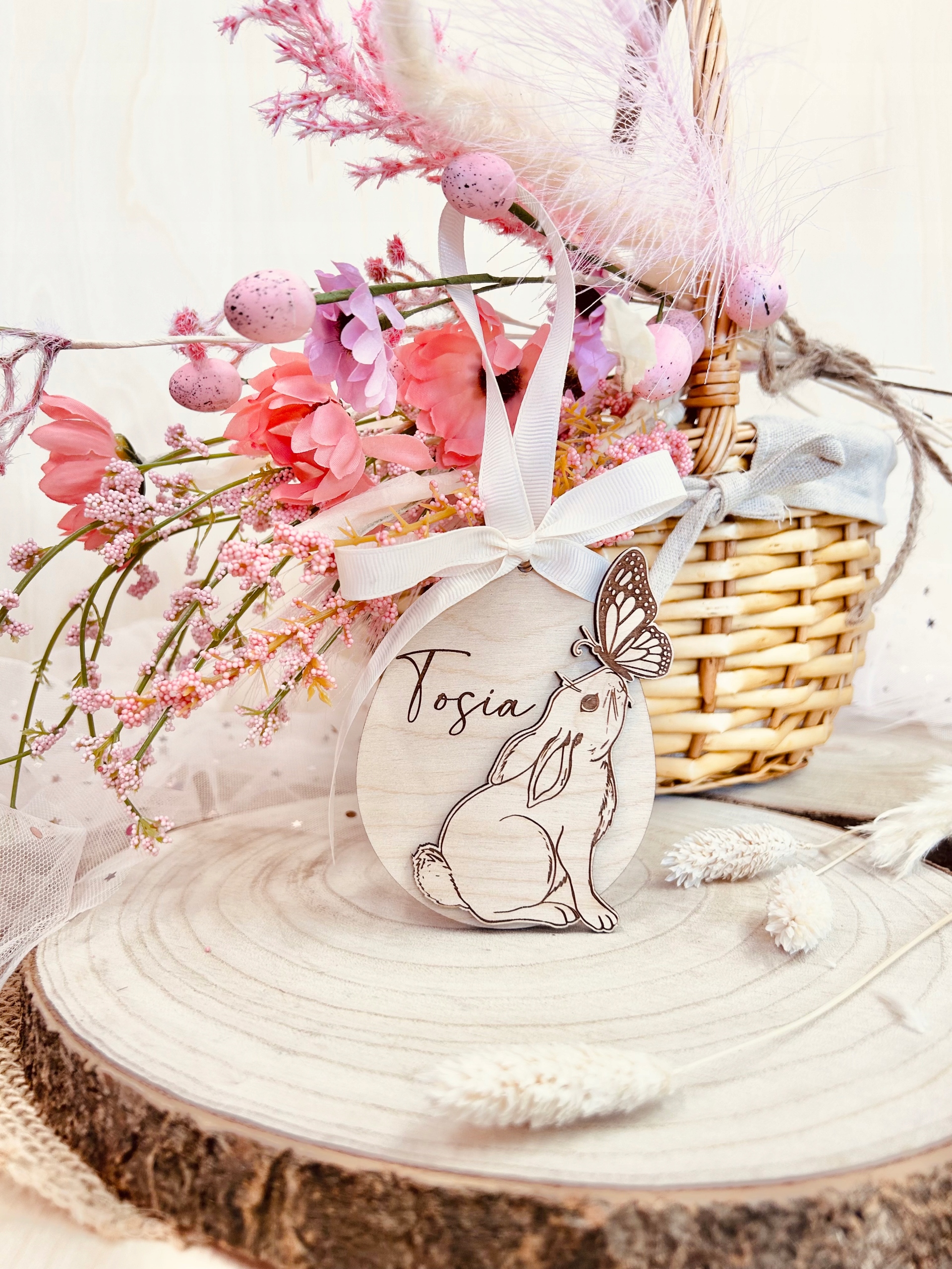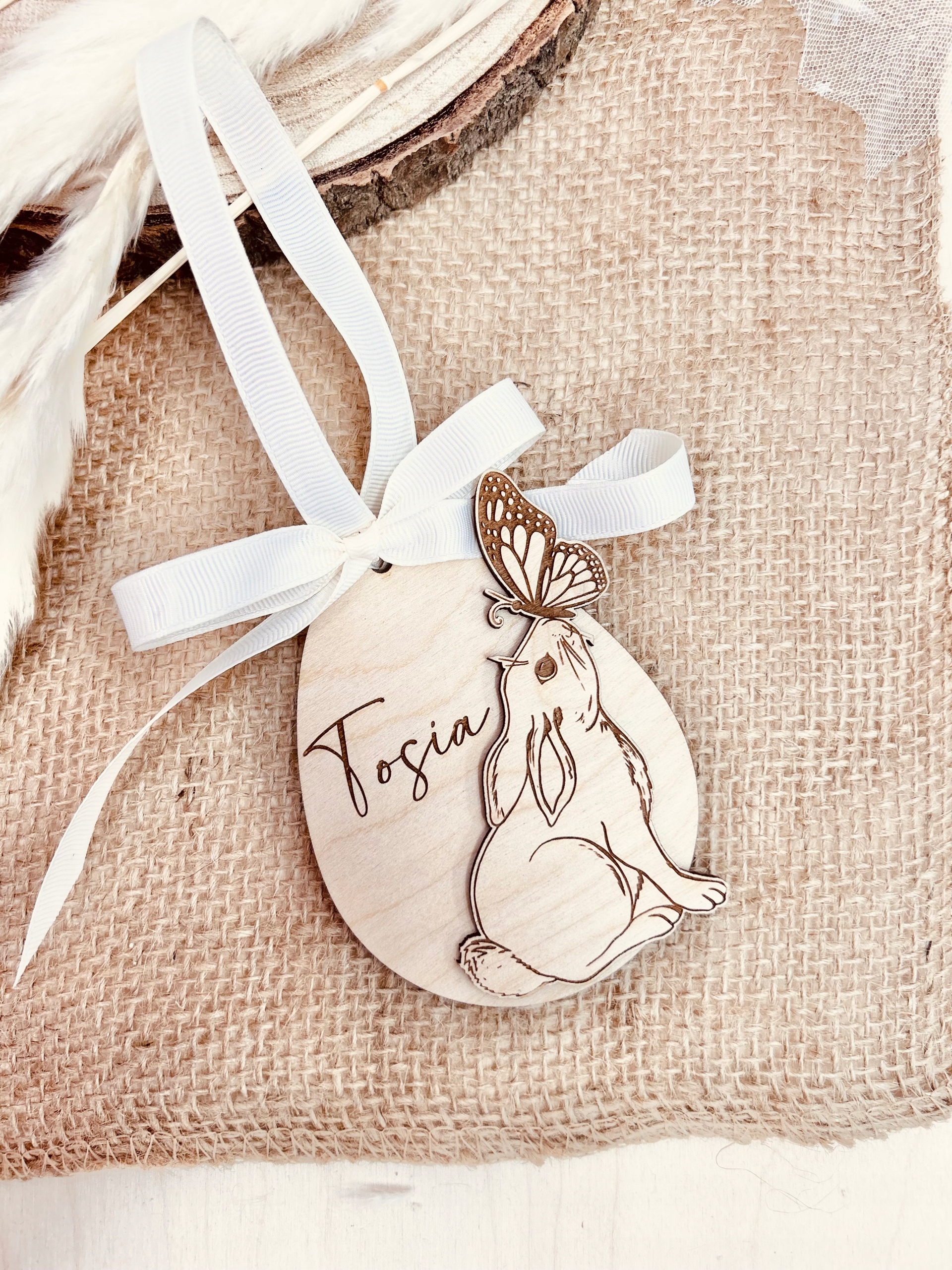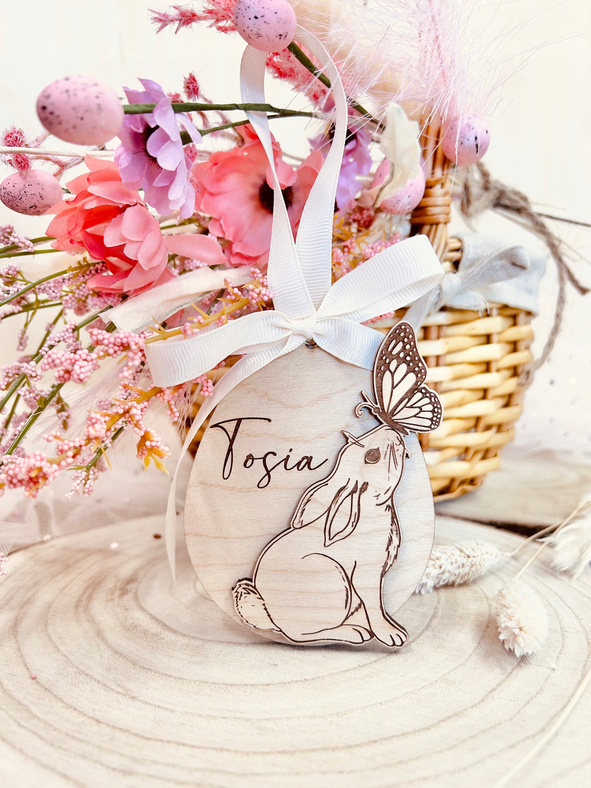 На подвеске есть очаровательный мотив кролика и бабочка, которая прекрасно отражает атмосферу радостных весенних дней. Более того, мы нанесем имя на подвеску, благодаря которому это может быть персонализированный подарок или украшения, который будет уникальным и уникальным.