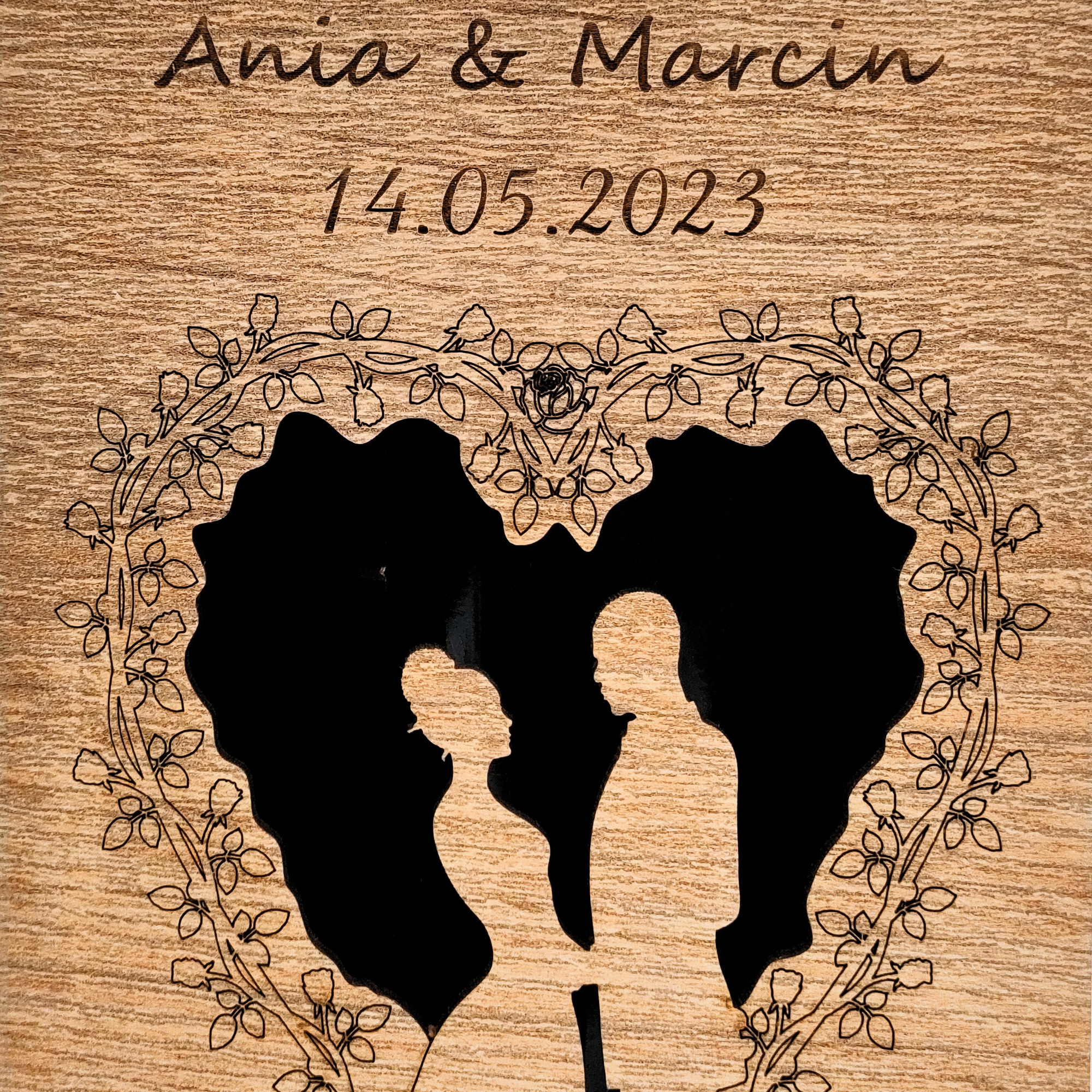 Романтичный свадебный мотив с изображением жениха и невесты с первого взгляда привлекает внимание. Жених и невеста окружены сердцем из цветов. Все это было тщательно выгравировано, отражая красоту и нежность этого особенного момента.