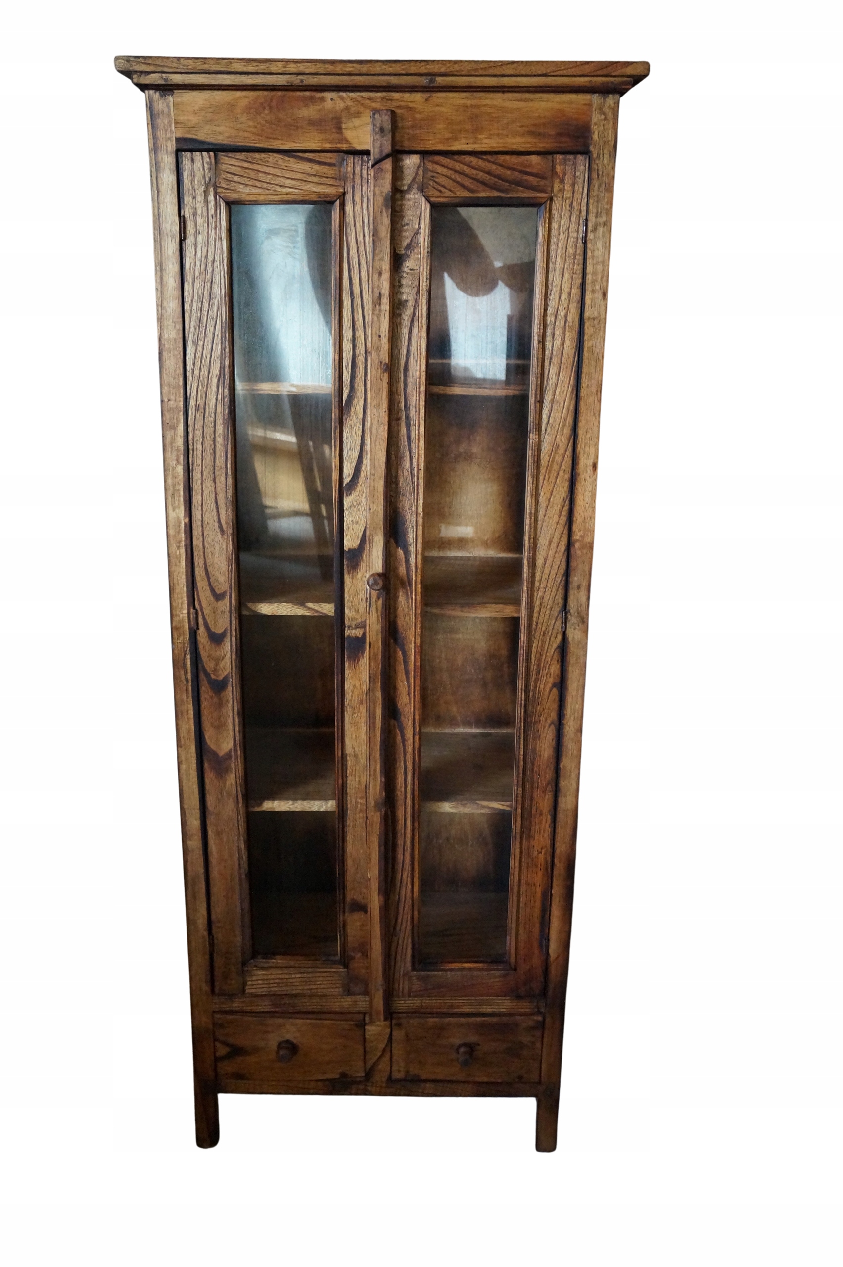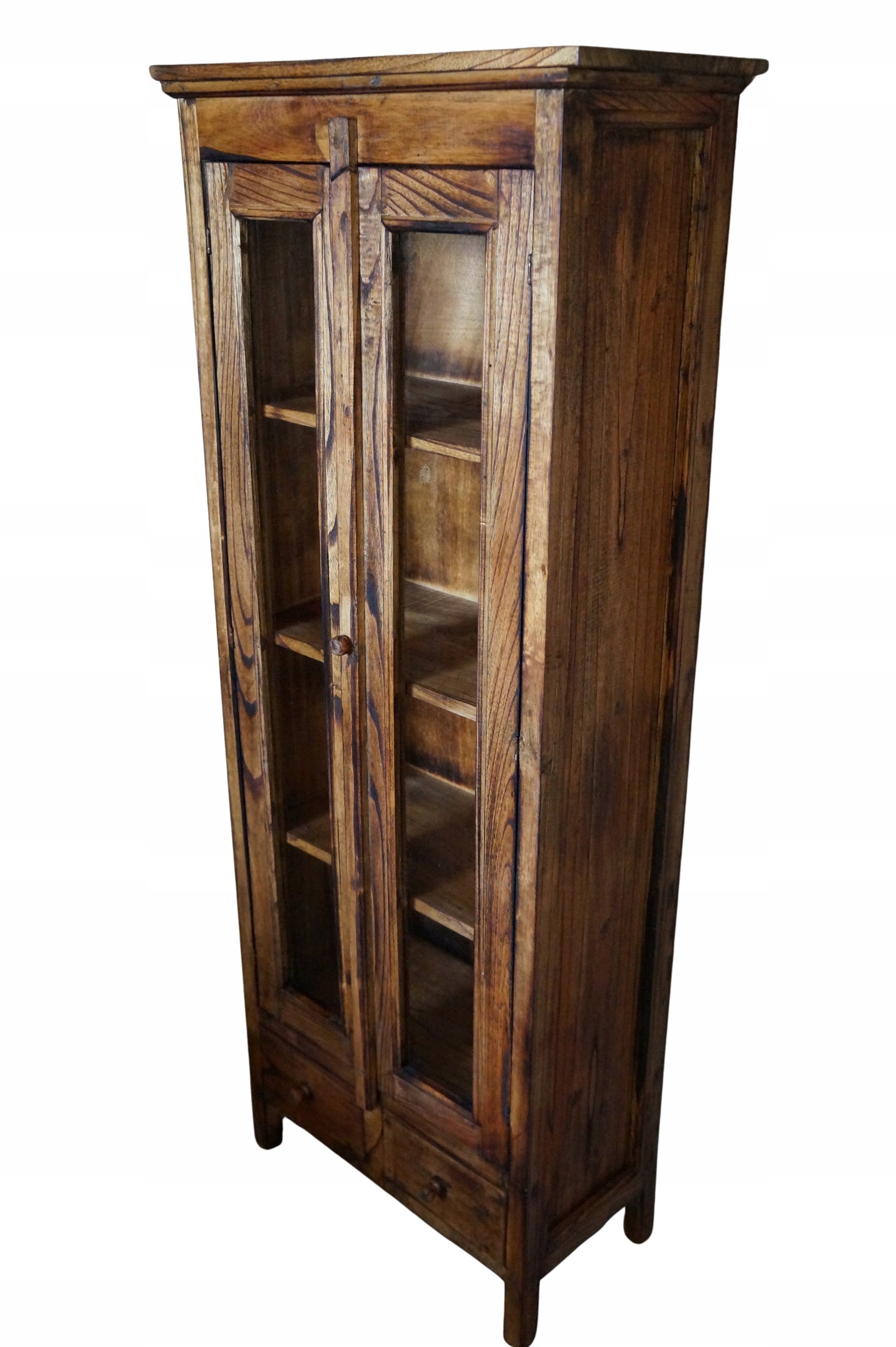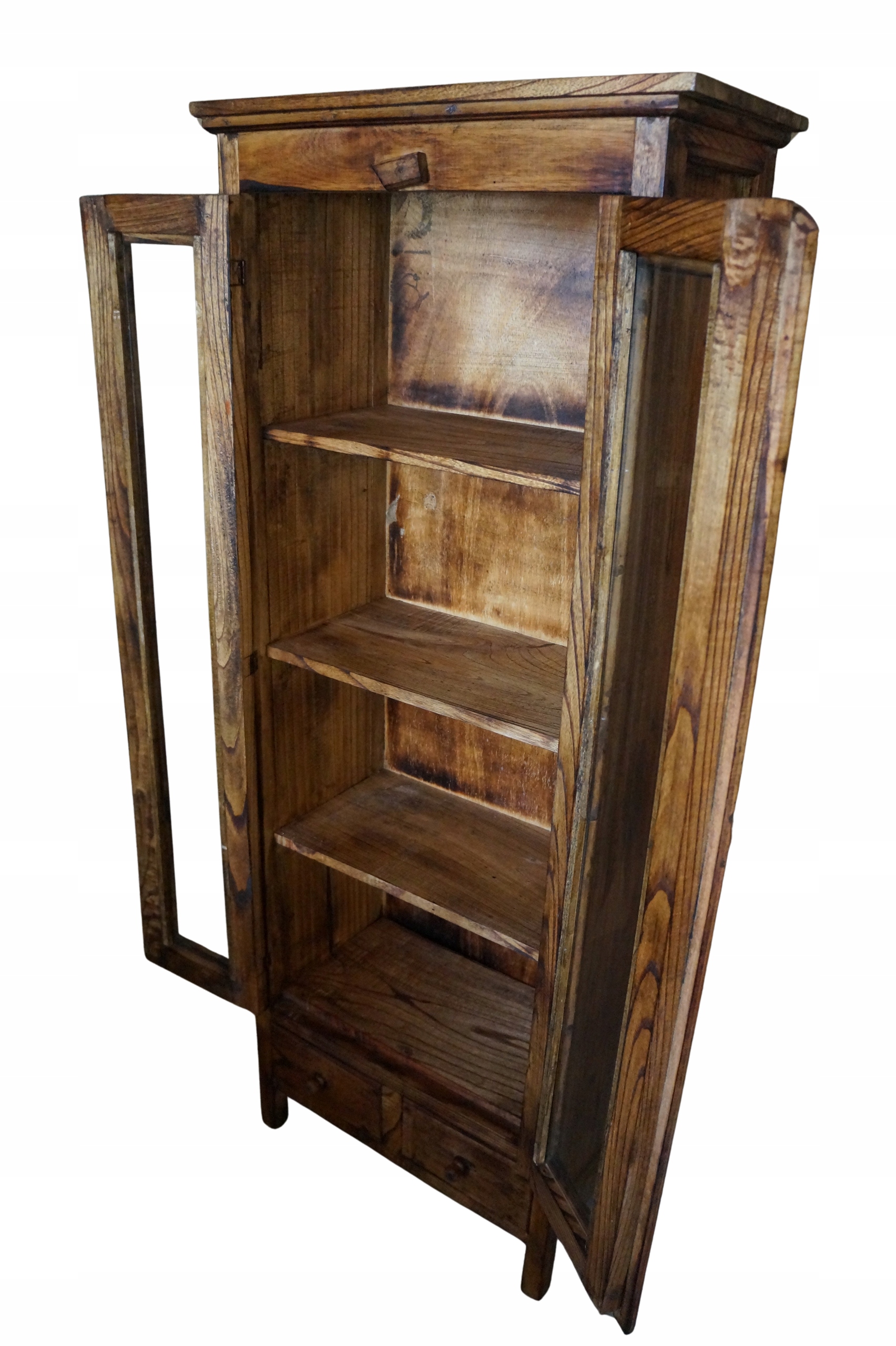Витрина изготовлена из местной экзотической древесины Джемпинис с острова Бали. Имеет два выдвижных ящика, открывающиеся стеклянные дверцы и полки. Ящик без направляющих. Мебель выполнена в винтажном стиле, состаренная.