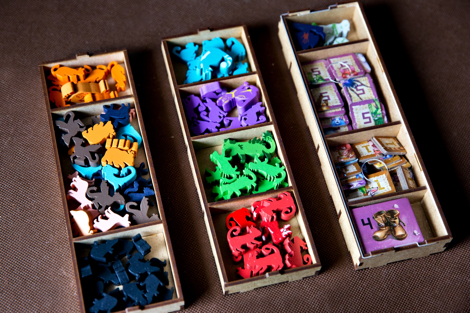 - 3 контейнера для деревянных фигурков кошек, зверей, королевских крыс и токенов рыбы,
