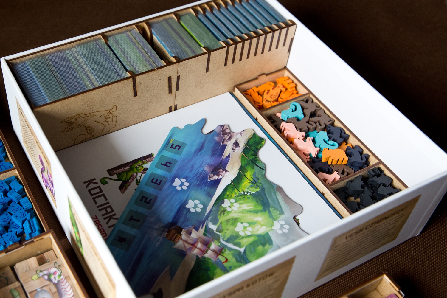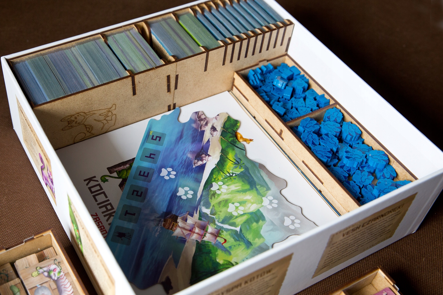 - Контейнер с токенами по баскетболу, общими сокровищами, плитки Oshax и контейнер с одноразовыми токенами, 5-точечными, фигурками Lodź Vesh и Caty Oshax. Деревянные фигурки кошек, зверей, королевских крыс и токенов рыбы. Контейнеры укладываются под контейнер с горшком. Эти контейнеры имеют специальные замки, чтобы они не перемещались в коробке,
