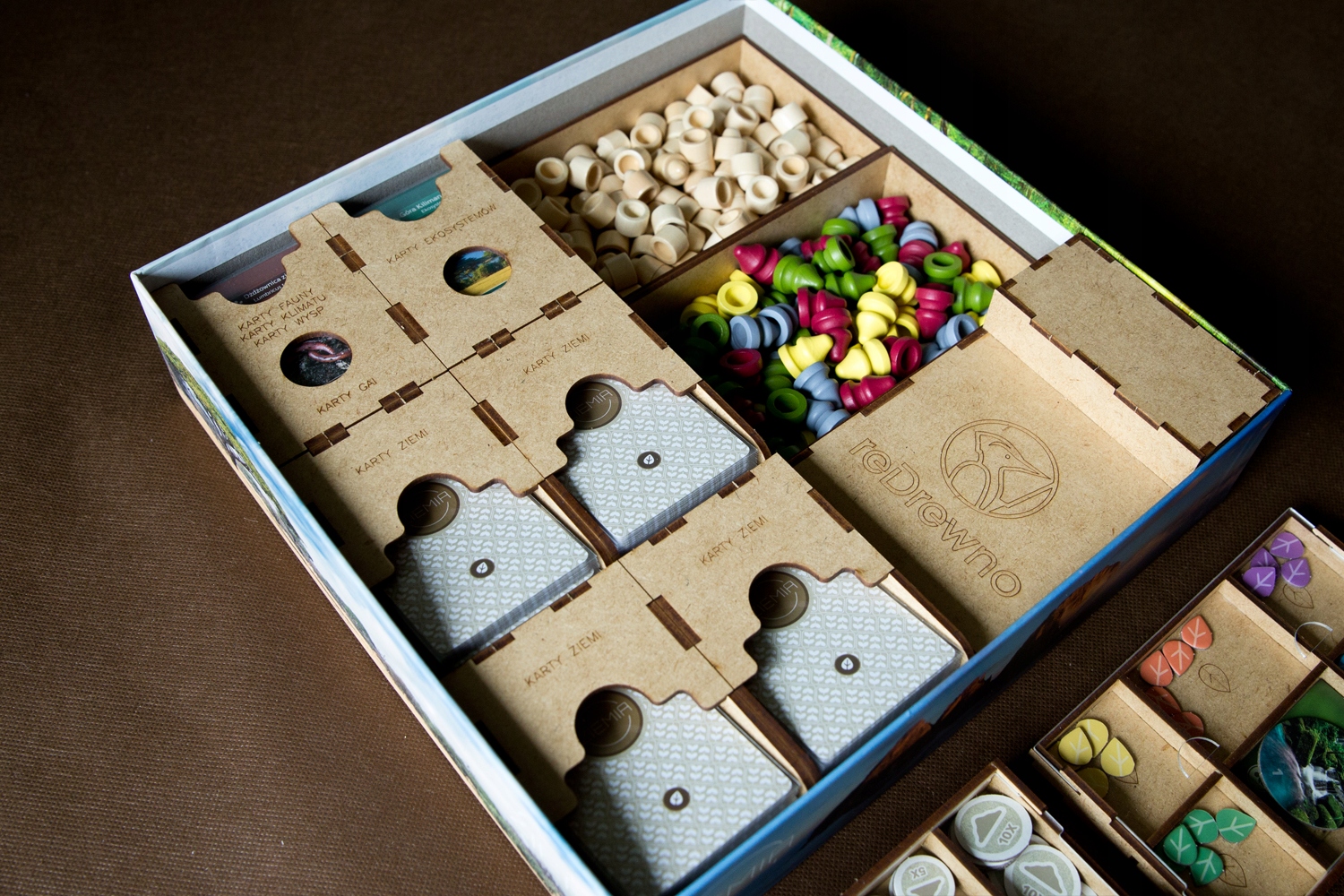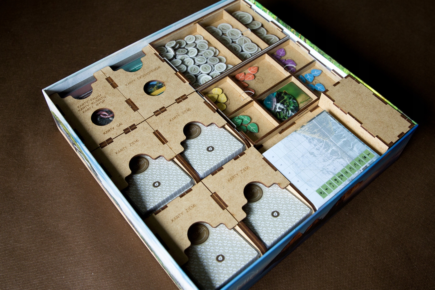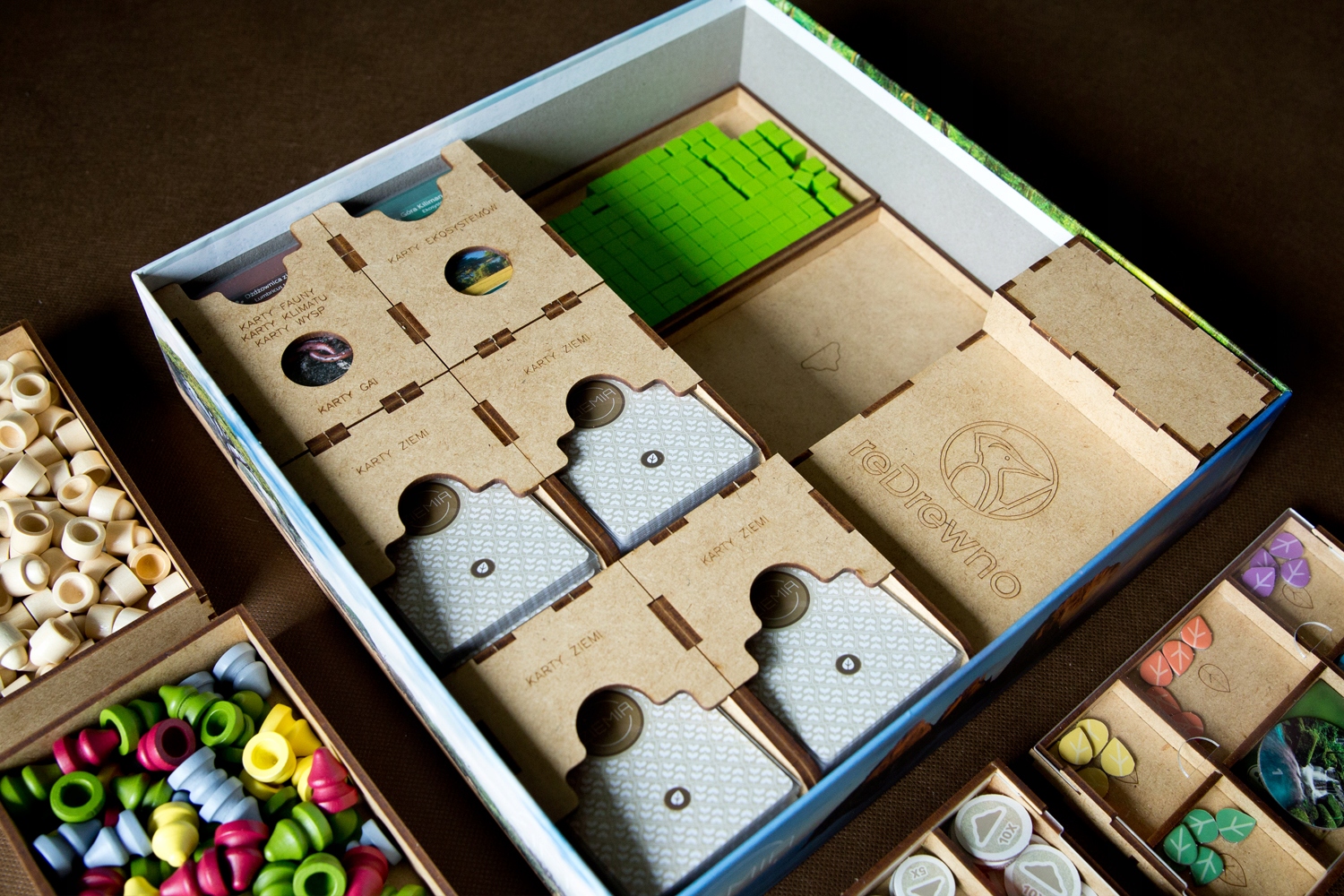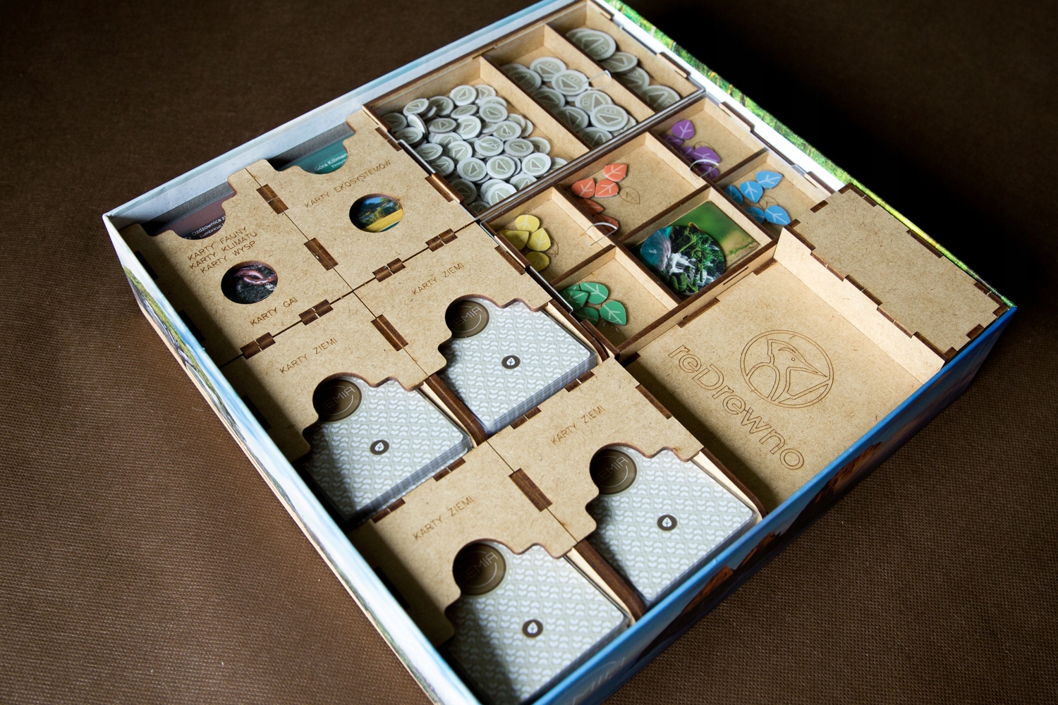 Вставка для стратегической игры Земля. INSERT удерживает карты в премиальных T -рубашках с толщиной до 110 микрон. На фотографиях карты в Rebel Premium T -Sharts (90 микрон). Вставьте дома деревянные компоненты, доступные в издательском магазине: деревянные почвенные маркеры и теги листьев.