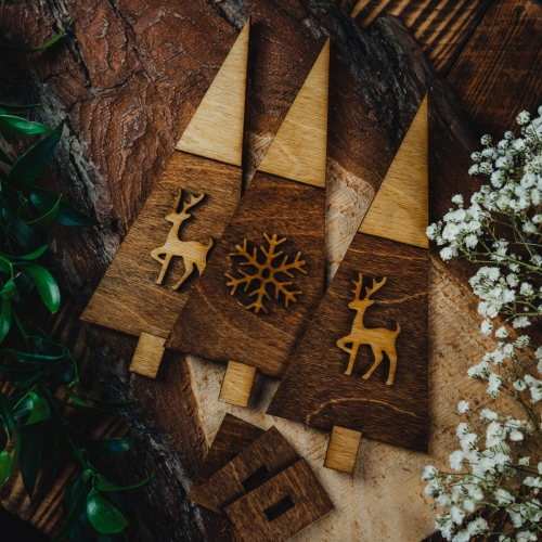 Деревянные елки – красивое и оригинальное украшение на Рождество. Красиво смотрится стоя благодаря деревянным подставкам, которые нужно прижать. Деревянная отделка придаст любому интерьеру красивую, деревенскую, теплую атмосферу. Наши деревянные елки идеальны в качестве украшения дома, в индивидуальных композициях или красивых фотосессиях. Они непременно порадуют вас своей индивидуальностью. Деревянное украшение мы изготовили из фанеры толщиной 3 мм и вручную покрасили оригинальным маслом палисандра и дуба. На елках золотые снежки и олени. Цвет и текстура древесины могут незначительно отличаться от того, что мы видим на фотографиях. В набор входят 3 деревянных елочки.
