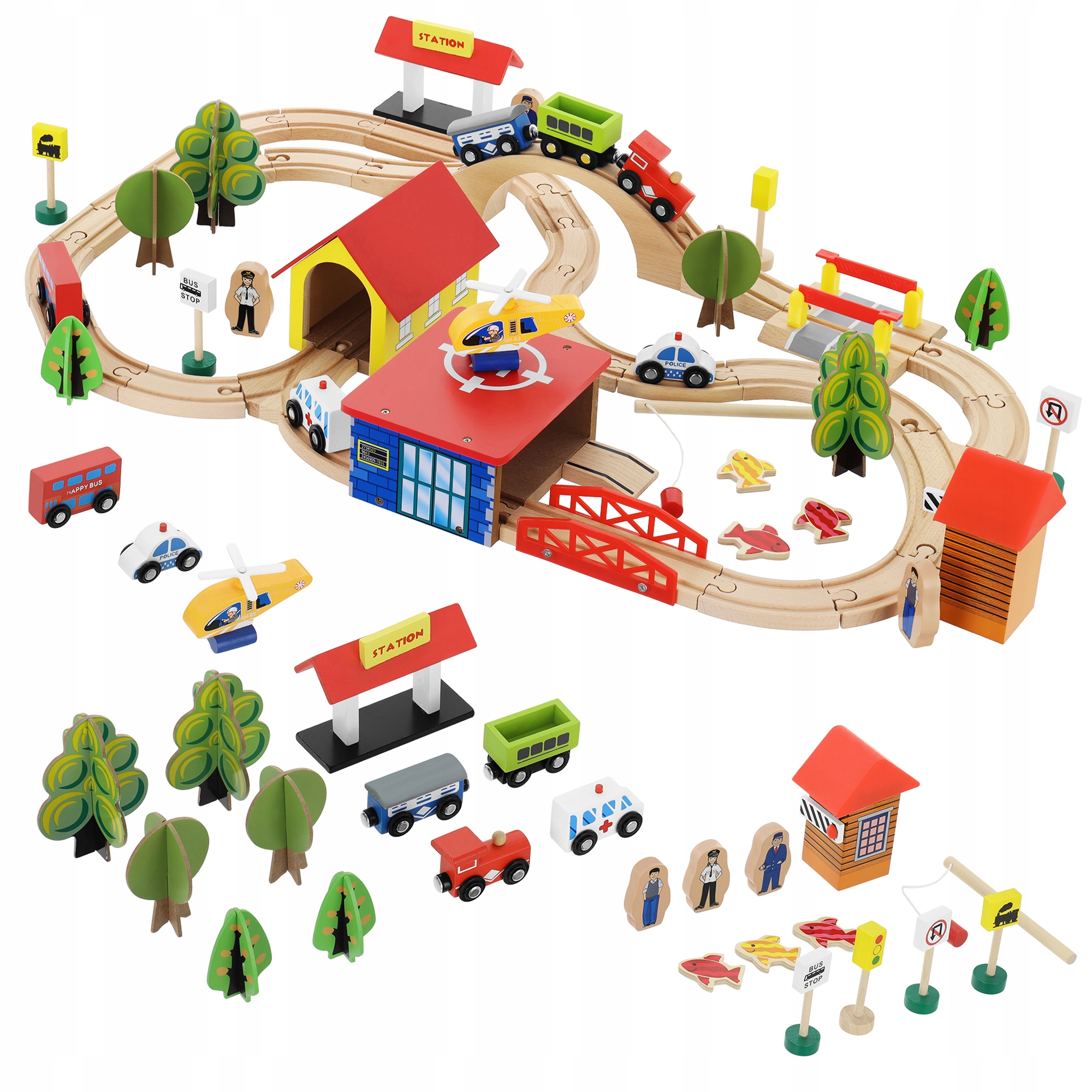 ДЕРЕВЯННЫЙ ГОРОДОК С ПОЕЗДОМ И ВЕРТОЛЕТОМ / ДО 69 ЭЛЕМЕНТОВ / ПОЕЗД И АВТОМОБИЛИ С МАГНИТОМ