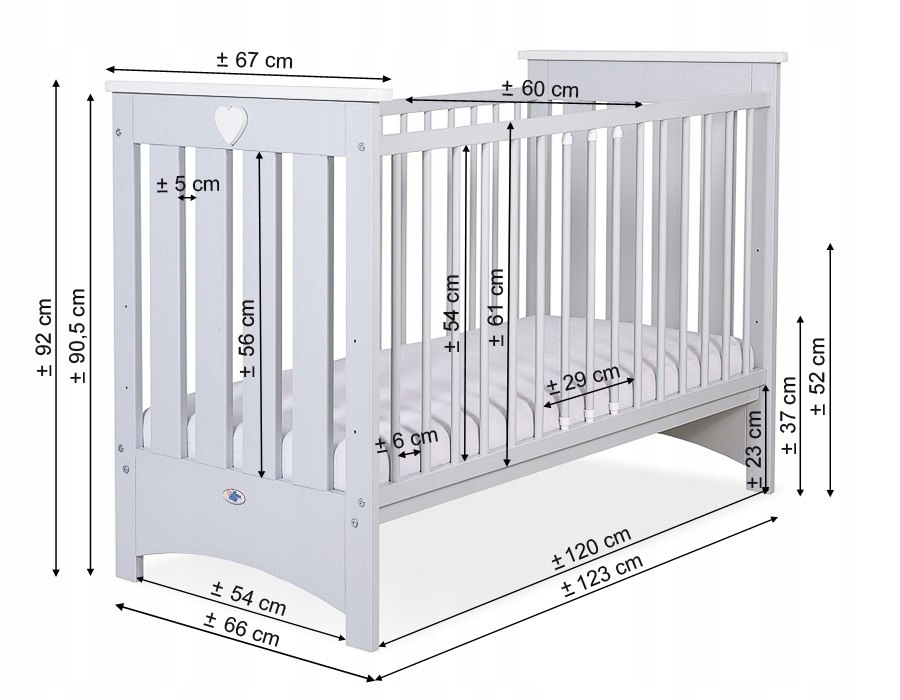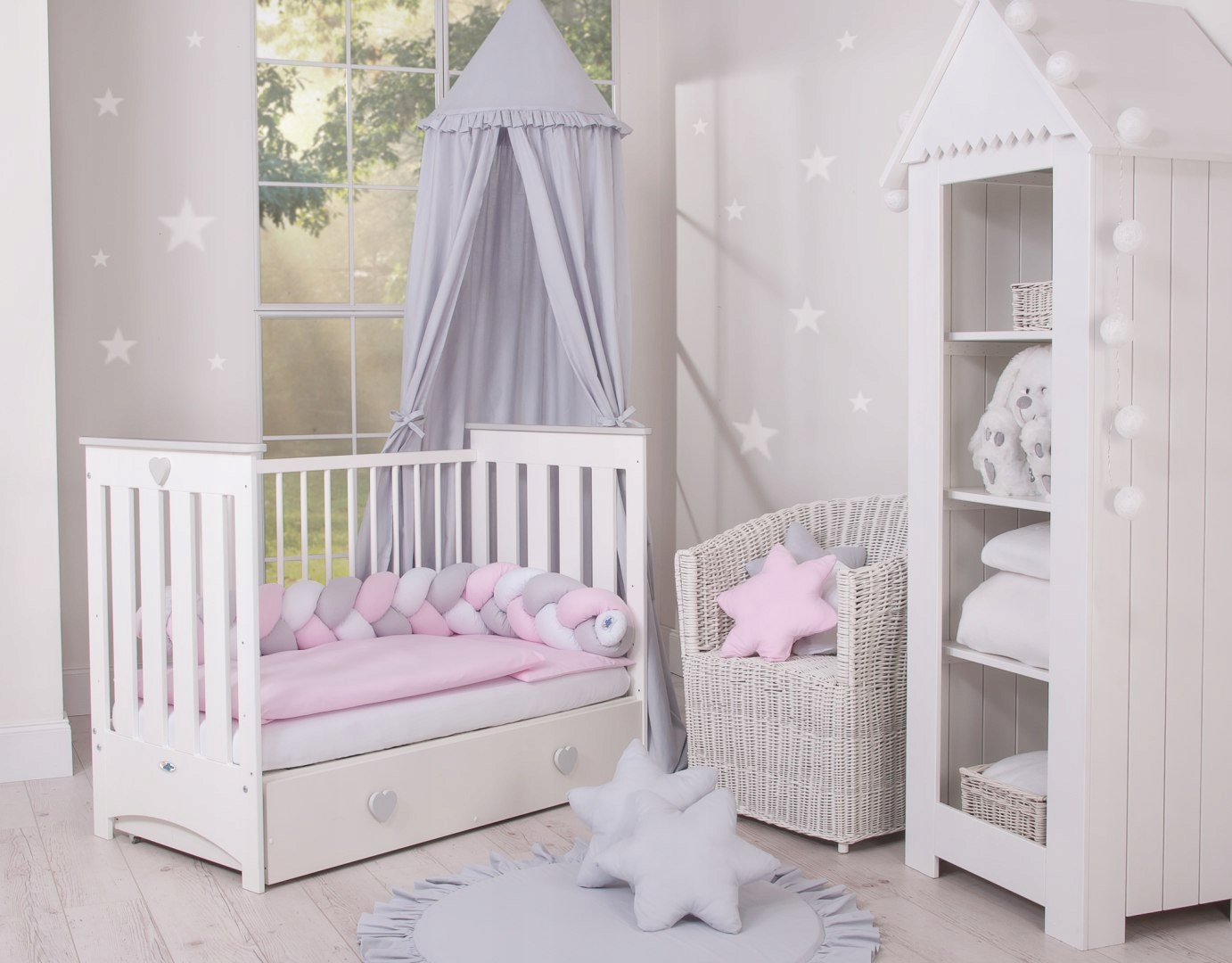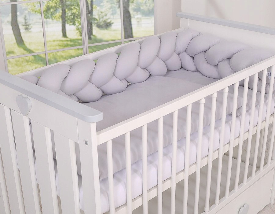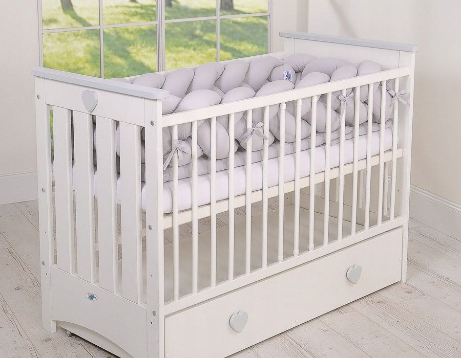 Белая деревянная кроватка из толстой твердой древесины. Светло -серые декоративные полоски на фронтах кроватки и светло -серое сердце в передней части койки создают нежный пастельный декоративный акцент. Деревянная детская кроватка -Встреча с нынешней стандартной PN -EN 716-1: 2017