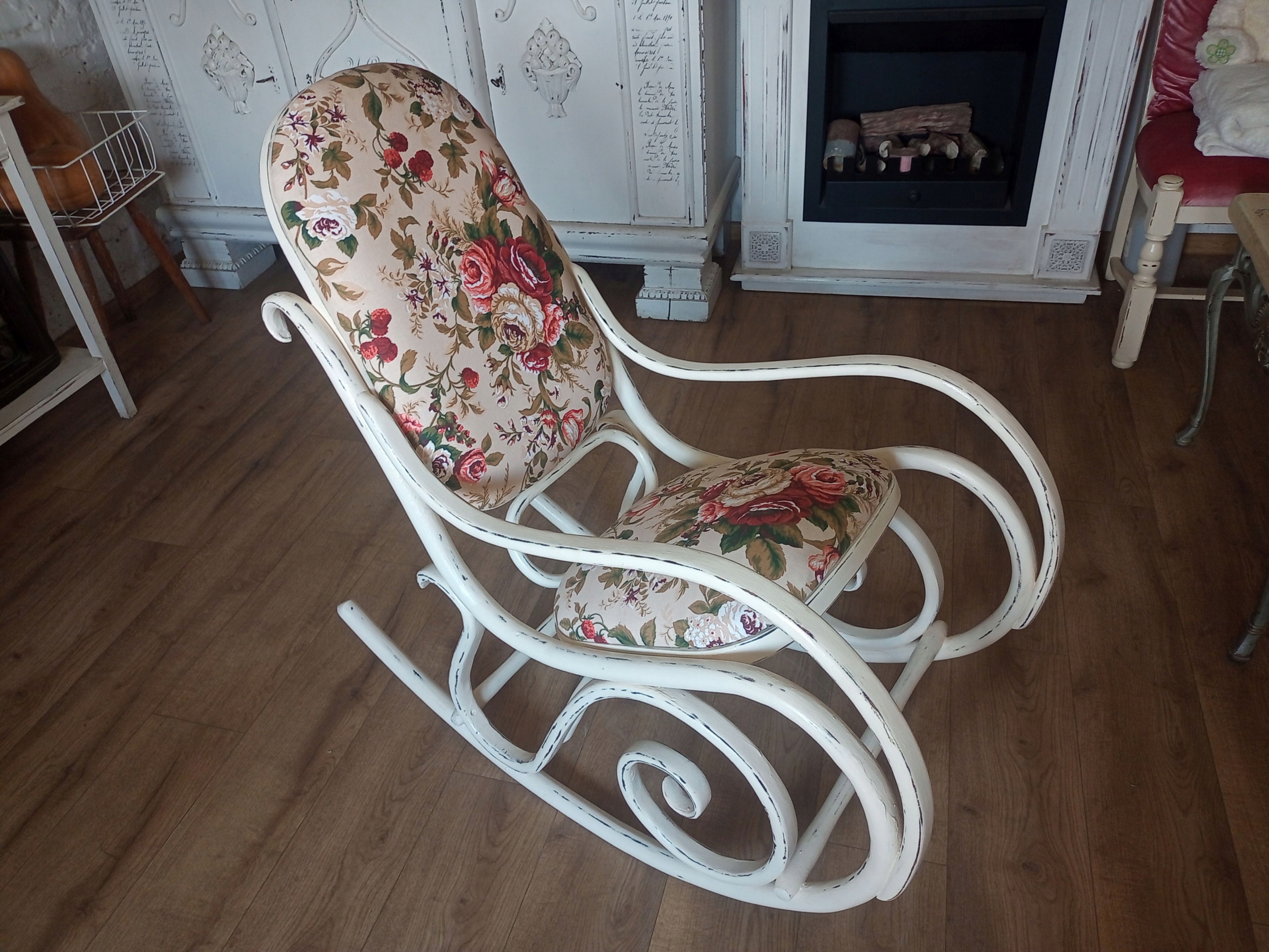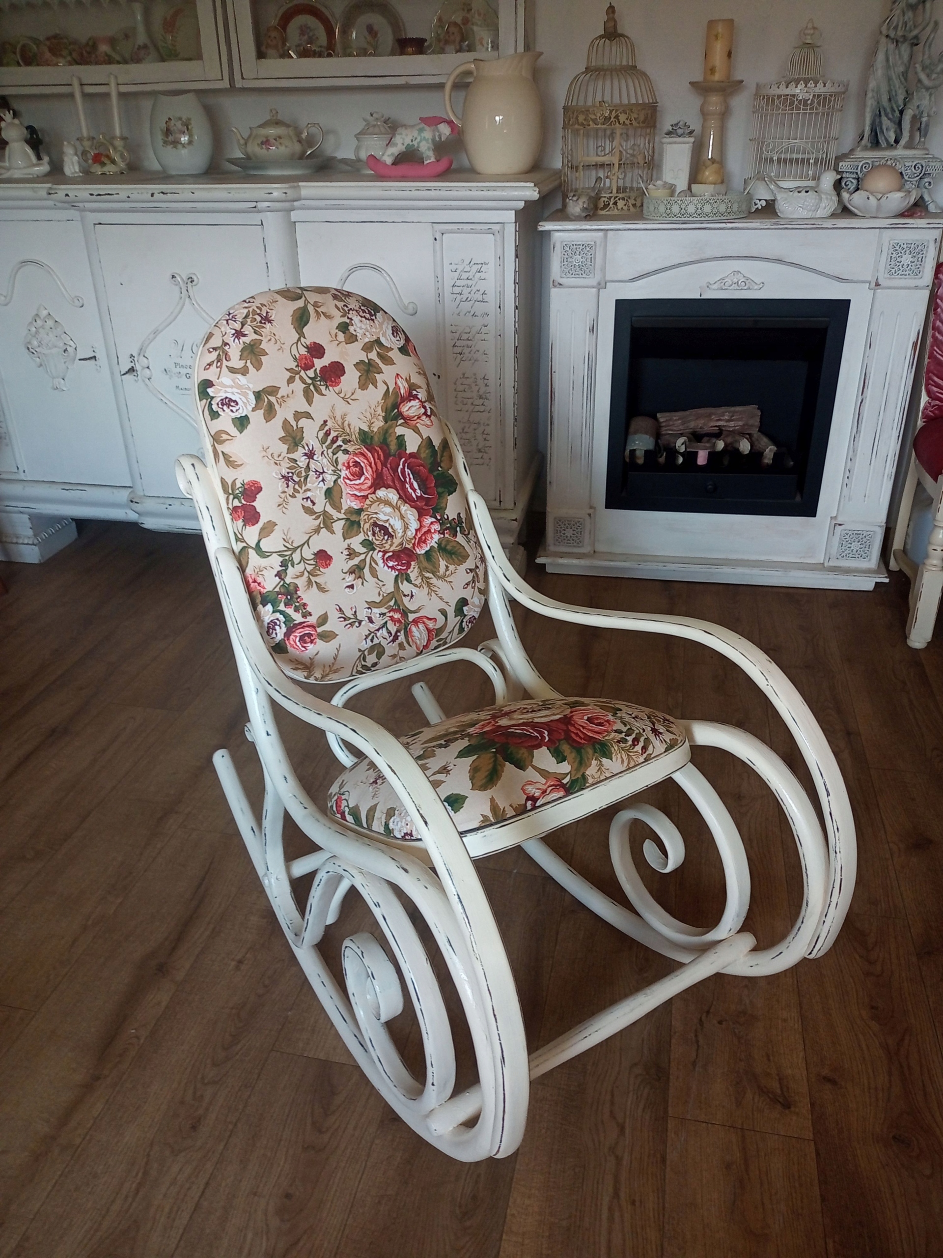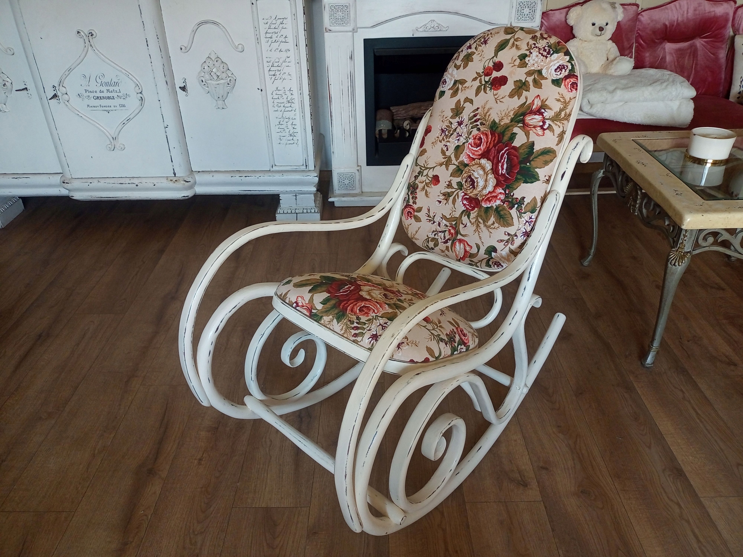 Деревянное окрашенное обитое кресло -качалка после ремонта