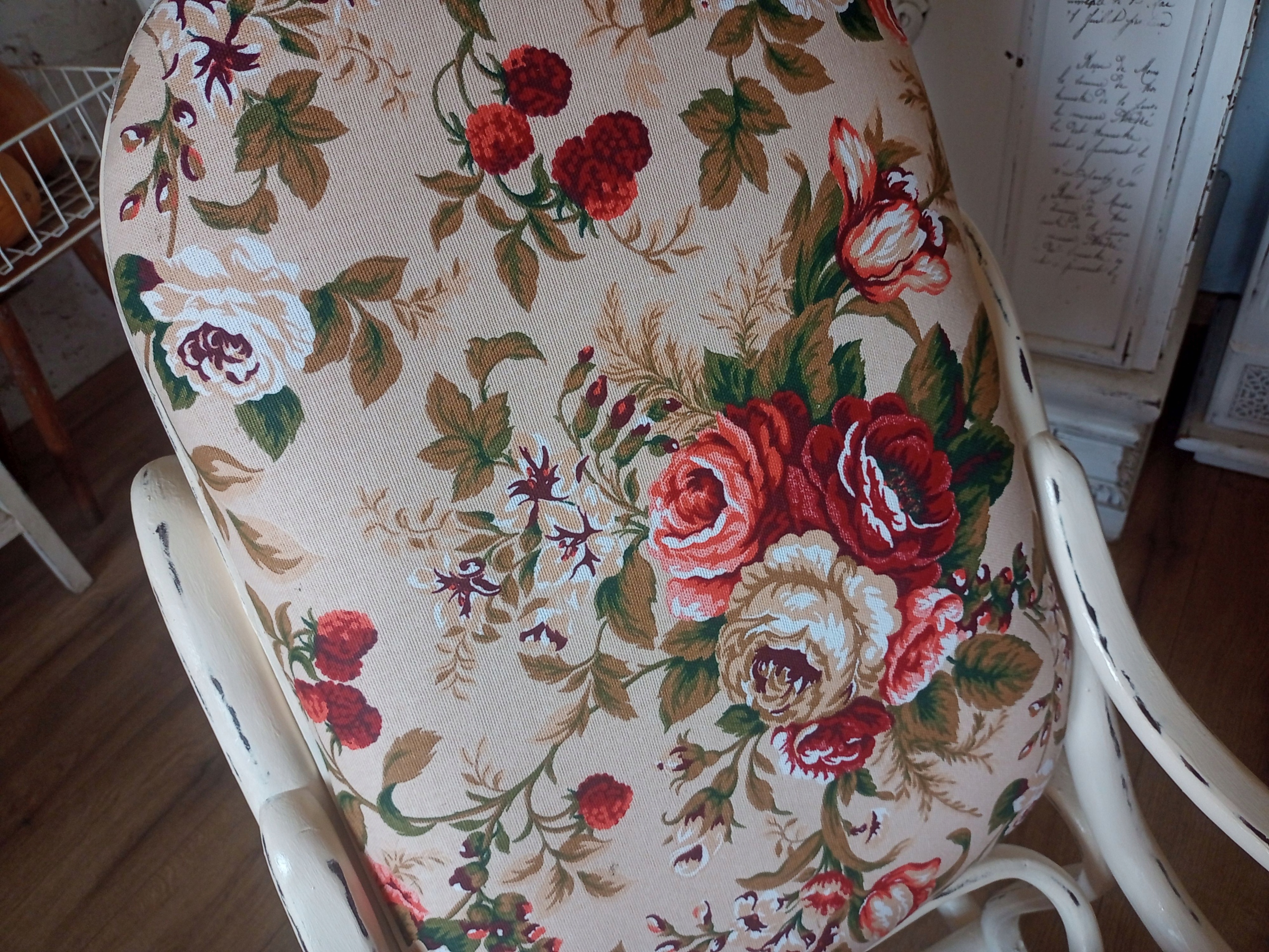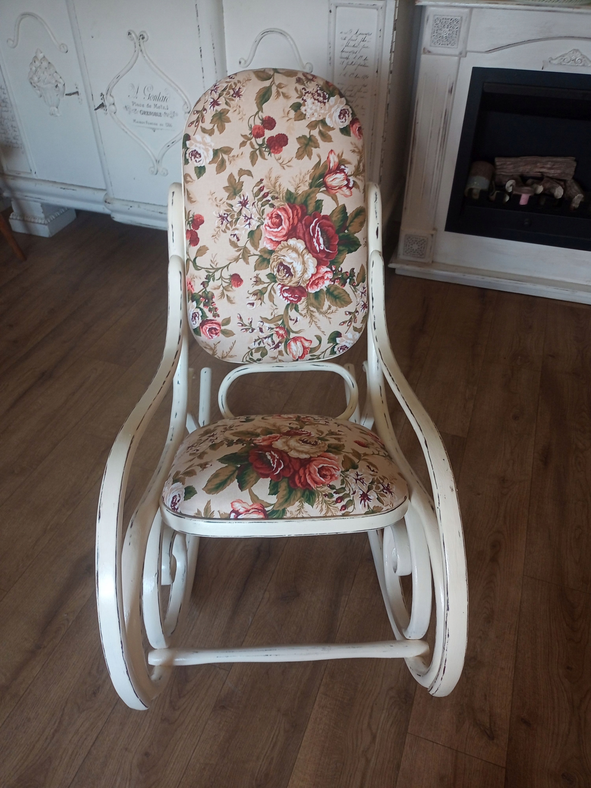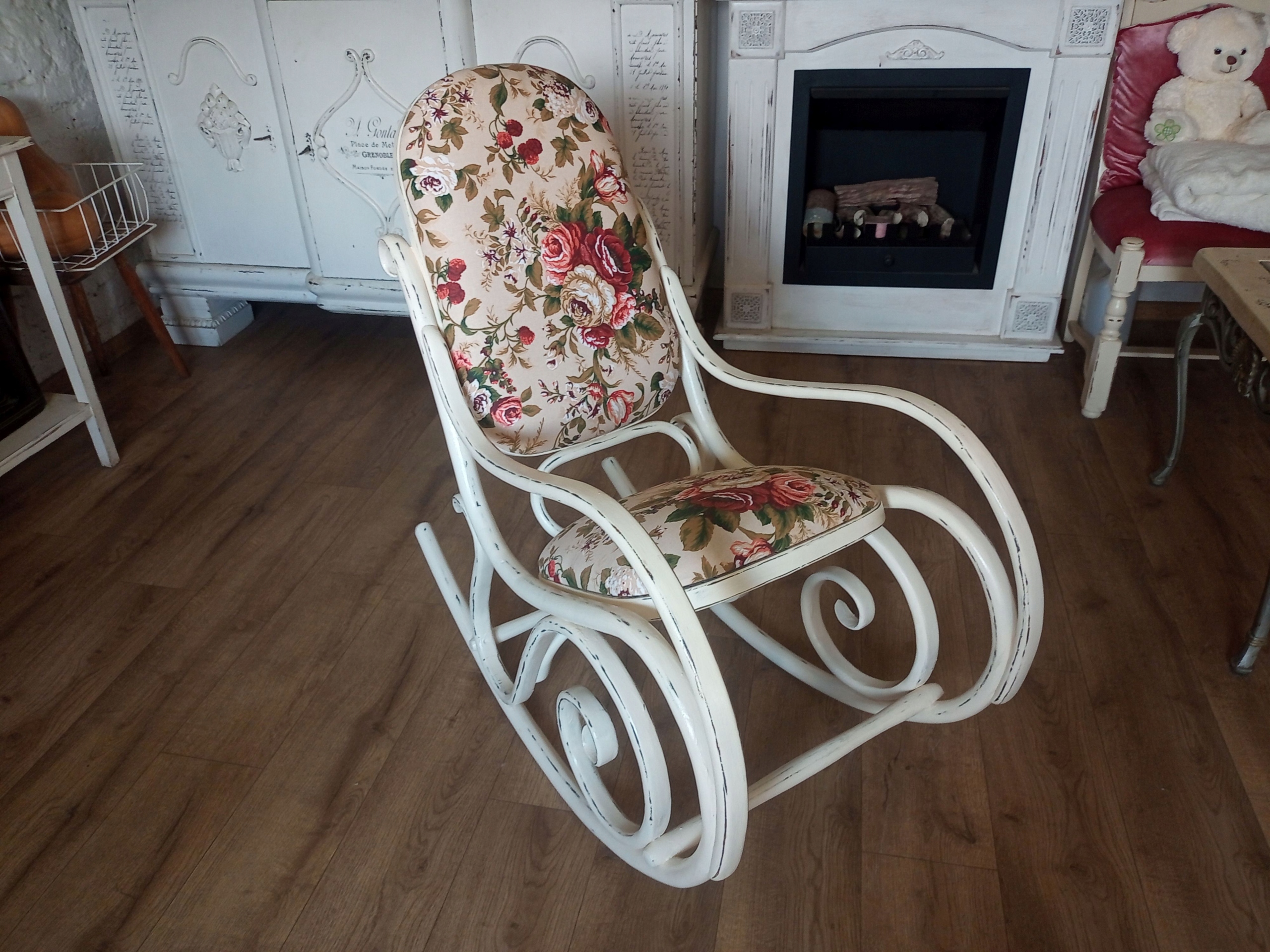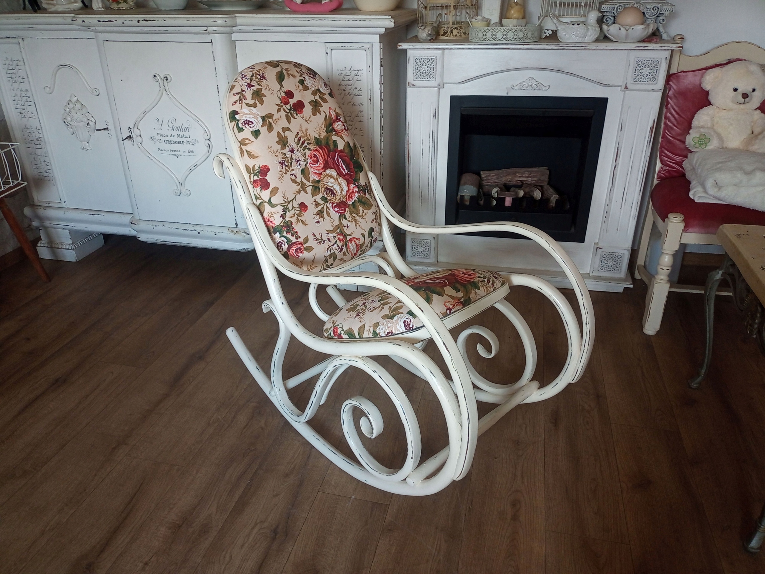 Деревянное окрашенное обитое кресло -качалка после ремонта