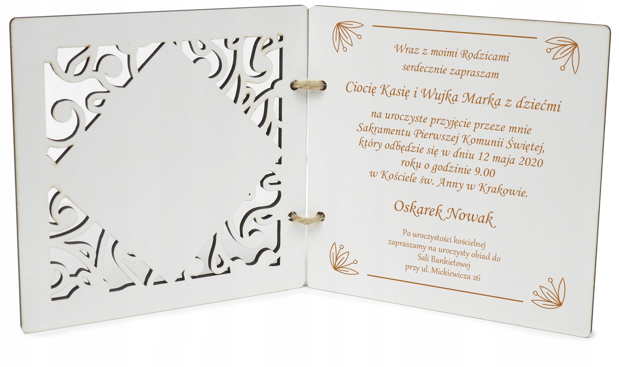На следующем аукционе мы представляем Вам «Приглашение к Первому Причастию» в виде деревянной открытки. Открытка вынута из экологического конверта, и такая форма приглашения заставит будущих гостей почувствовать себя особенными. Экологичные материалы и красивый гравированный мотив придают атмосферу и характер этим приглашениям на Первое Причастие.