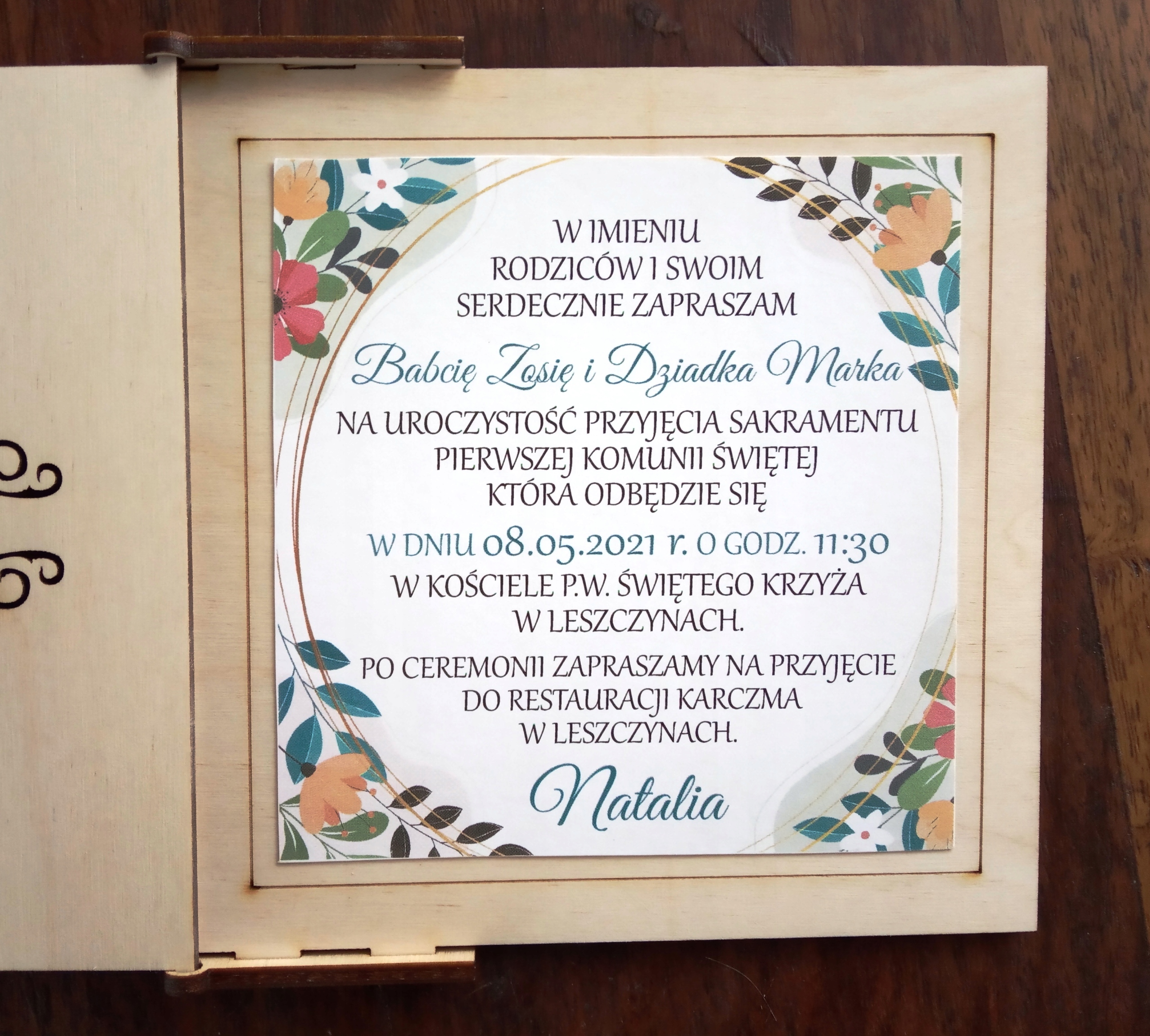 Дерев'яне запрошення на Перше Причастя, гравіювання