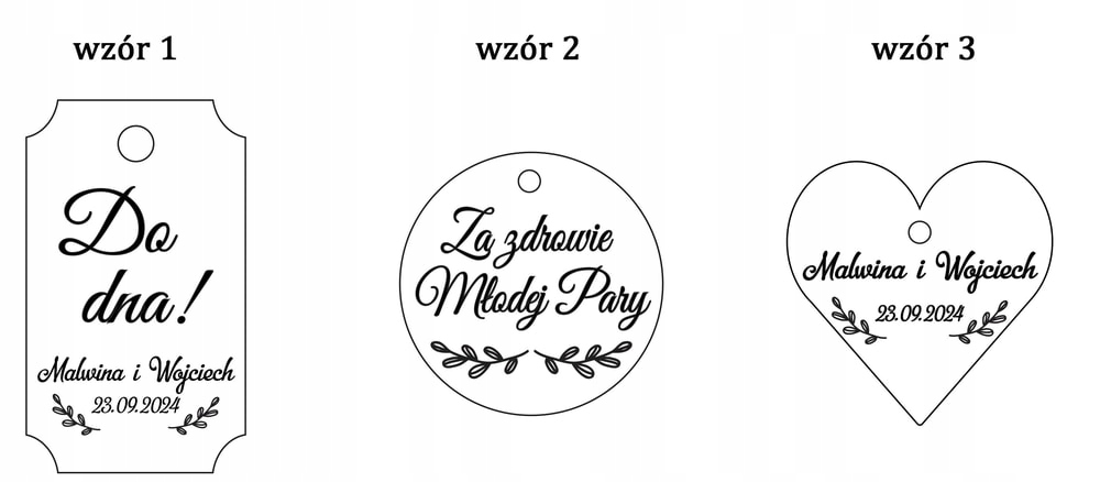 Если вы не предоставляете данные для персонализация, по умолчанию присылаются подвески: узор 1, текст: За здоровье жениха и невесты, джутовая веревка.