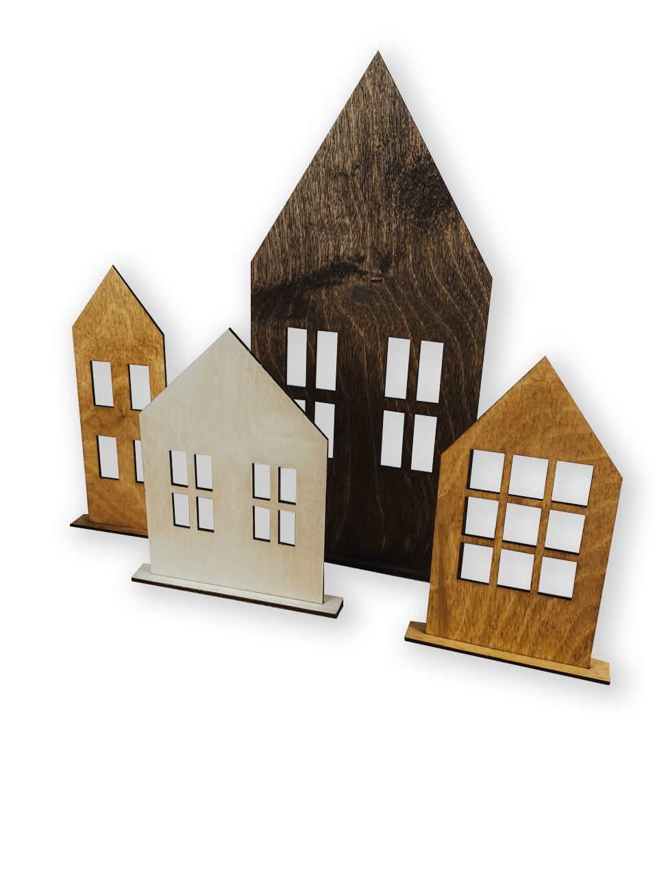 Деревянные домики изготовлены из фанеры толщиной 3 мм и окрашены вручную оригинальным маслом для дерева в цвета палисандра, дуба и натуральной сосны. Цвет и фактура древесины могут незначительно отличаться от того, что мы видим на фотографиях.