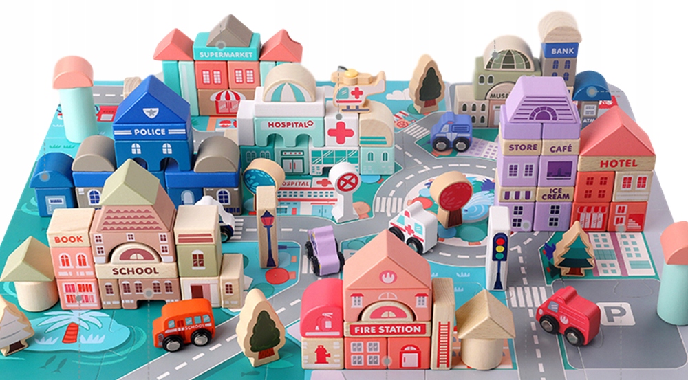 ДЕРЕВЯННЫЕ СТРОИТЕЛЬНЫЕ БЛОКИ НАБОР ДОРОГА ГОРОД 115 ЭЛЕМЕНТОВ