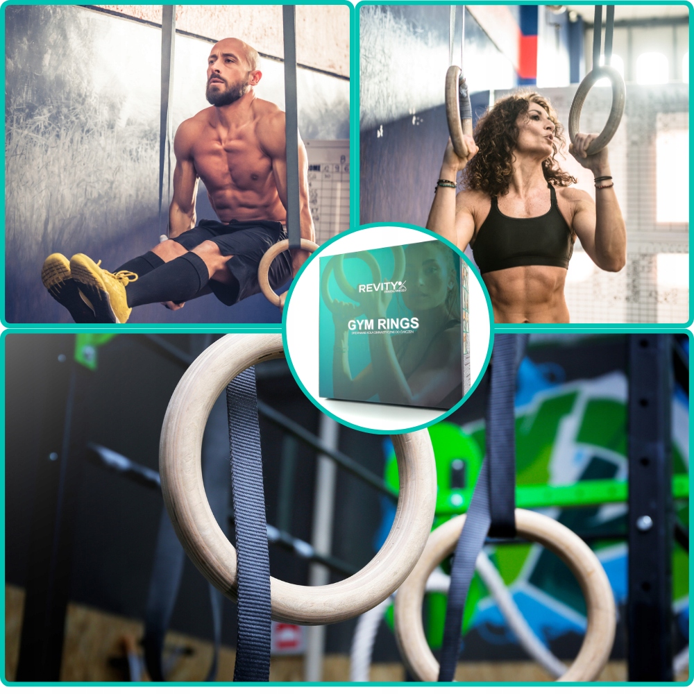 GYM RINGS от REVITY — это гимнастические кольца, изготовленные из материалов высочайшего качества: ремней с очень высокой несущей способностью, стальных пряжек с порошковым покрытием и деревянных кольца. Мы решили сделать ремни немного шире, чем у других моделей, доступных на рынке (38 мм), и немного толще, чтобы обеспечить лучшее сцепление и распределение нагрузки. Набор полный и включает в себя: 2 деревянных колеса, 2 ремня для переноски с пряжками и рулеткой, 2 накладки на колеса (для улучшения сцепления) и сумку для хранения.