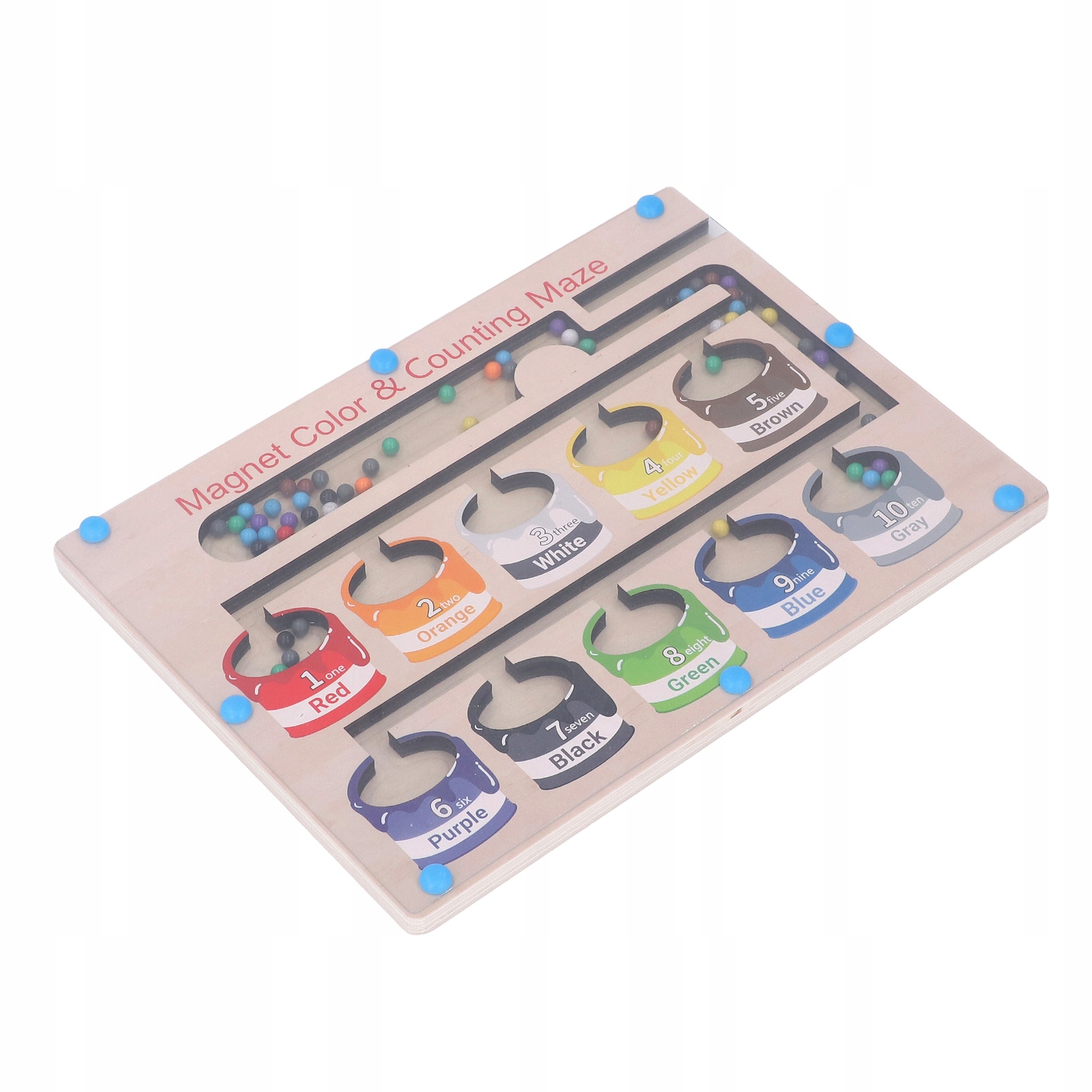 5. Введение в использование: имеется 10 корзин разного цвета и 65 маленьких мячей. Каждая красочная корзина отмечена своим номером. Дети должны использовать прилагаемую магнитную палочку, чтобы притягивать и перемещать магнитные шарики под прозрачной панелью, а затем поместить их в нужную корзину, чтобы завершить игру-лабиринт.