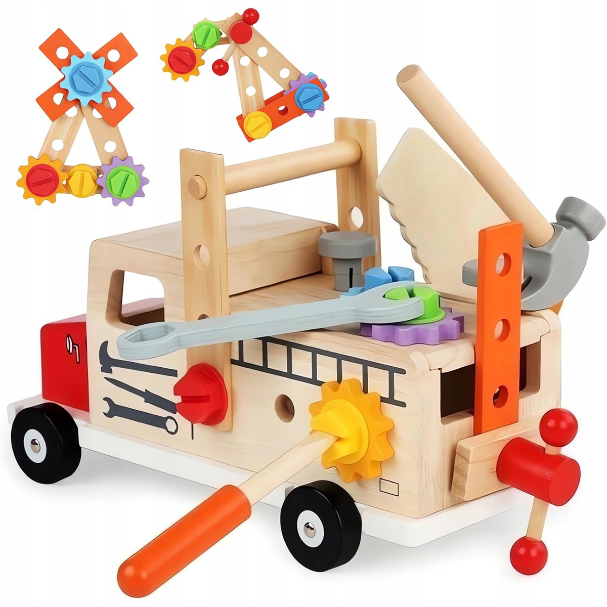 Обучающий ящик для инструментов можно использовать в качестве детского верстака, игрушечного грузовика, крана, ящика для хранения и чемодана для транспортировки. Когда крышка закрыта, деревянный ящик для инструментов в форме грузовика превращается в детский верстак. После прикрепления ручки он трансформируется в транспортировочный кейс, а верхнюю вращающуюся ручку можно использовать как кран. Он также поощряет детей изучать архитектуру.