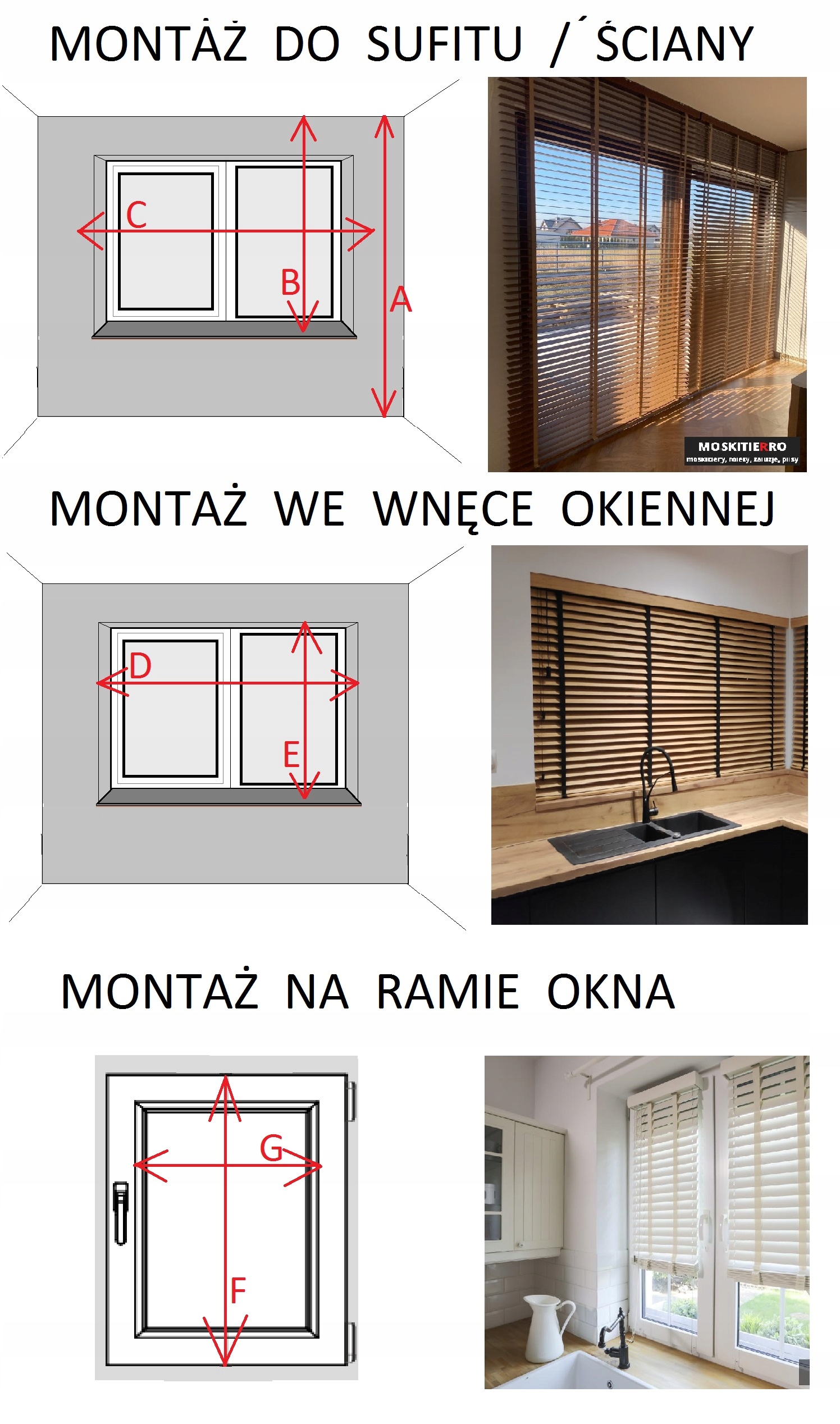 При заказе уточняйте высоту всей оконной створки F и общую ширину жалюзи G (ширина стекла вместе со штапиком).