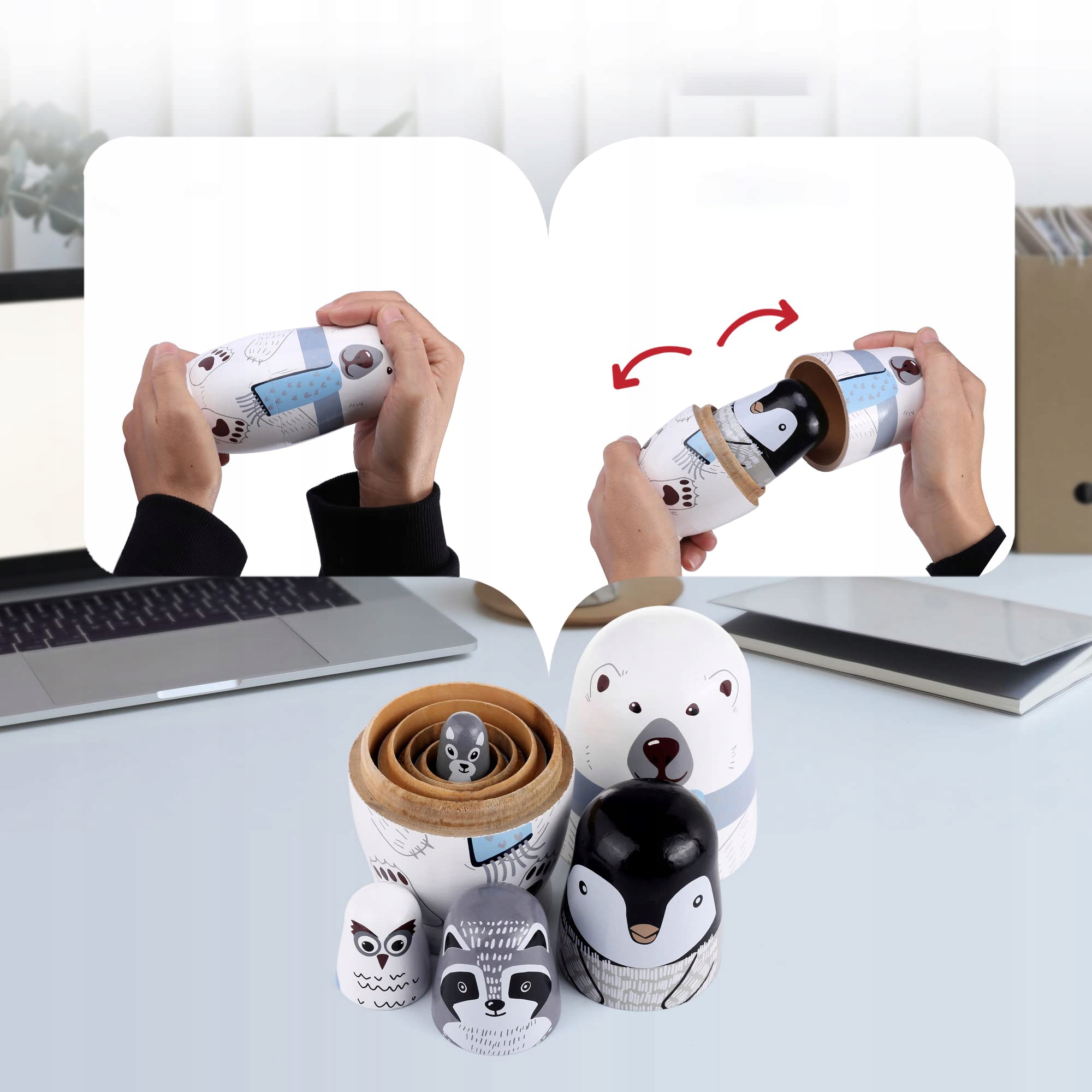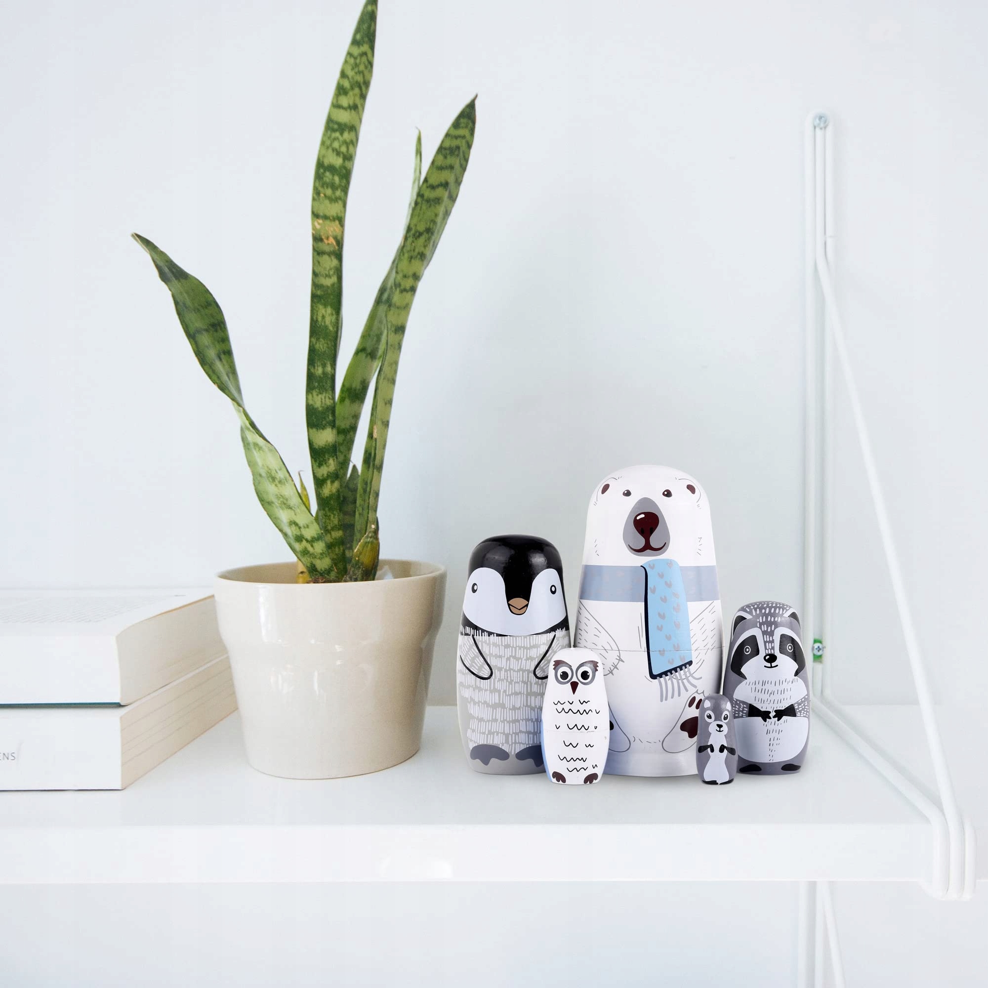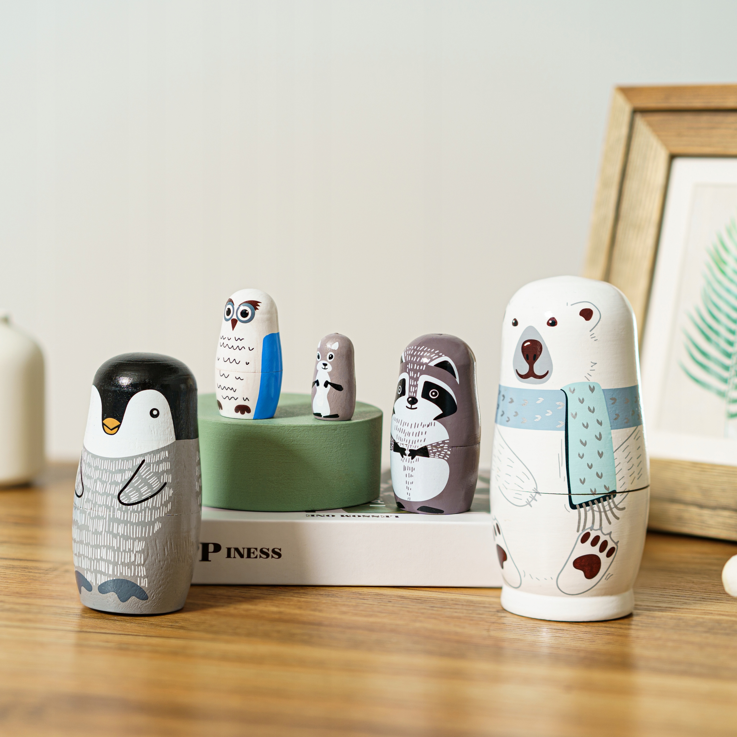 【Милый мультяшный внешний вид】 Матрешка содержит 5 животных разного размера, в том числе белого медведя, пингвина, сову, крота, енота. Они помещены один в другой и выглядят одинаково.