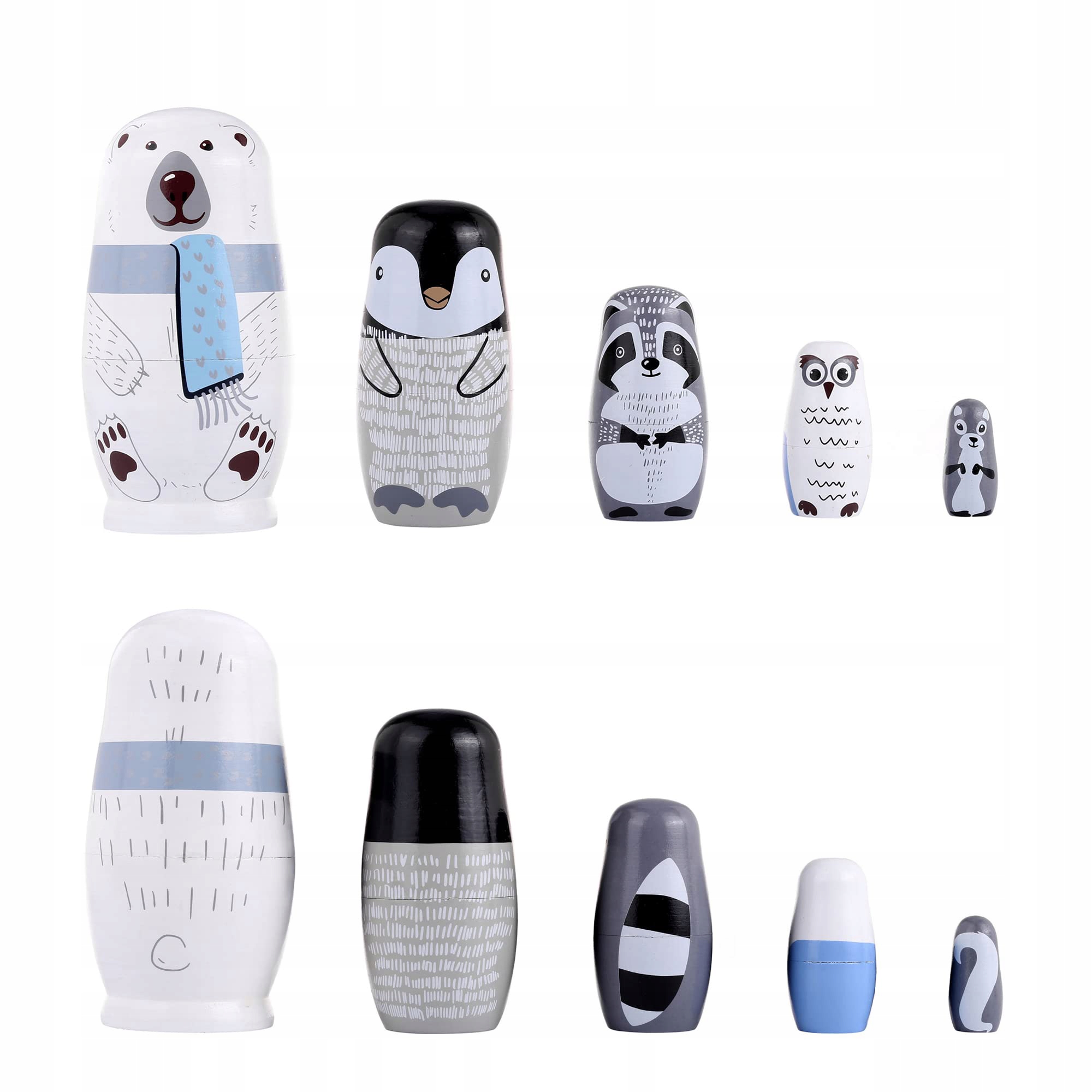 【Милый мультяшный внешний вид】 Матрешка содержит 5 животных разных размеров, в том числе белого медведя, пингвина, сову, крота и енота. Они помещаются одна в большую и выглядят едиными.