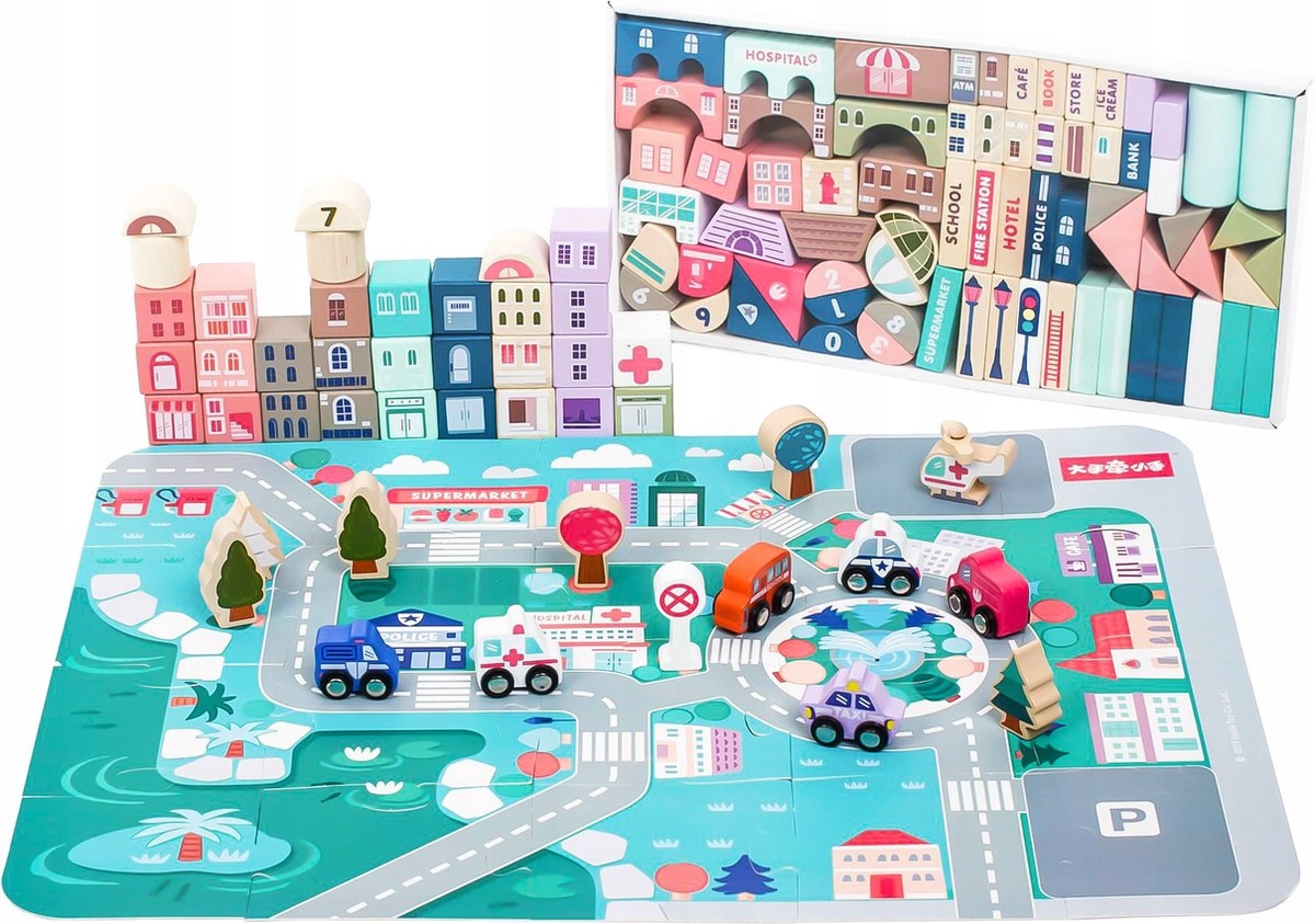 Дерев'яні навчальні блоки EcoToys Місто з килимком 115 елементів