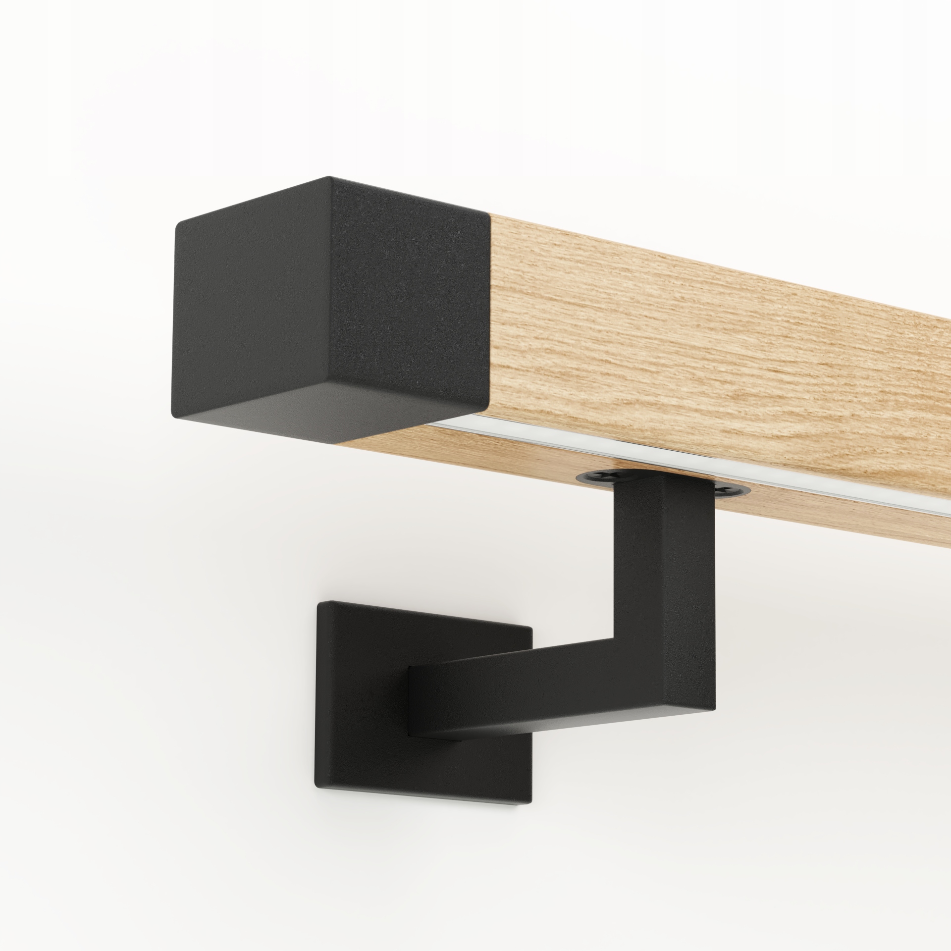 Предмет предложения представляет собой настенный перила из мореного дерева с металлическими наконечниками и встроенным линейным светодиодным осветителем.