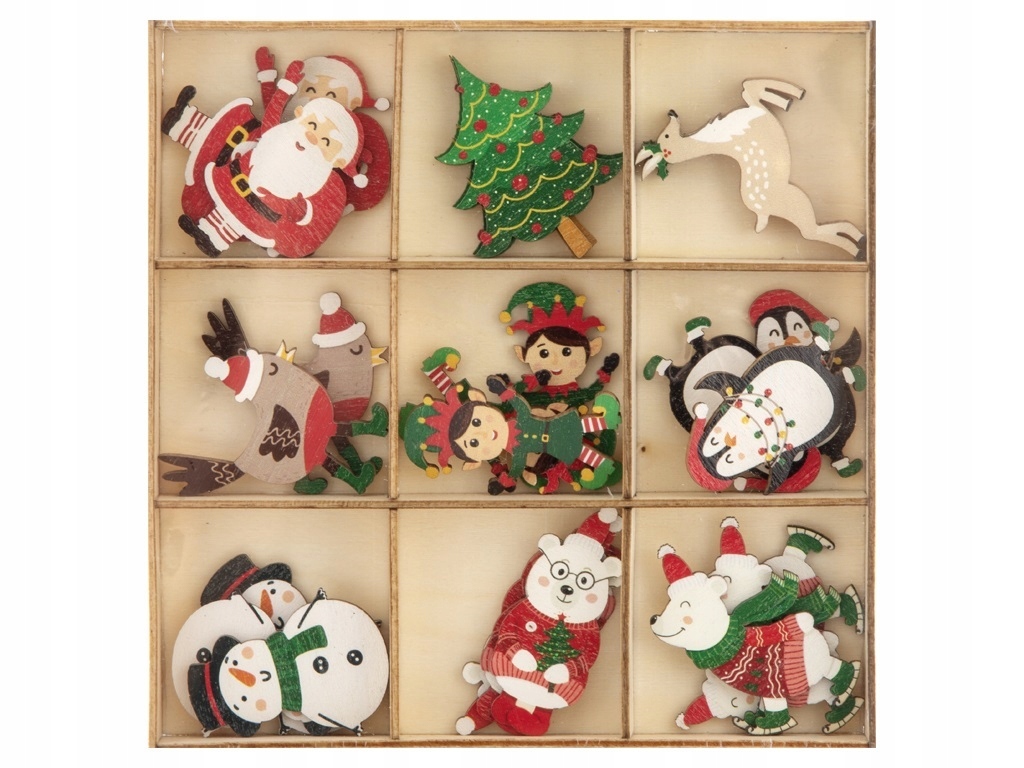 - 27 штук ДЕРЕВЯННЫХ НОВОГОДНИХ УКРАШЕНИЙ, размеры: 4,2 - 6,1 см.