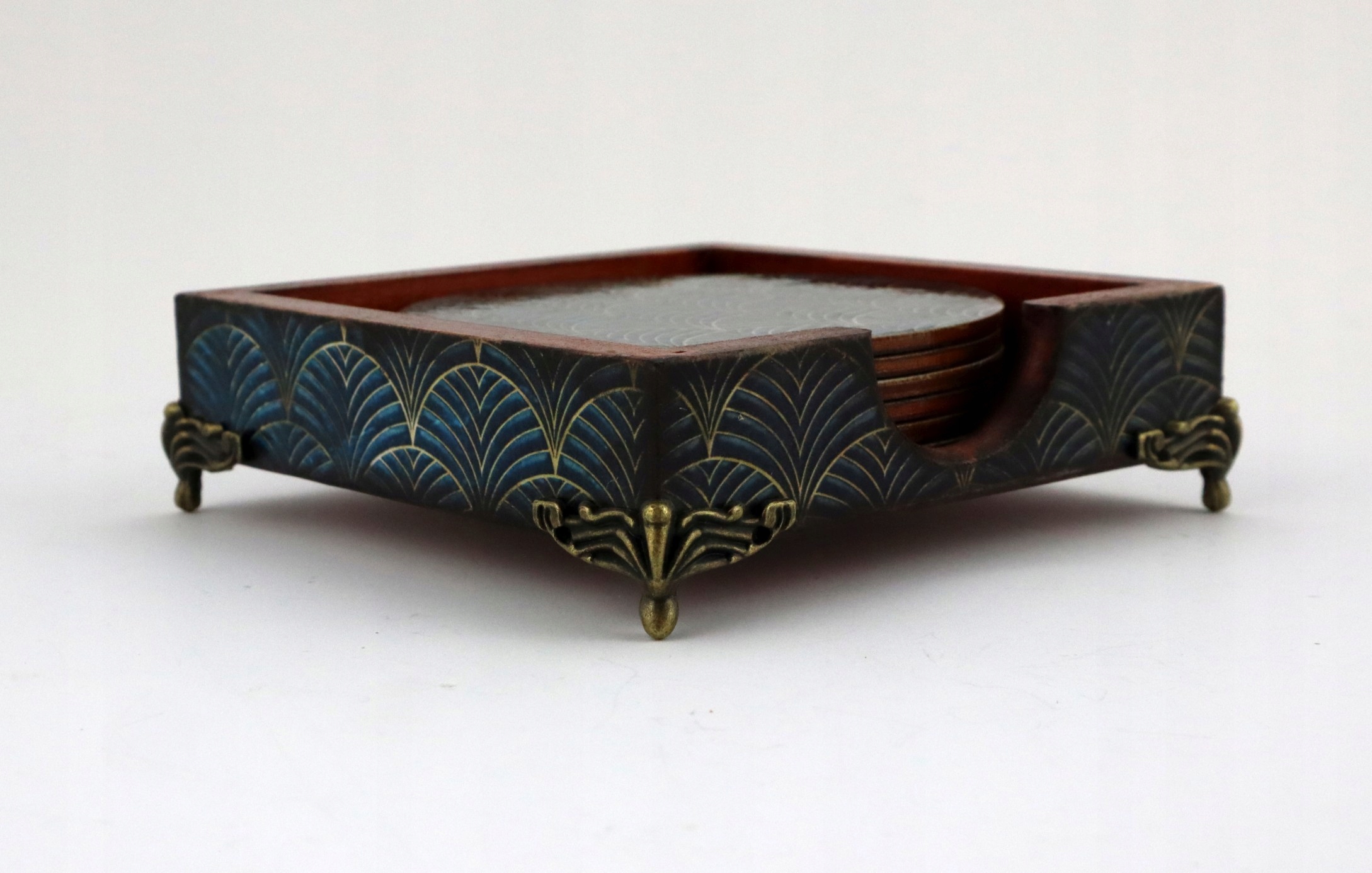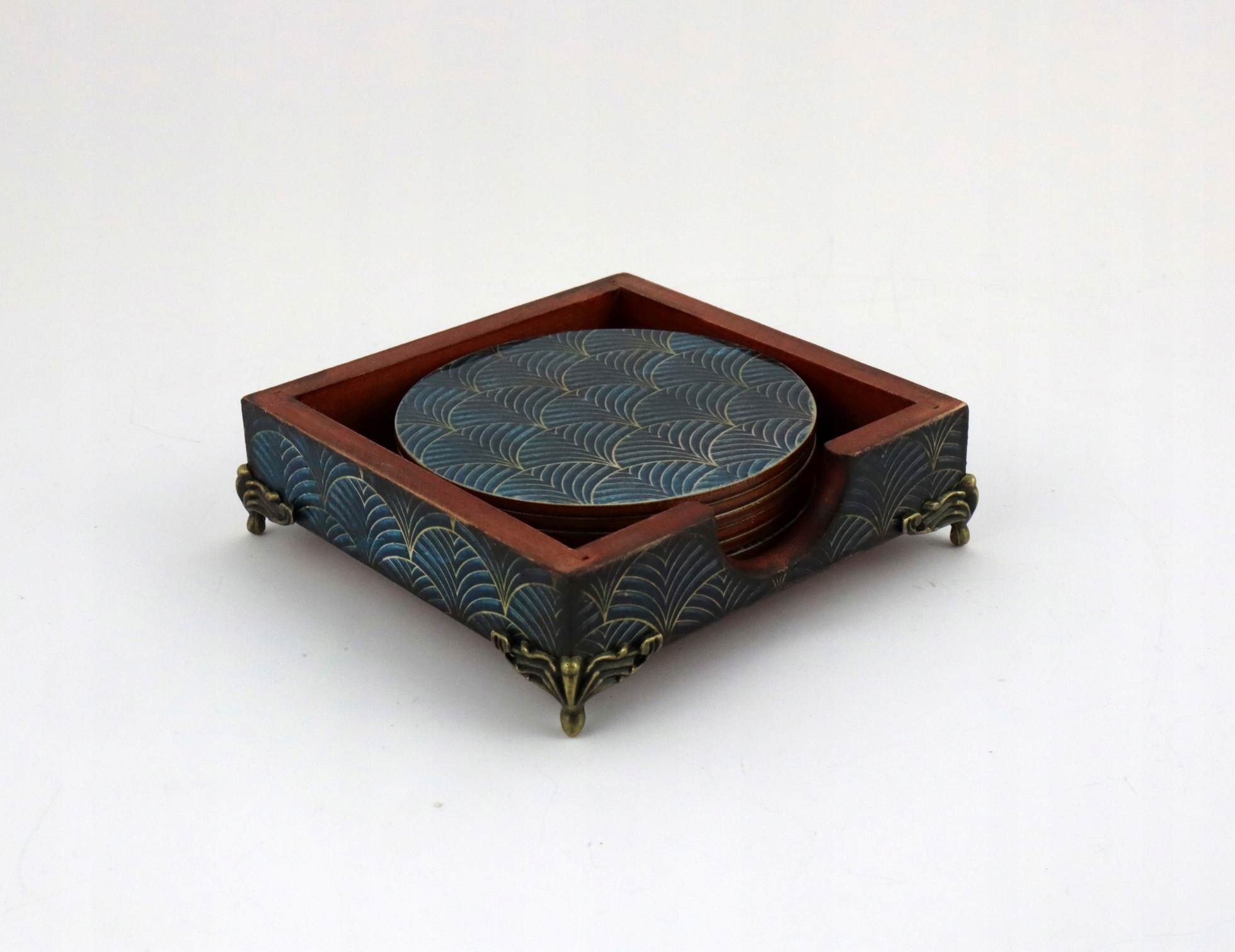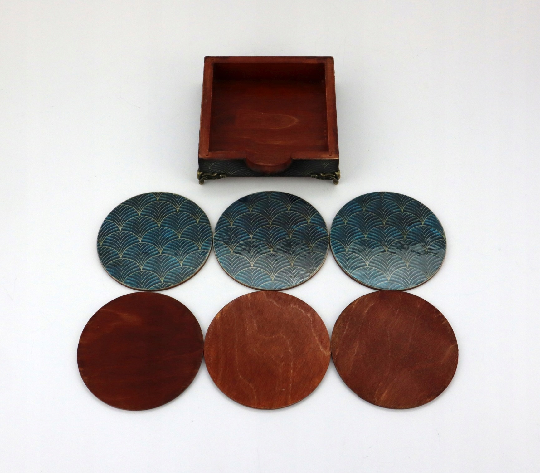 Откройте для себя уникальный набор из деревянных подушек (6 шт.) В комплекте с элегантной коробкой, которая будет идеальной в качестве оформления таблицы и практического дополнения к внутреннему . Их поверхность украшена тонким, золотым рисунком фанкеров на фоне темного темно -синего и зелени, сделанной на рисовой бумаге , что придает им роскошный вид.