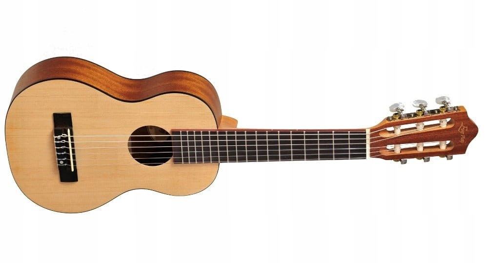 guitalle или Guitarlele - это комбинация классической гитары размером 1/4 с гавайской гитарой. Инструмент с очень маленьким корпусом, легко портативным. Оснащен 6 нейлоновыми струнами с характерным звуком