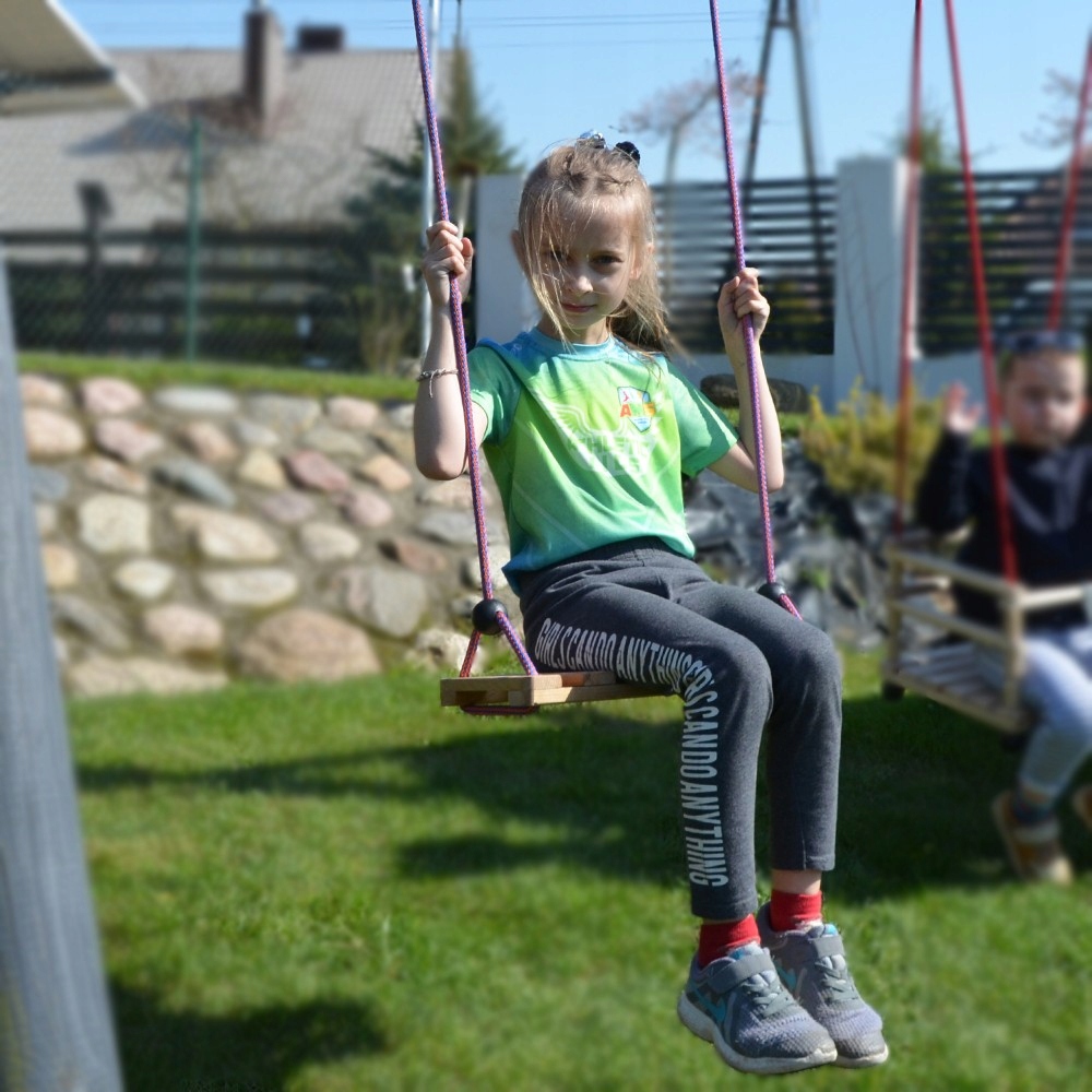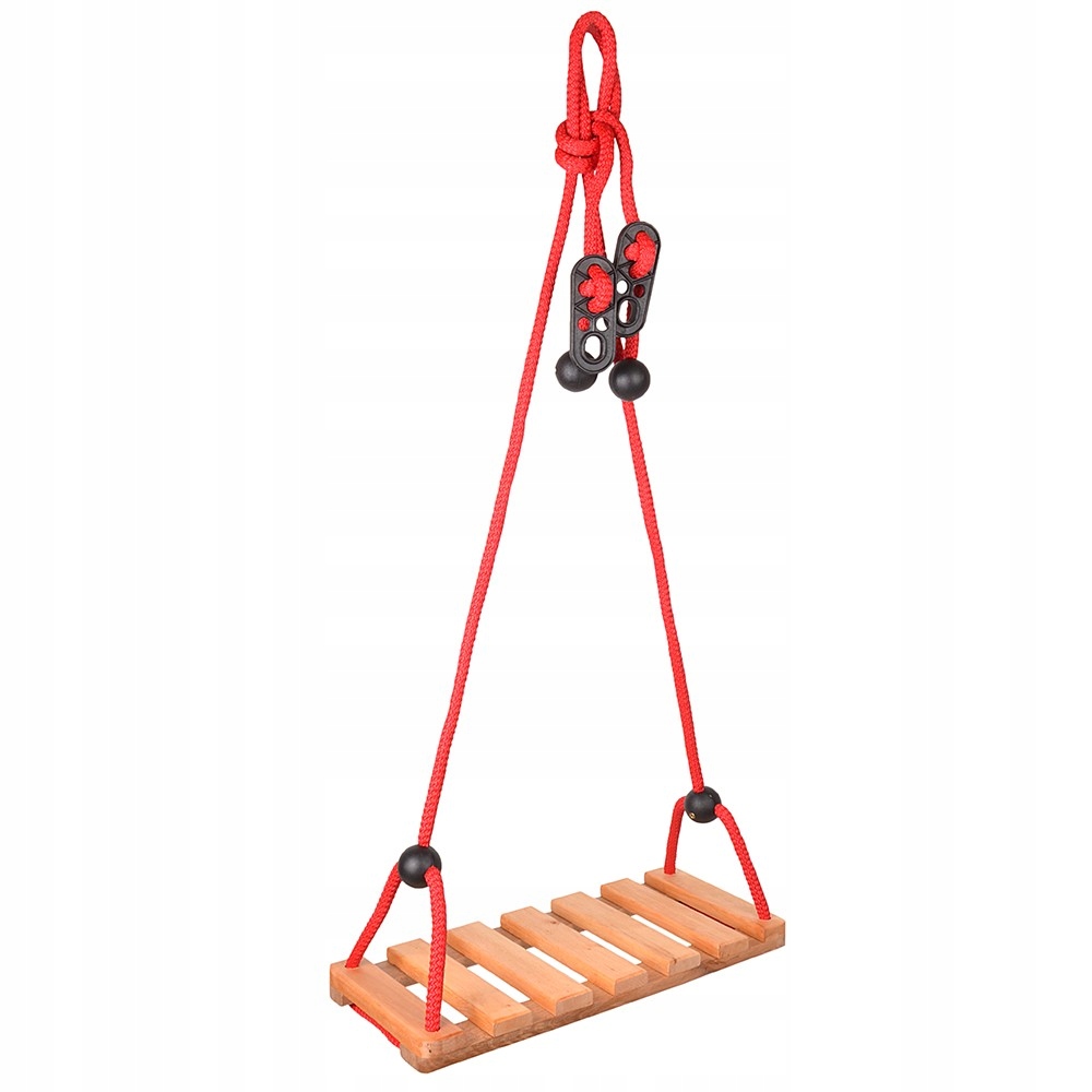 Качели изготовлены из сертифицированных материалов, обеспечивающих безопасность при использовании. Он изготовлен из массива бука, что придает ему неповторимый деревенский вид и значительно увеличивает долговечность изделия. Лески толщиной 1 см оснащены очень прочными пластиковыми застежками, их длину можно легко регулировать в любой момент.