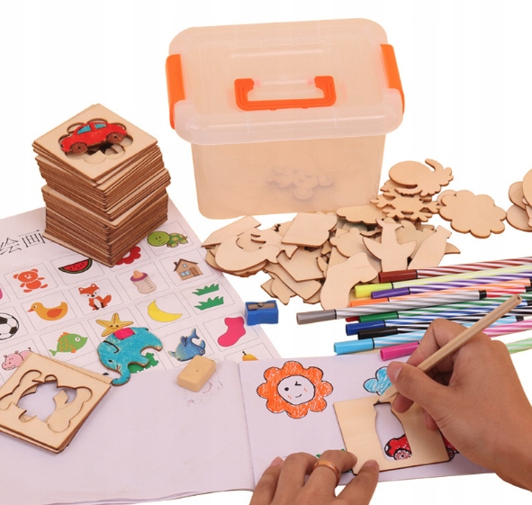 Отличное творческое развлечение для девочек и мальчиков. Деревянный набор содержит множество различных форм животных, зданий, автомобилей, человеческих фигурок и растений. В комплект также входит бумага с напечатанными на ней изображениями в качестве вдохновения. Дети смогут использовать свое воображение и креативность, научиться правильно держать карандаш, мелки или фломастеры, развивать воображение, концентрацию и координацию движений.