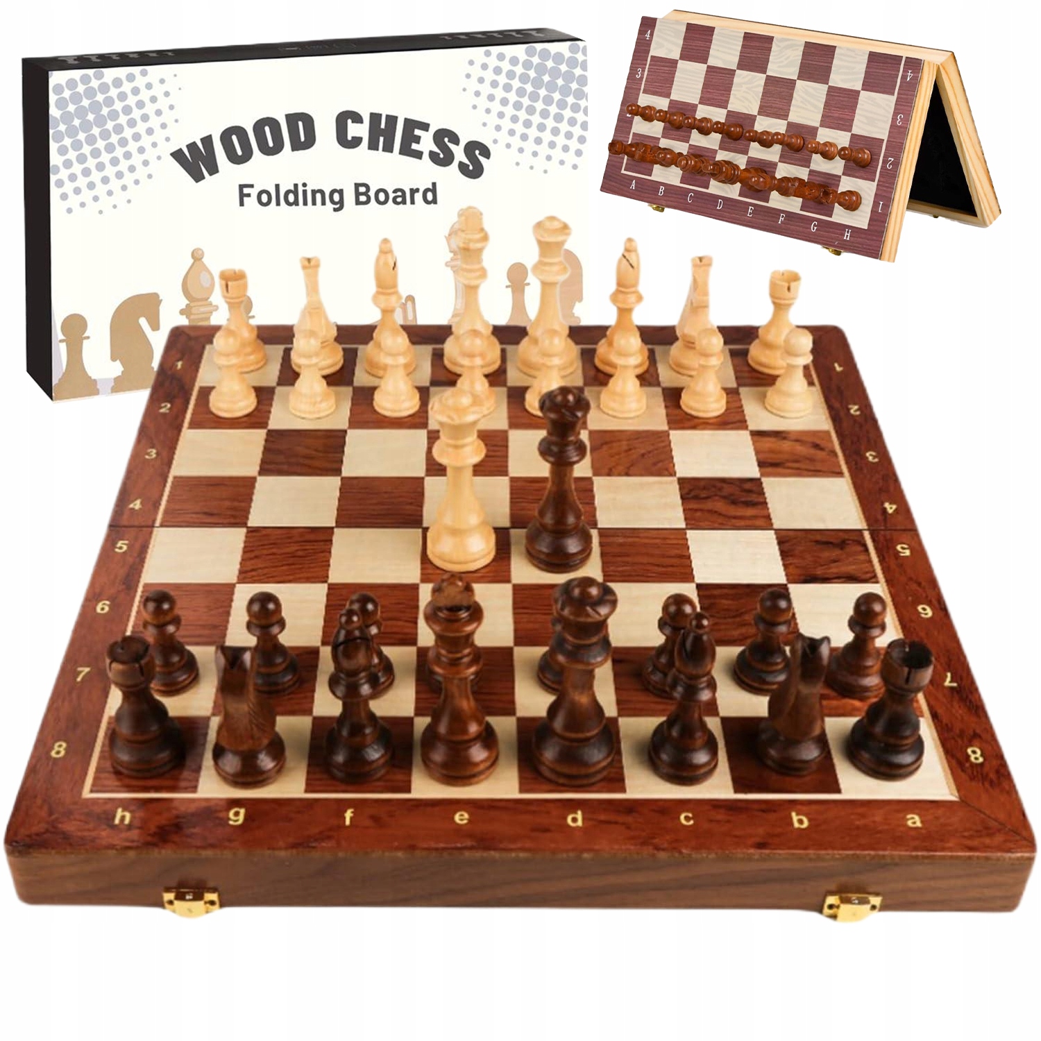 ♟-Соединения досок закреплены петлями, их можно складывать и шахматные фигуры надежно хранятся в ящике для хранения. Металлические защелки обеспечивают закрытие доски.
